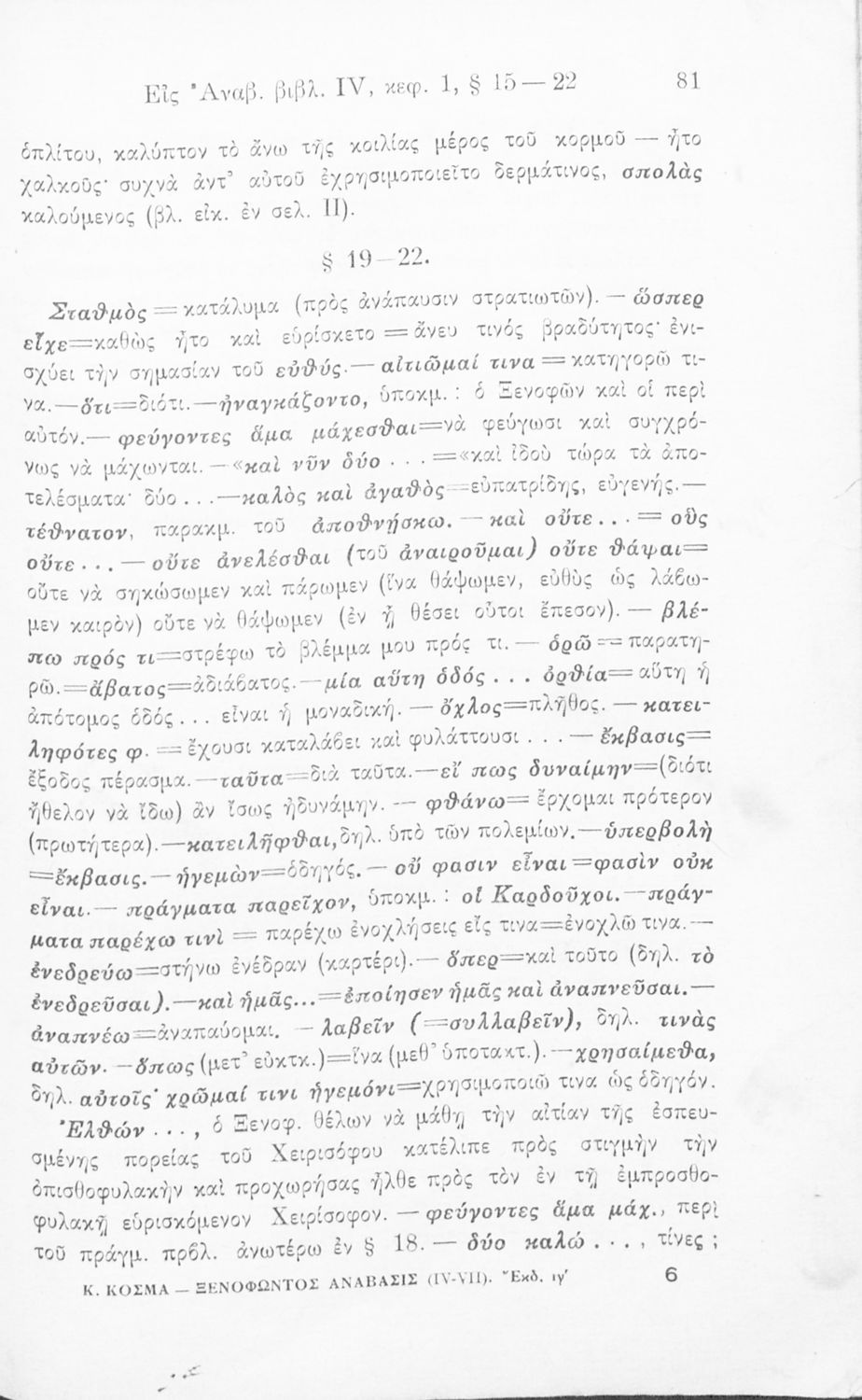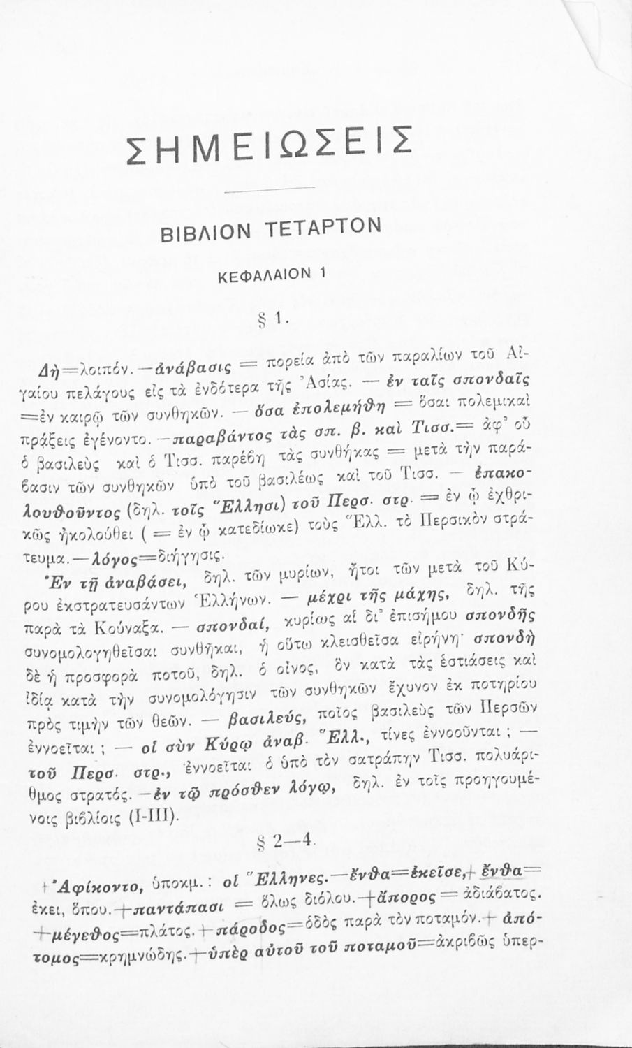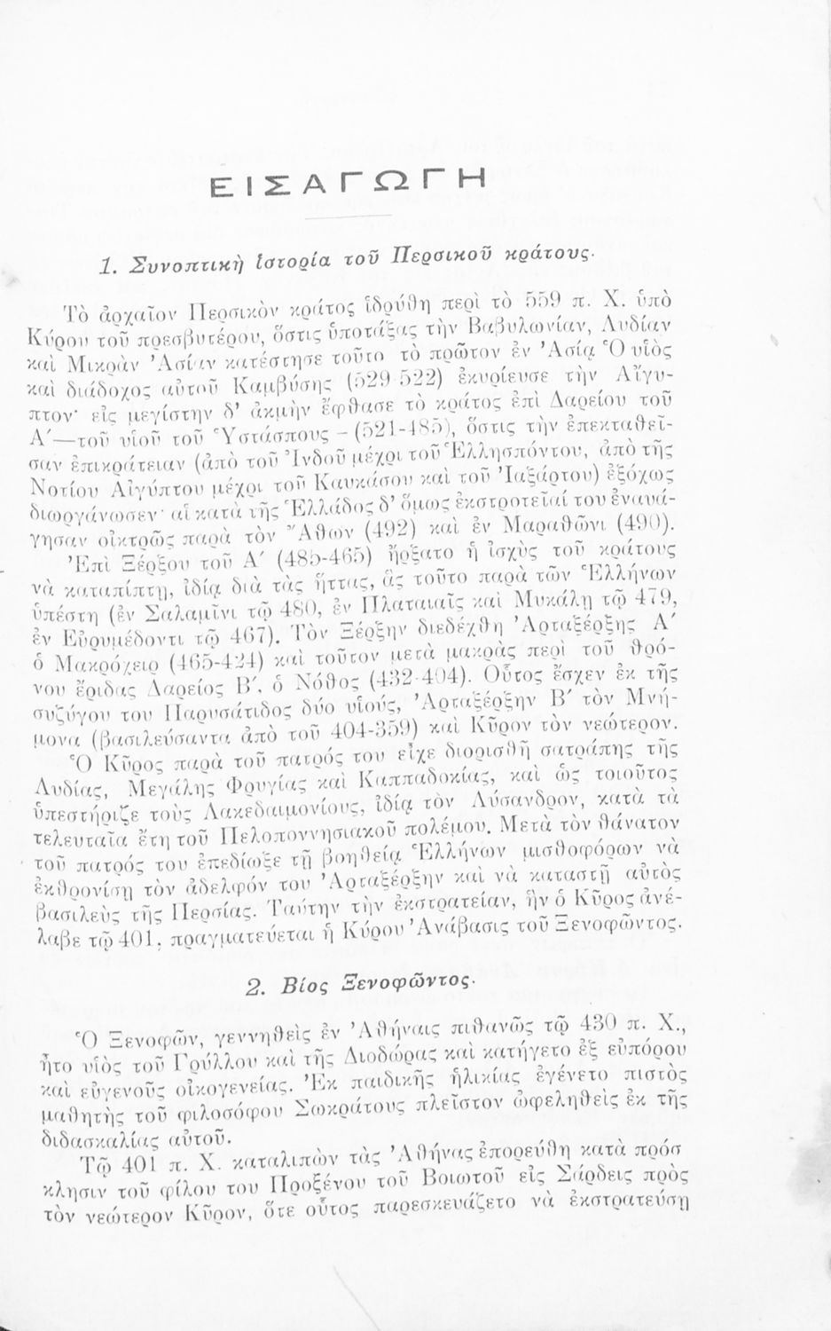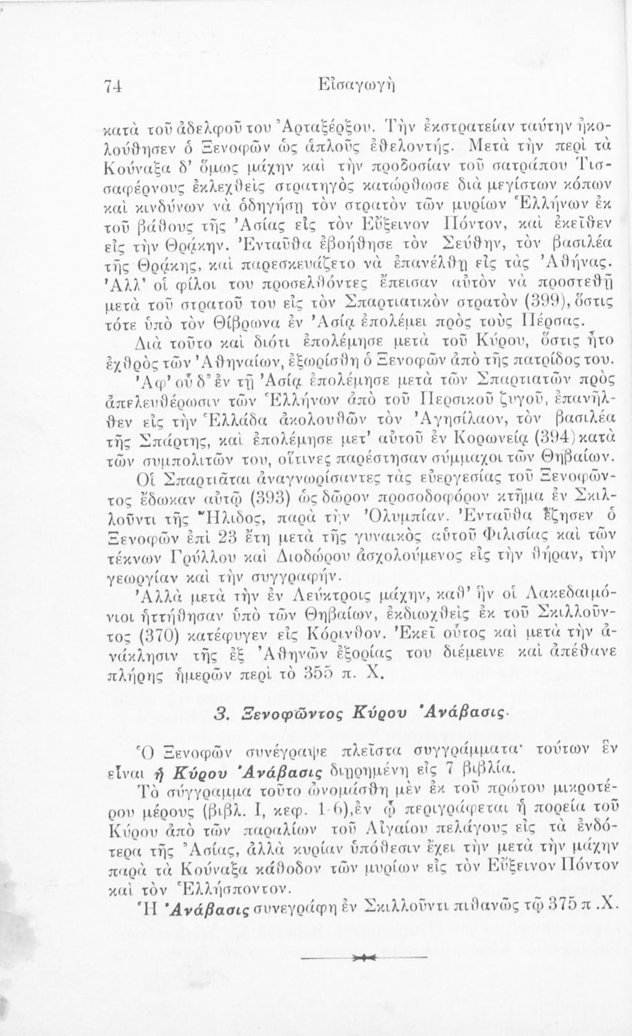 Σχολικό εγχειρίδιο Αρχαίων Ελληνικών για τις Γ΄ Ελληνικών Σχολείων και Α΄ Αστικών Σχολείων των Θηλέων που περιλαμβάνει το έργο του Ξενοφώντα Κύρου Ανάβασις, εισαγωγικά σχόλια για τη ζωή και το έργο του, ερμηνευτικές και γραμματικές παρατηρήσεις.