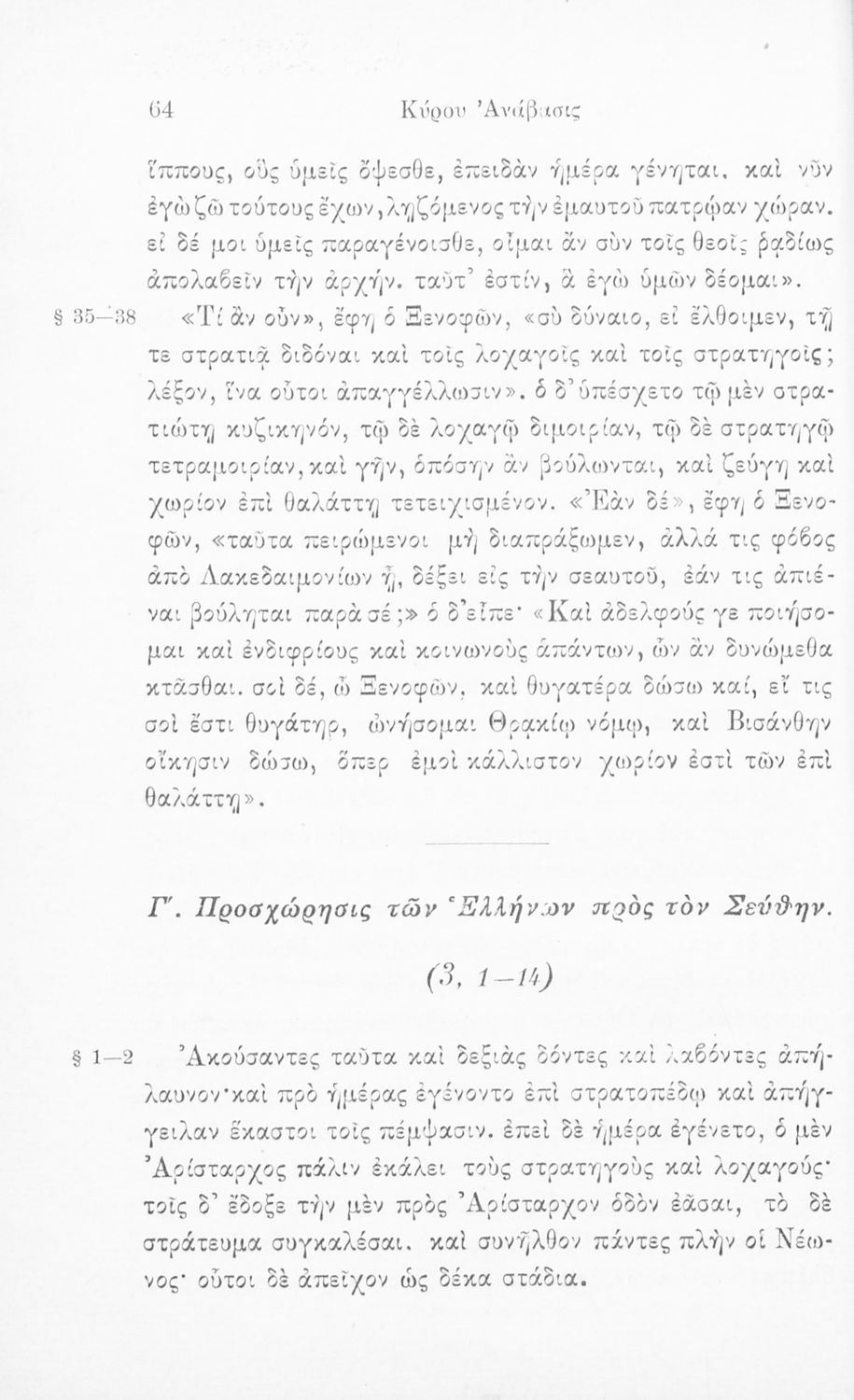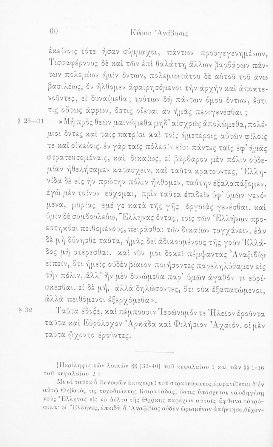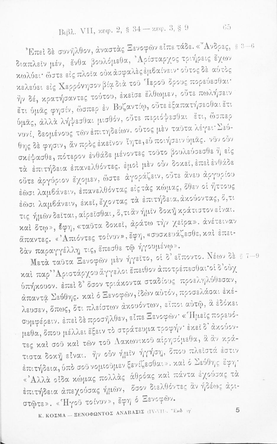 Σχολικό εγχειρίδιο Αρχαίων Ελληνικών για τις Γ΄ Ελληνικών Σχολείων και Α΄ Αστικών Σχολείων των Θηλέων που περιλαμβάνει το έργο του Ξενοφώντα Κύρου Ανάβασις, εισαγωγικά σχόλια για τη ζωή και το έργο του, ερμηνευτικές και γραμματικές παρατηρήσεις.