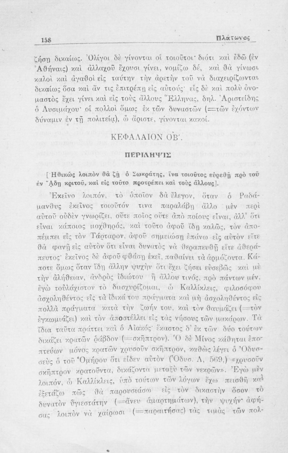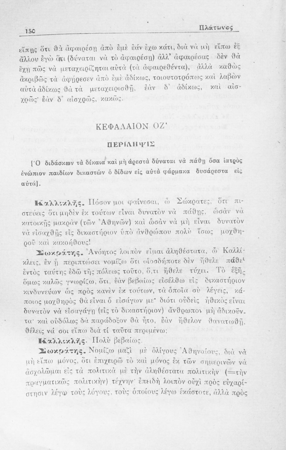 Σχολικό εγχειρίδιο Αρχαίων Ελληνικών της Ε΄ Γυμνασίου που περιέχει σύντομη εισαγωγή στη ζωή και το έργο του Πλάτωνα και του Σωκράτη, κείμενο και ερμηνευτικές και πραγματολογικές σημειώσεις.