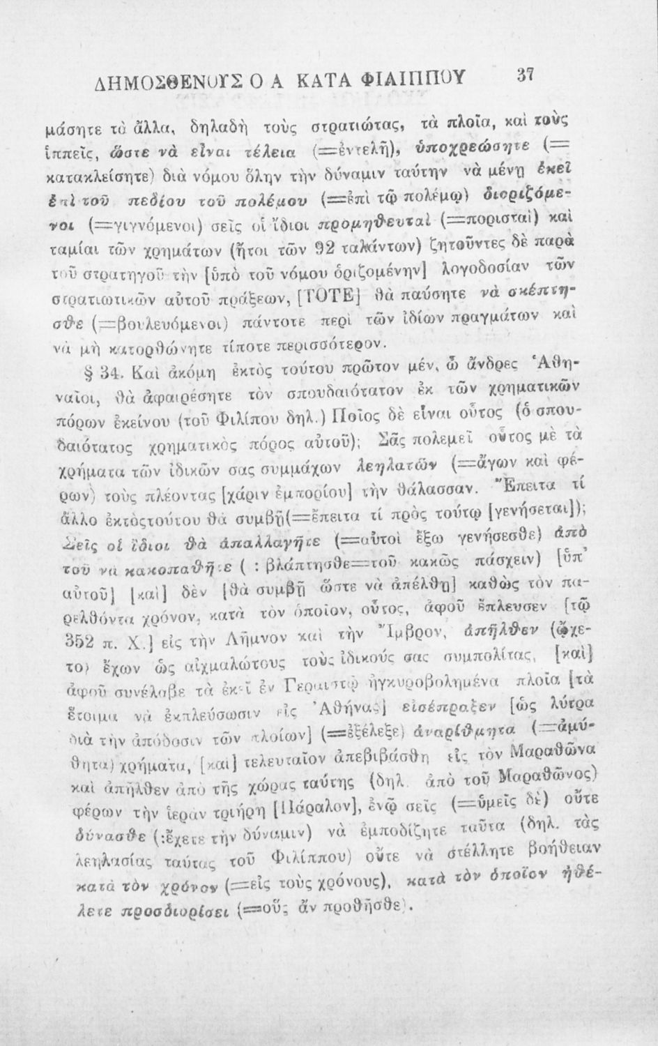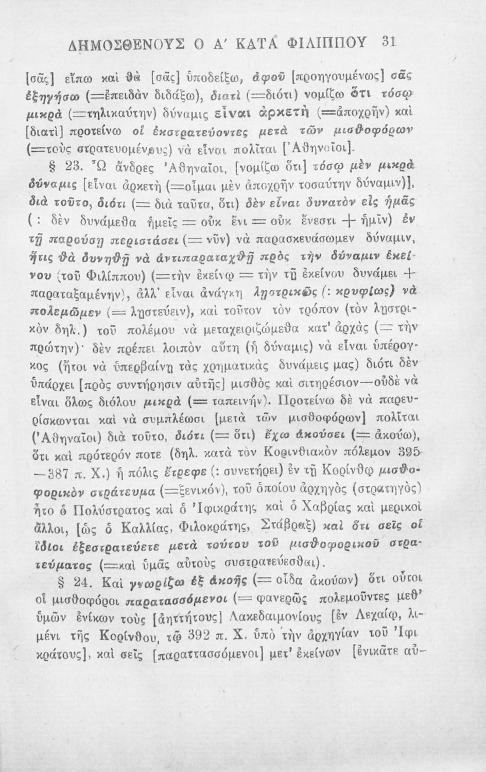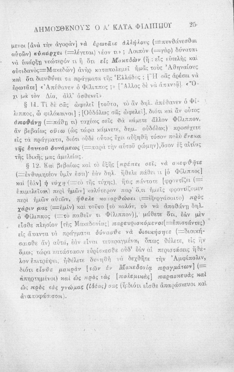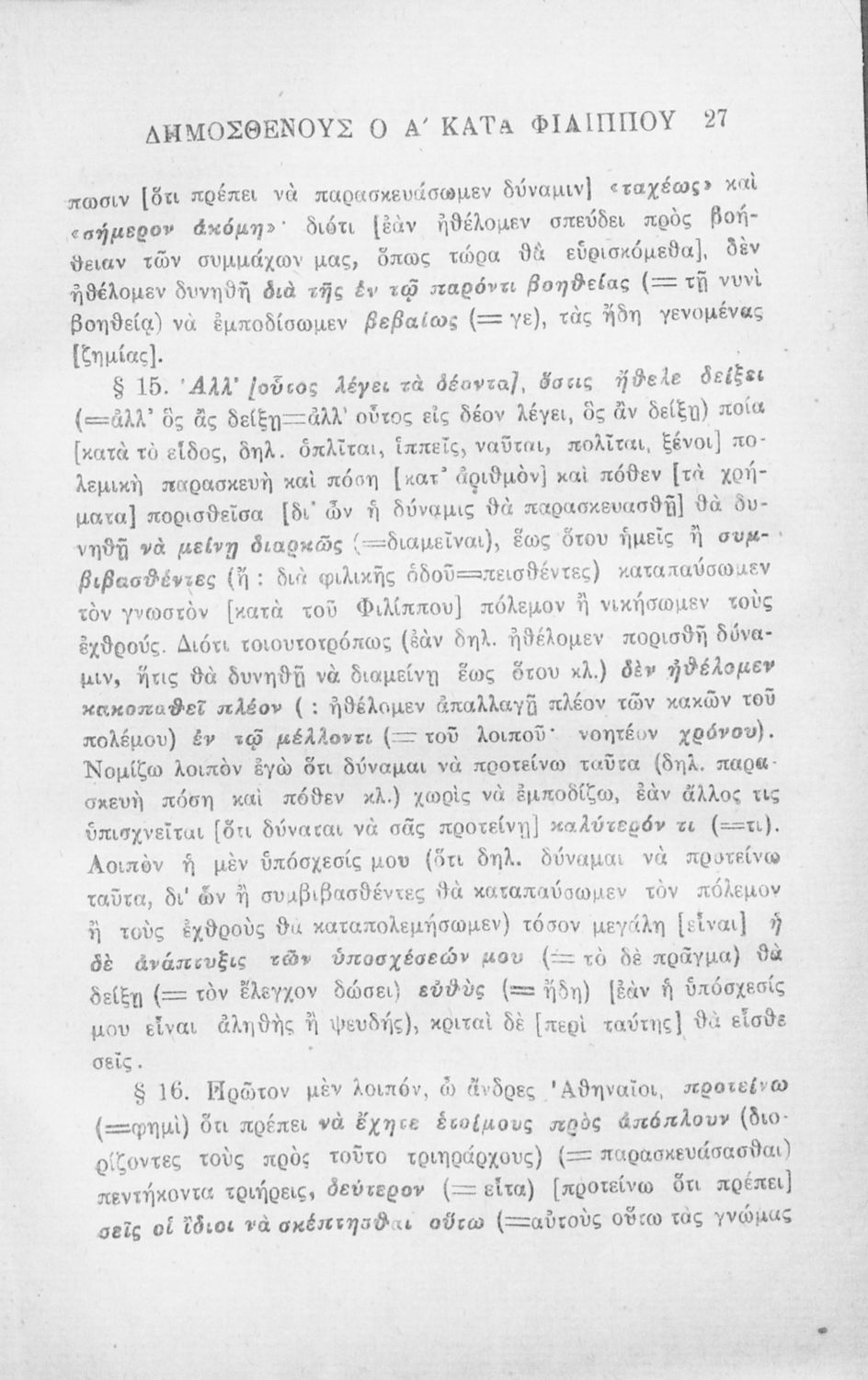 Μαθητικό βοήθημα Αρχαίων Ελληνικών της τρίτης τάξης των τετρατάξιων Γυμνασίων. Το βιβλίο περιέχει τα έργα του Δημοσθένη, Περί της ειρήνης και Α΄ Φιλιππικός από μετάφραση.