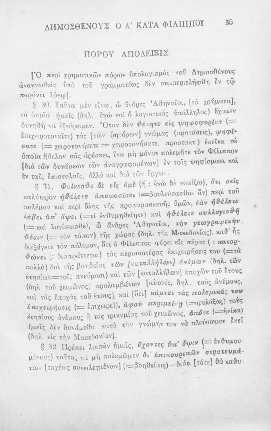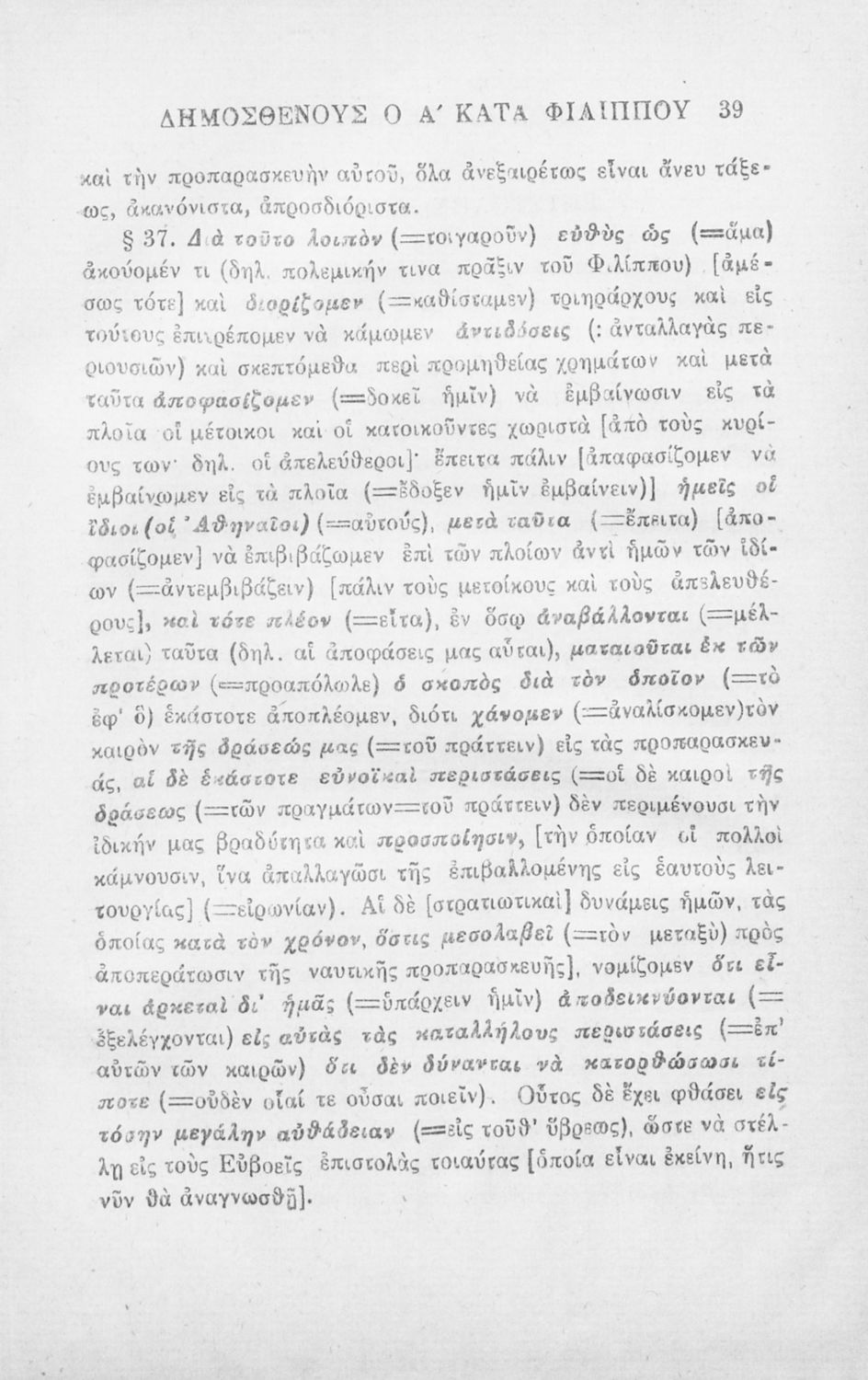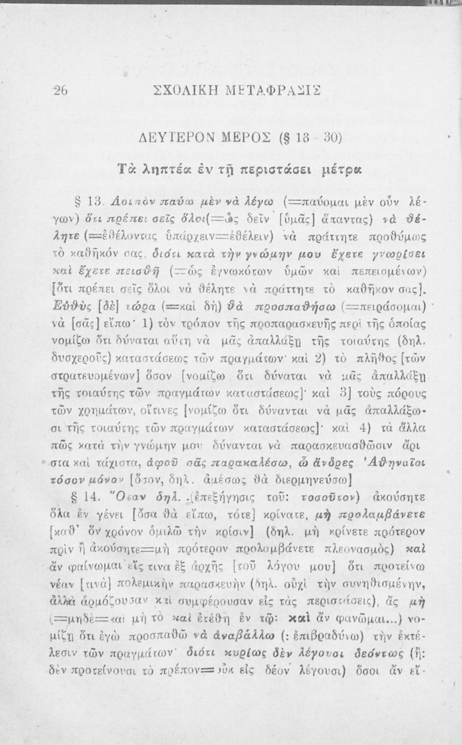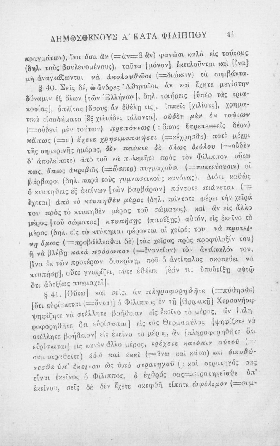Μαθητικό βοήθημα Αρχαίων Ελληνικών της τρίτης τάξης των τετρατάξιων Γυμνασίων. Το βιβλίο περιέχει τα έργα του Δημοσθένη, Περί της ειρήνης και Α΄ Φιλιππικός από μετάφραση.