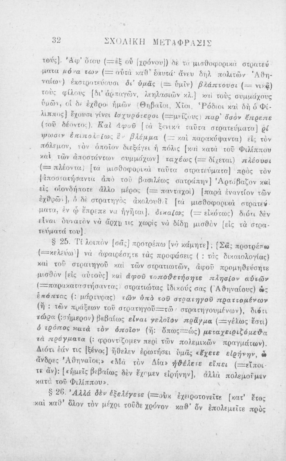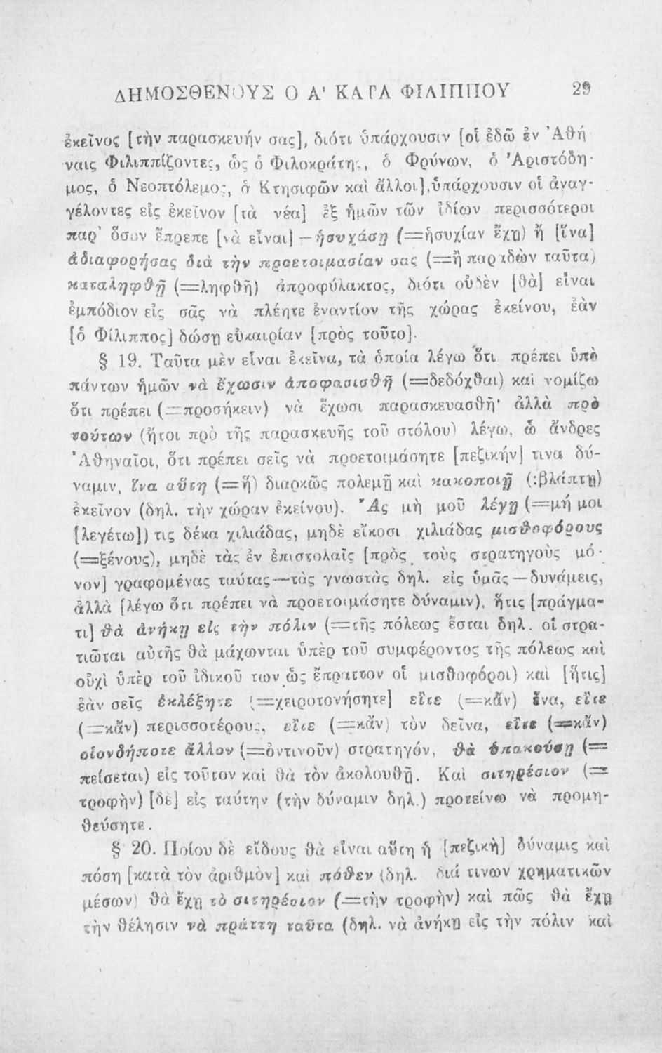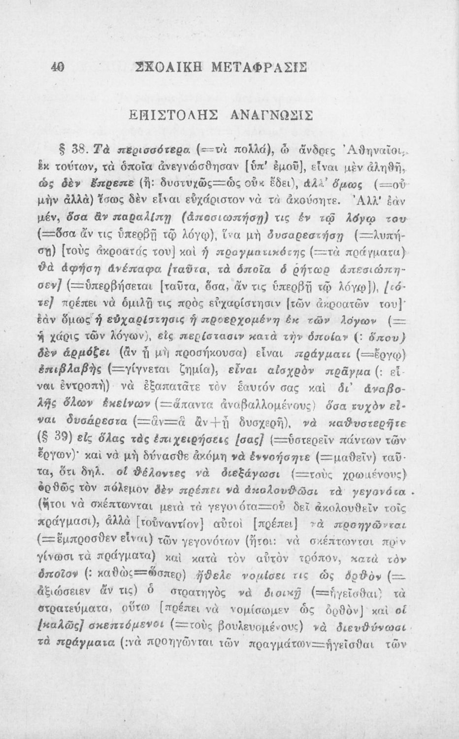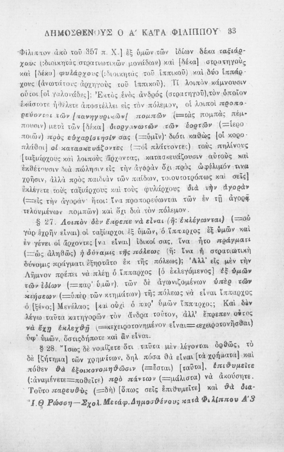 Μαθητικό βοήθημα Αρχαίων Ελληνικών της τρίτης τάξης των τετρατάξιων Γυμνασίων. Το βιβλίο περιέχει τα έργα του Δημοσθένη, Περί της ειρήνης και Α΄ Φιλιππικός από μετάφραση.