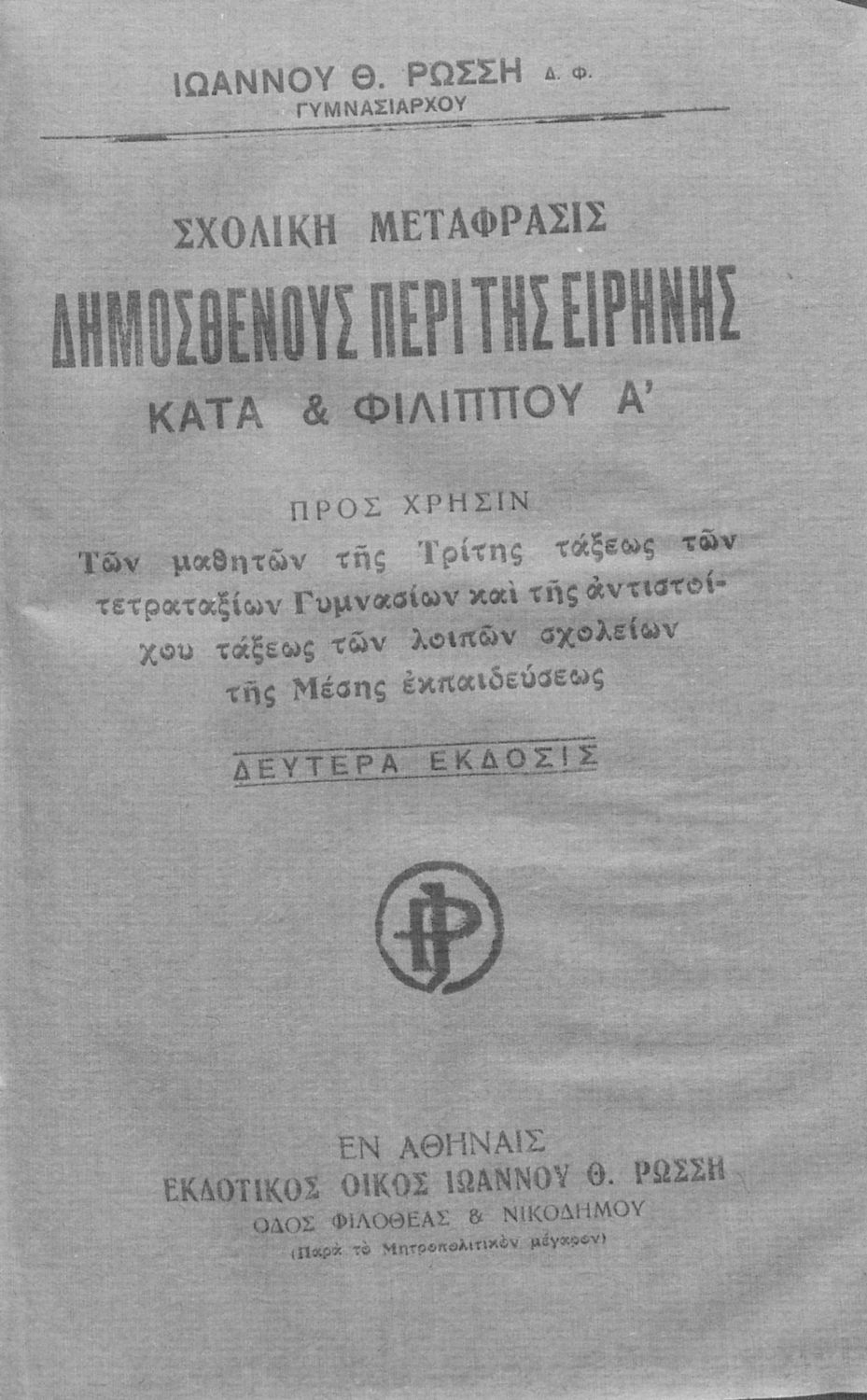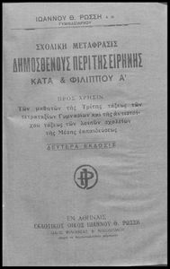 Τίτλος: Σχολική μετάφρασις Δημοσθένους Περί της ειρήνης κατά και Φιλίππου Α΄, προς χρήσιν των μαθητών της τρίτης τάξεως των τετραταξίων Γυμνασίων και της αντιστοίχου τάξεως των λοιπών σχολείων της Μέσης Εκπαιδεύσεως