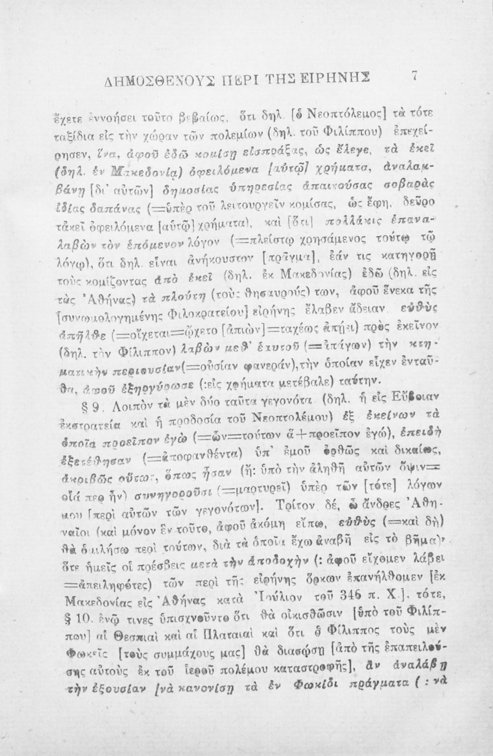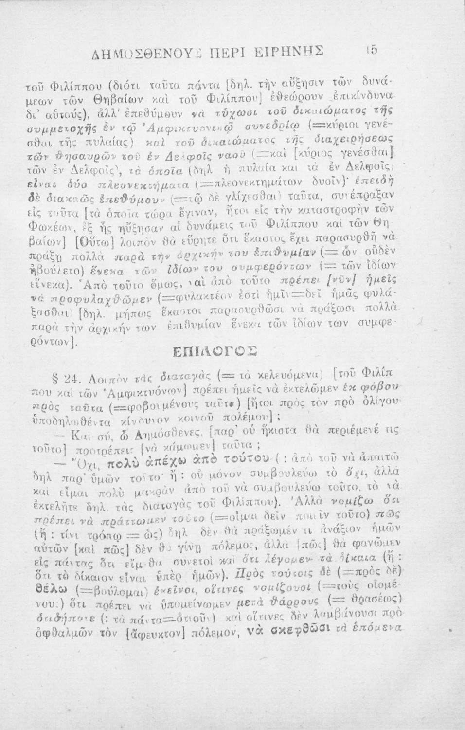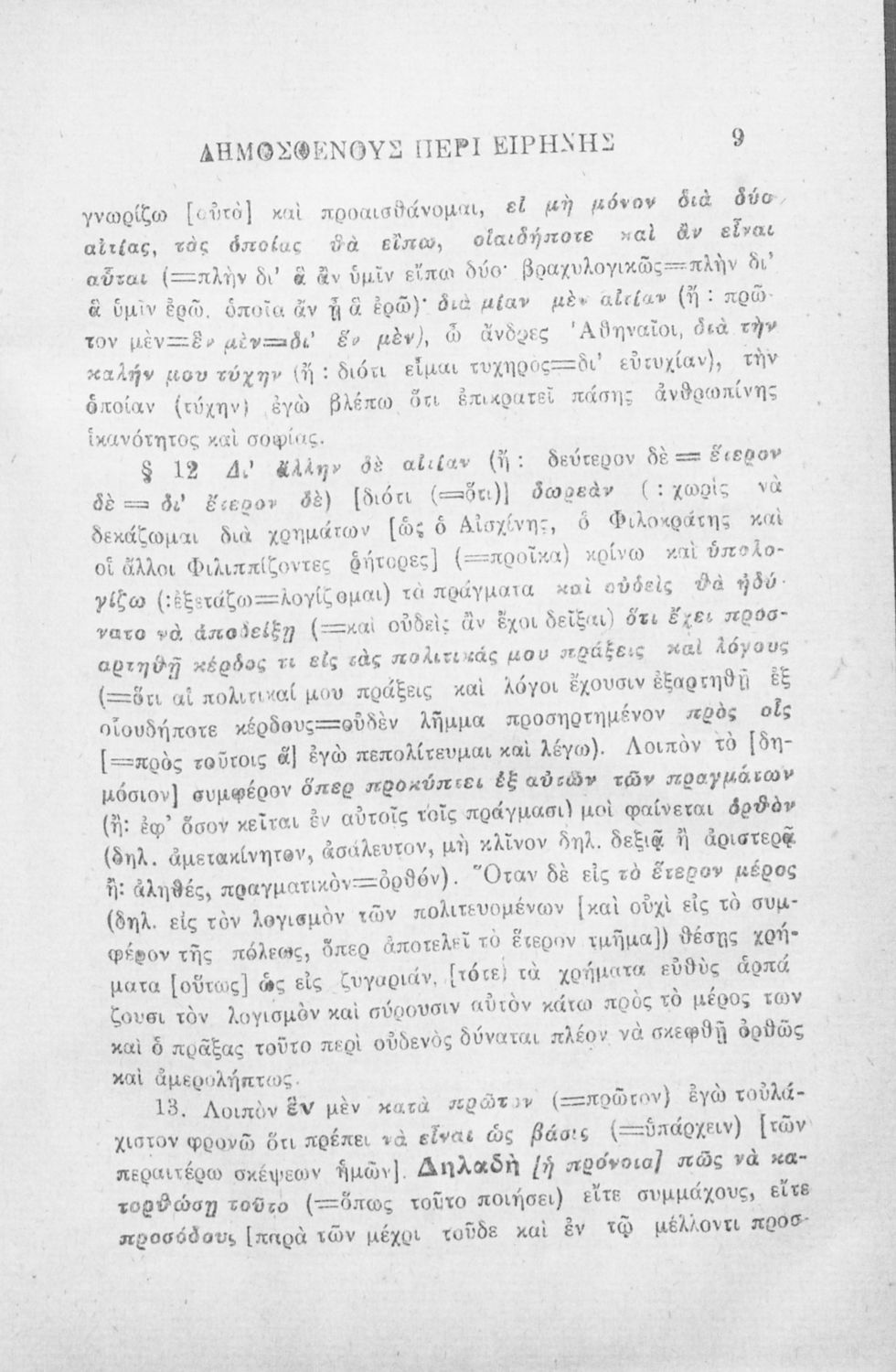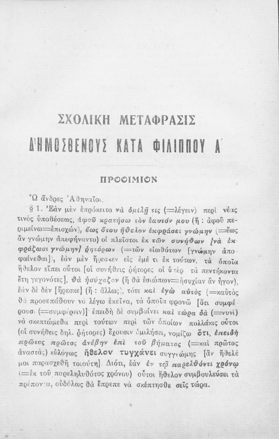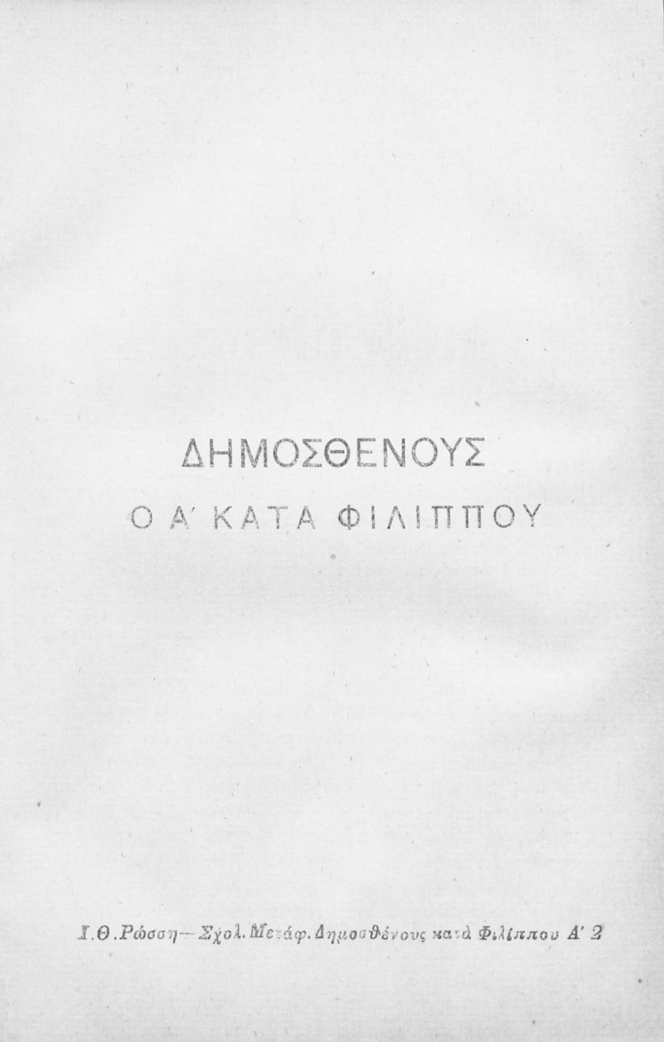 Μαθητικό βοήθημα Αρχαίων Ελληνικών της τρίτης τάξης των τετρατάξιων Γυμνασίων. Το βιβλίο περιέχει τα έργα του Δημοσθένη, Περί της ειρήνης και Α΄ Φιλιππικός από μετάφραση.