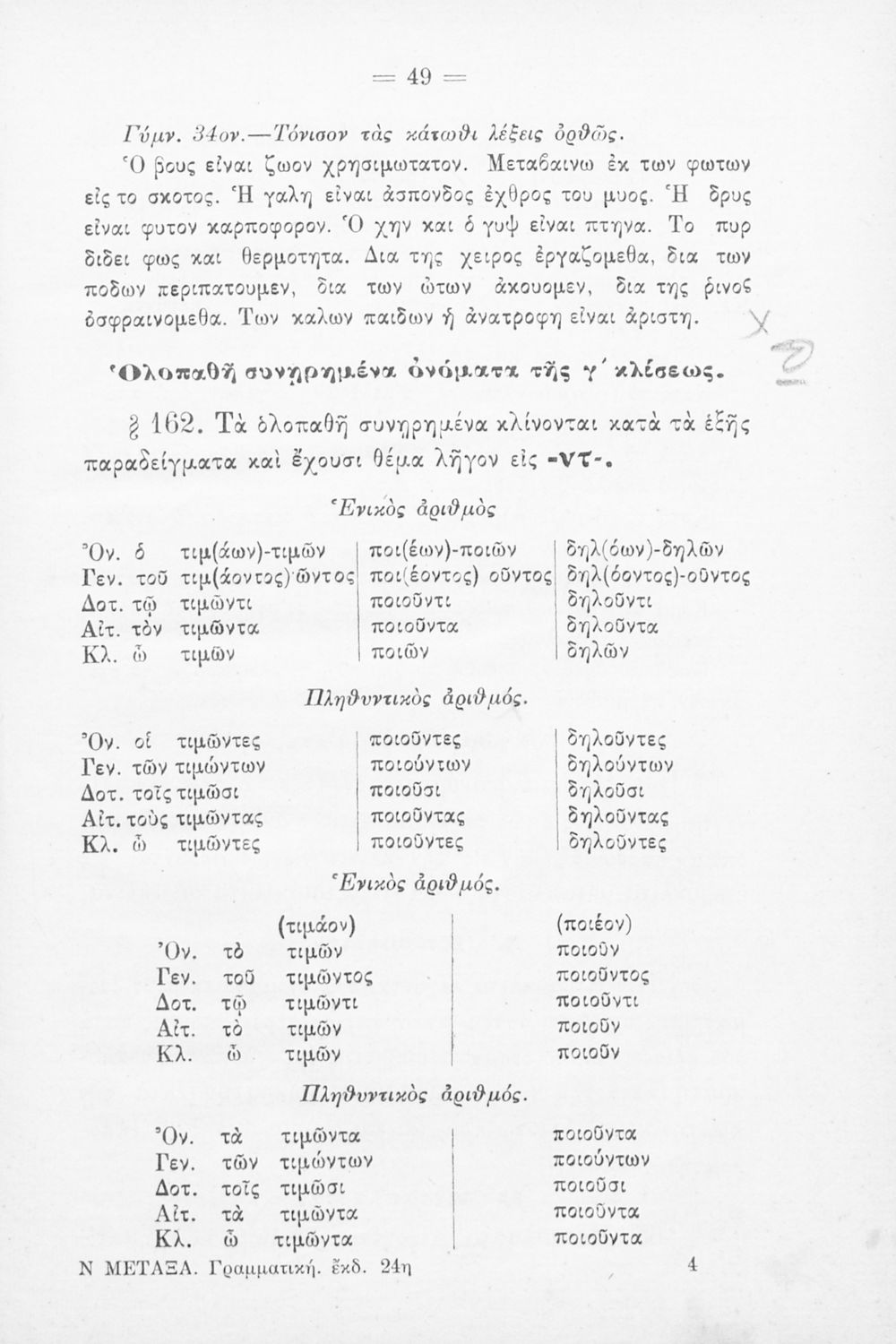 Σχολικό εγχειρίδιο Γ΄ και Δ΄ Δημοτικού που περιέχει τη γραμματικής της νέας ελληνικής. Την έκδοση επιμελήθηκε ο Γ. Λογοθέτης, τέως διευθυντής του επταταξίου δημ. Τμήμ.της Ευαγγελικής Σχολής.
