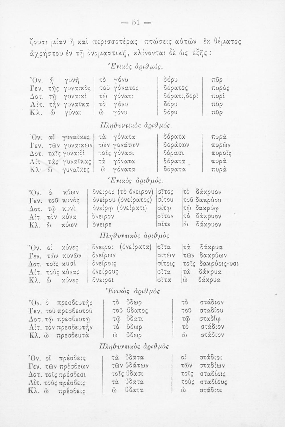 Σχολικό εγχειρίδιο για τις τάξεις του Δημοτικού και συγκεκριμένα της γραμματικής των Αρχαίων Ελληνικών. Το εγχειρίδιο χωρίζεται σε 2 μέρη. Το πρώτο μέρος περιλαμβάνει το τεχνολογικό μέρος της γραμματικής, όπου