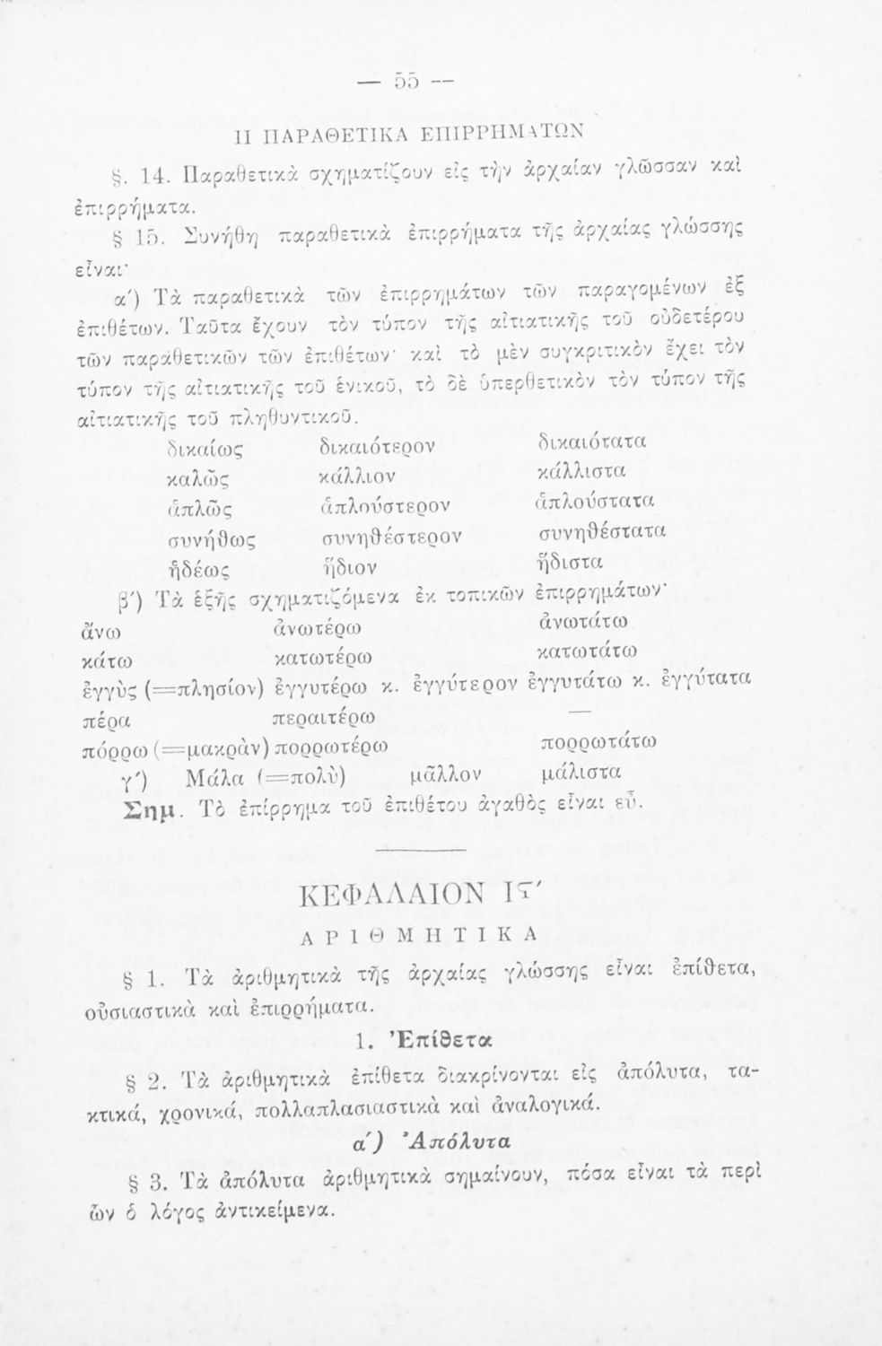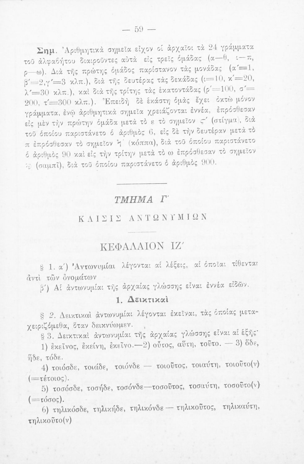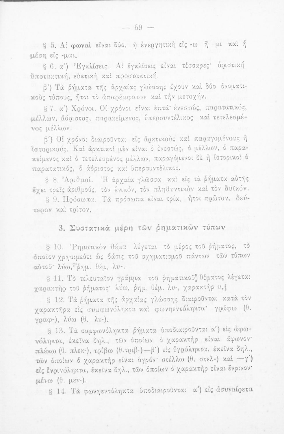 Σχολικό εγχειρίδιο Αρχαίων Ελληνικών για τα Ελληνικά Σχολεία και Παρθεναγωγεία που περιέχει τους κανόνες γραμματικής και είναι χωρισμένο σε φθογγολογικό, τυπολογικό και ετυμολογικό μέρος.