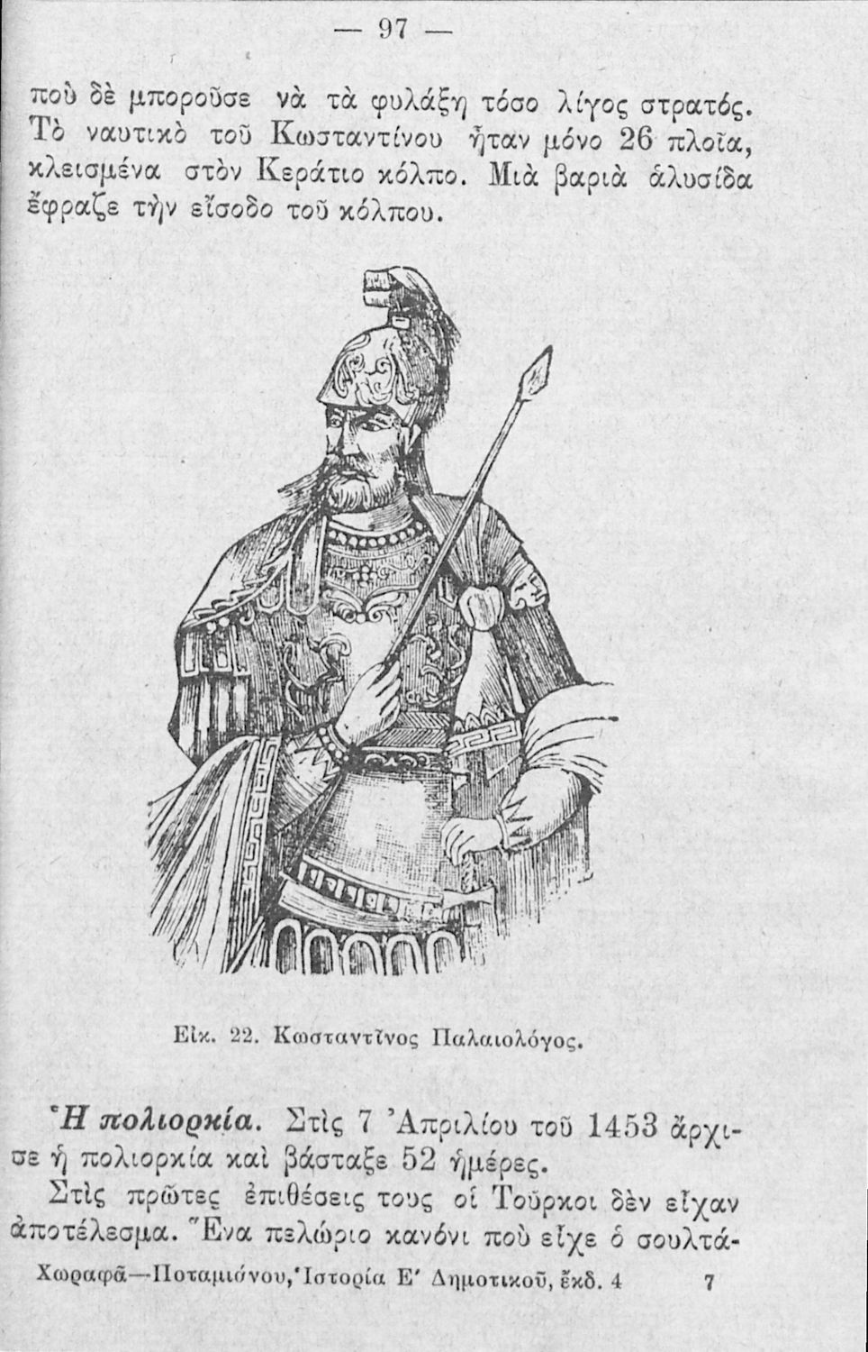 Σχολικό εγχειρίδιο για το μάθημα της Ιστορίας στους μαθητές του Δημοτικού. Αναφέρεται στα χρόνια της Βυζαντινής Αυτοκρατορίας μέχρι και την άλωση της Πόλης. Το τελευταίο κεφάλαιο αναφέρεται στα επιτεύγματα της