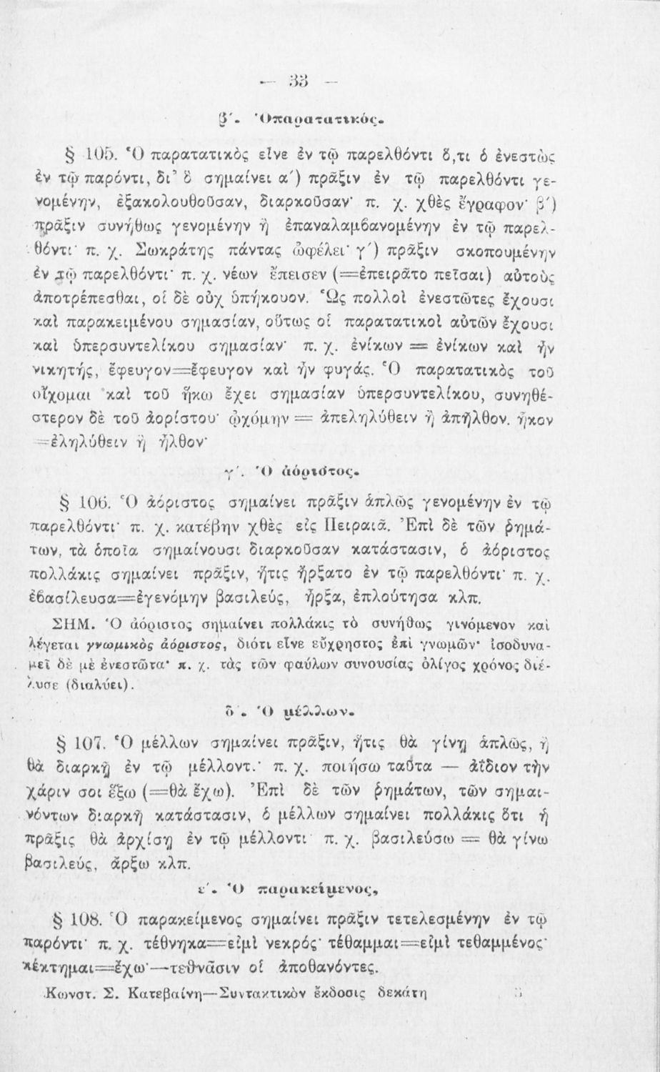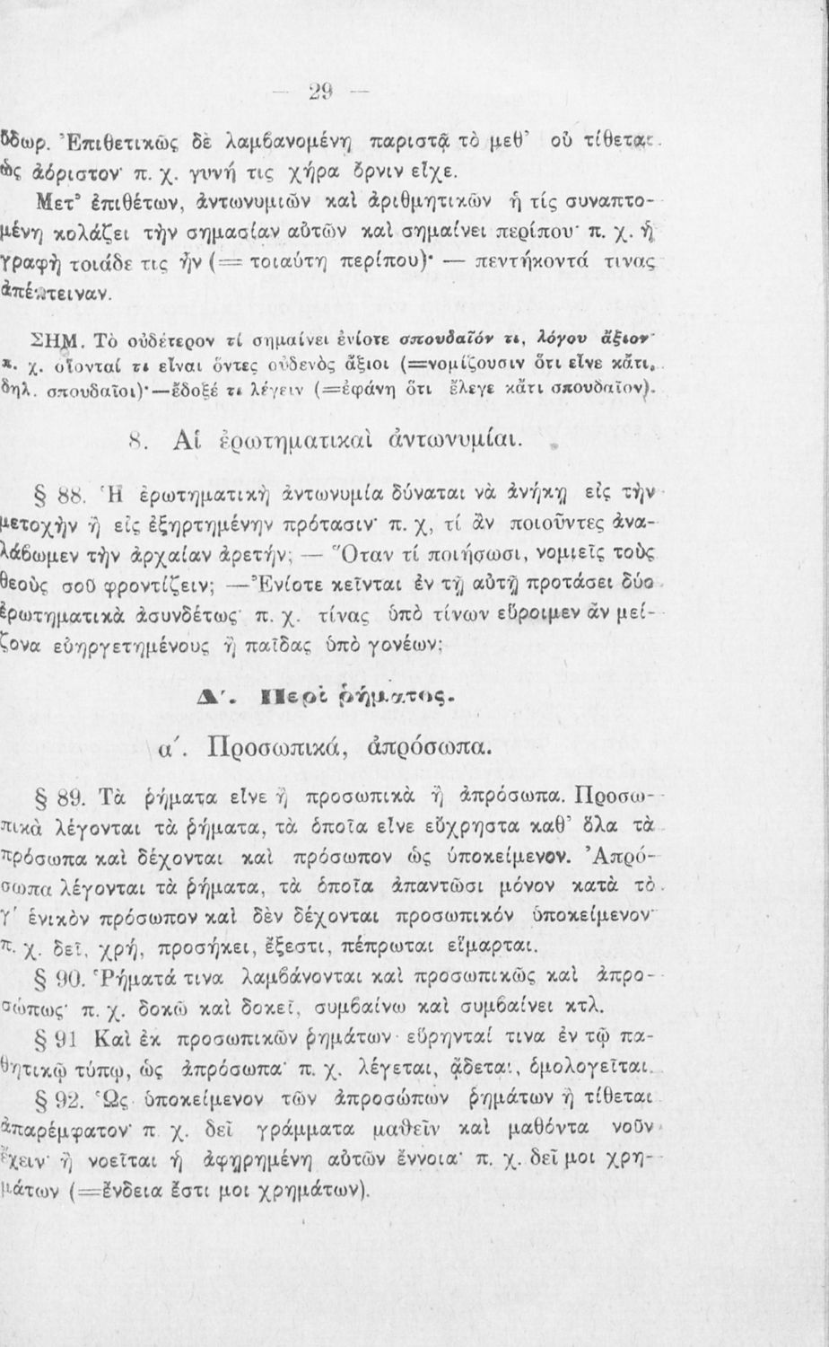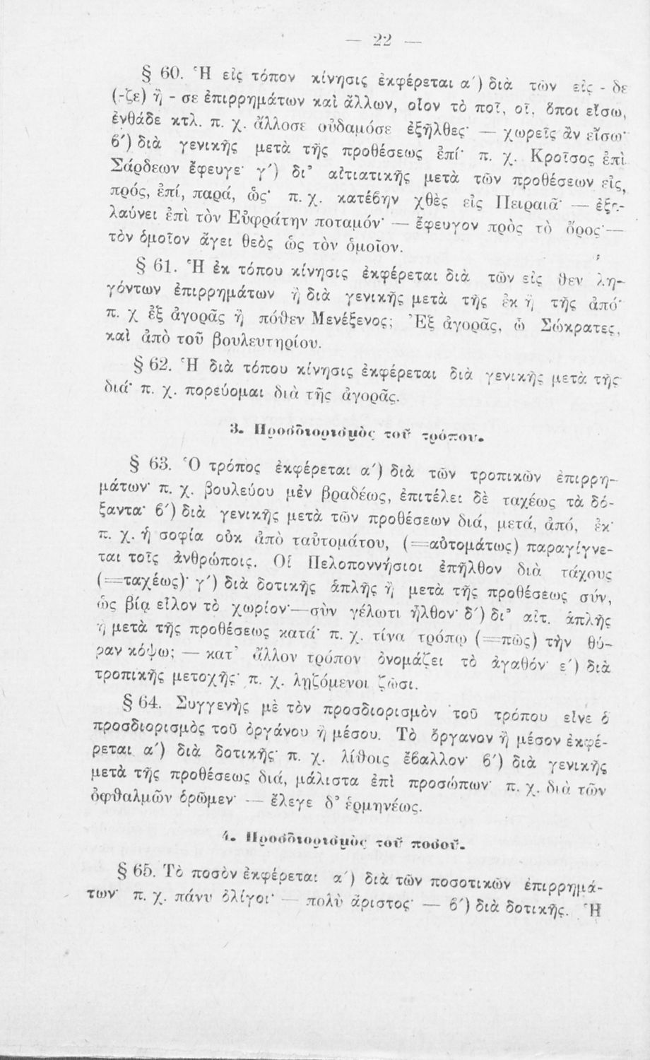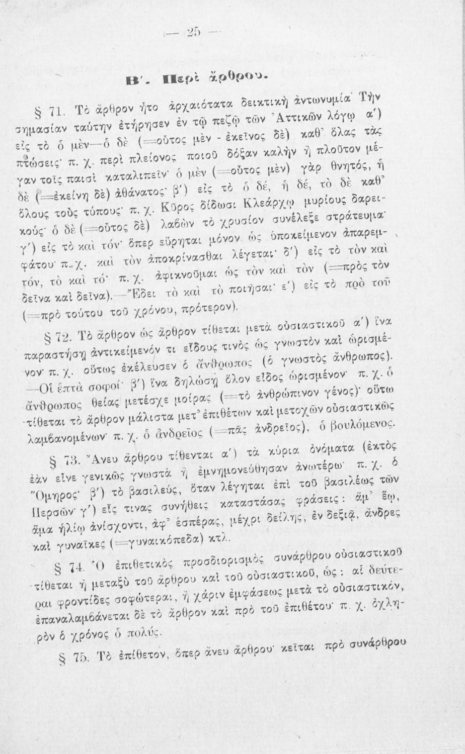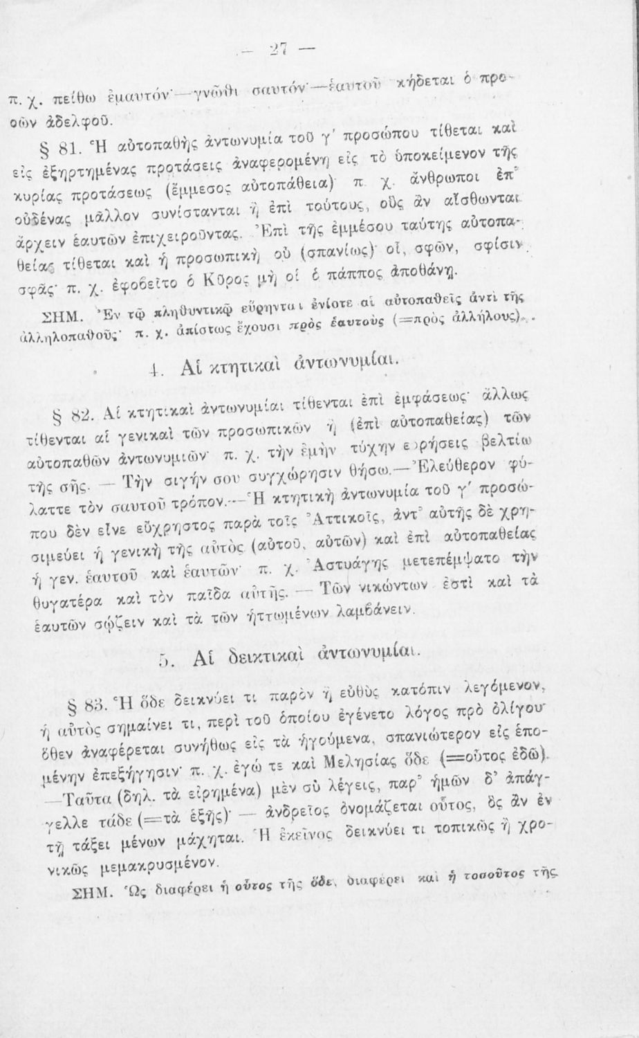 Σχολικό εγχειρίδιο Αρχαίων Ελληνικών για τα Ελληνικά Σχολεία και Παρθεναγωγεία που εστιάζει στα μέρη του λόγου και στην σύνταξή τους.