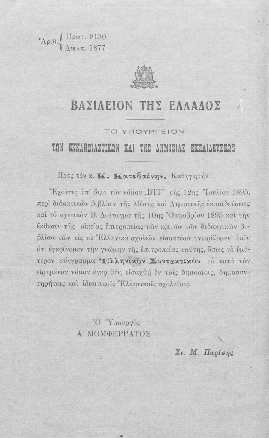 Σχολικό εγχειρίδιο Αρχαίων Ελληνικών για τα Ελληνικά Σχολεία και τα Ανώτερα Παρθεναγωγεία που εξετάζει τα μέρη του λόγου και την σύνταξή τους.
