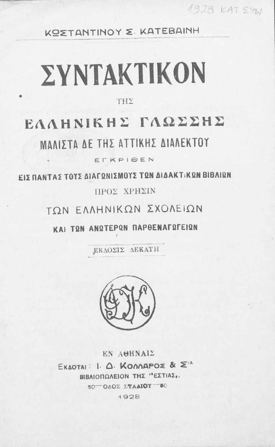 Κωδικός βιβλιοθήκης: 1928 ΚΑΤ ΣΥΝ