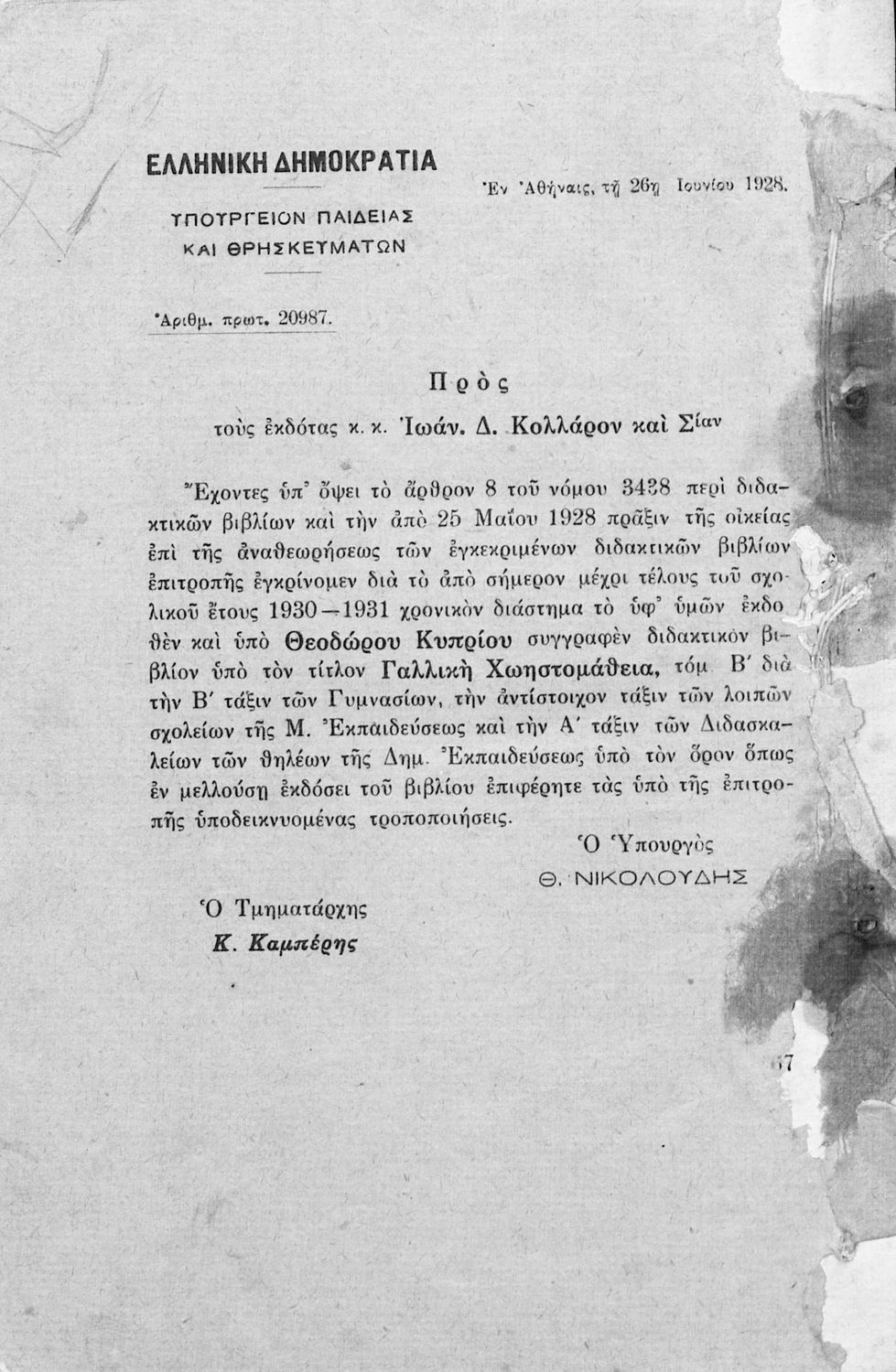 Υπουργική απόφαση / Σύμβαση: 20987/26-6-1928