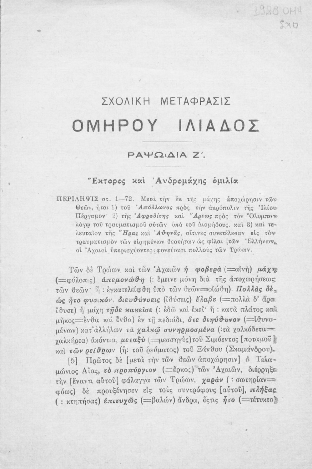 Μαθητικό βοήθημα Αρχαίων Ελληνικών για τους μαθητές της Γ΄ τάξης των τετρατάξιων Γυμνασίων. Το βιβλίο περιέχει τη Ζ΄ ραψωδία της 'Ιλιάδας' του Ομήρου σε μετάφραση.