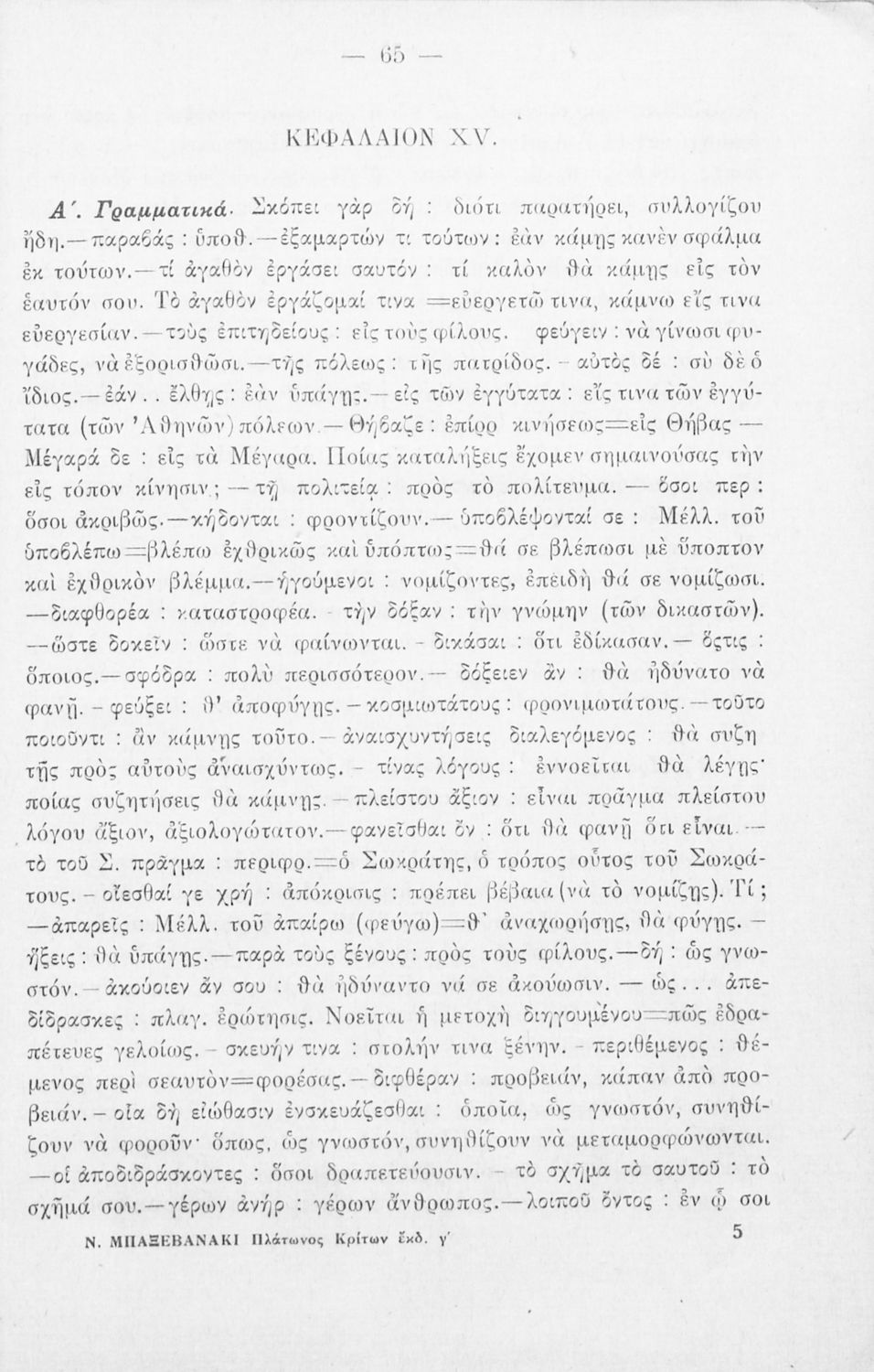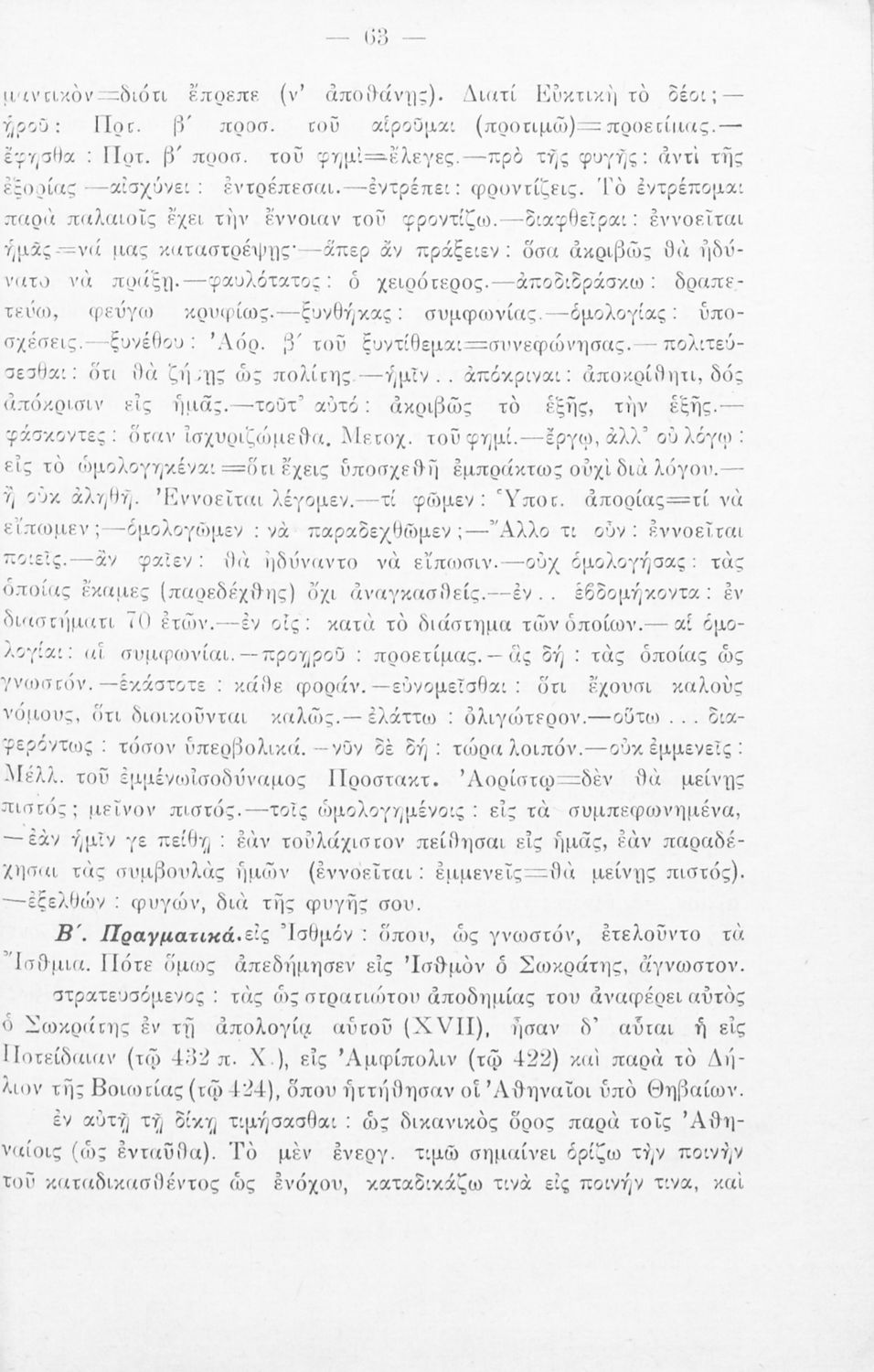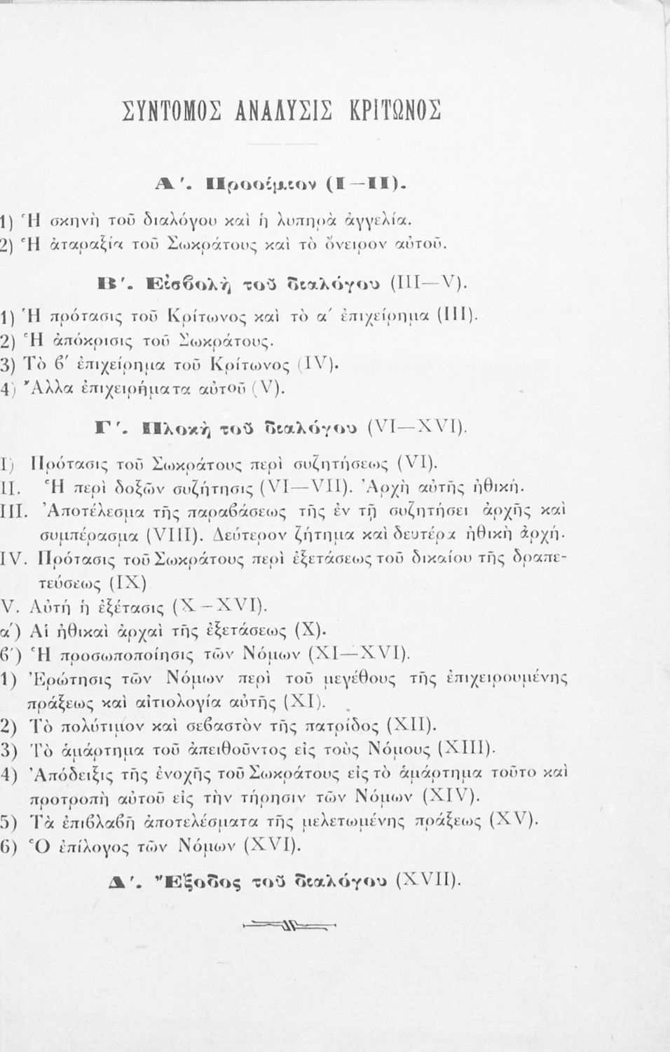 Μαθητικό βοήθημα Αρχαίων Ελληνικών Γ΄ Γυμνασίου που περιέχει σύντομη εισαγωγή στη ζωή και το έργο του Πλάτωνα και του Σωκράτη, κείμενο και ερμηνευτικές και πραγματολογικές σημειώσεις.