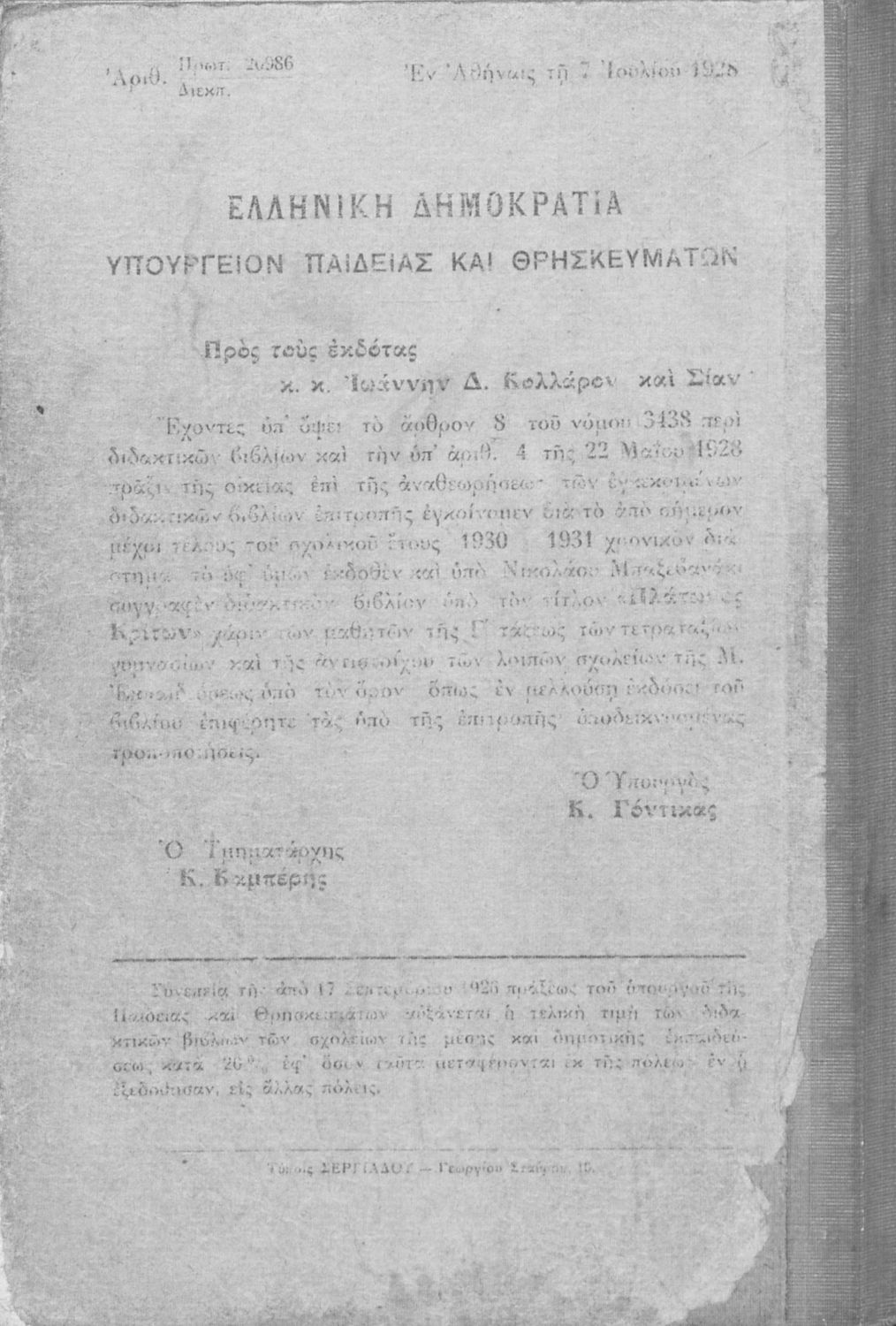 Εκδότης: Ιωάννης Δ. Κολλάρος και ΣΙΑ Έτος έκδοσης: 1928 Τόπος έκδοσης: Αθήνα Έκδοση: 3η Υπουργική απόφαση / Σύμβαση: 20986/7-7-1928 |