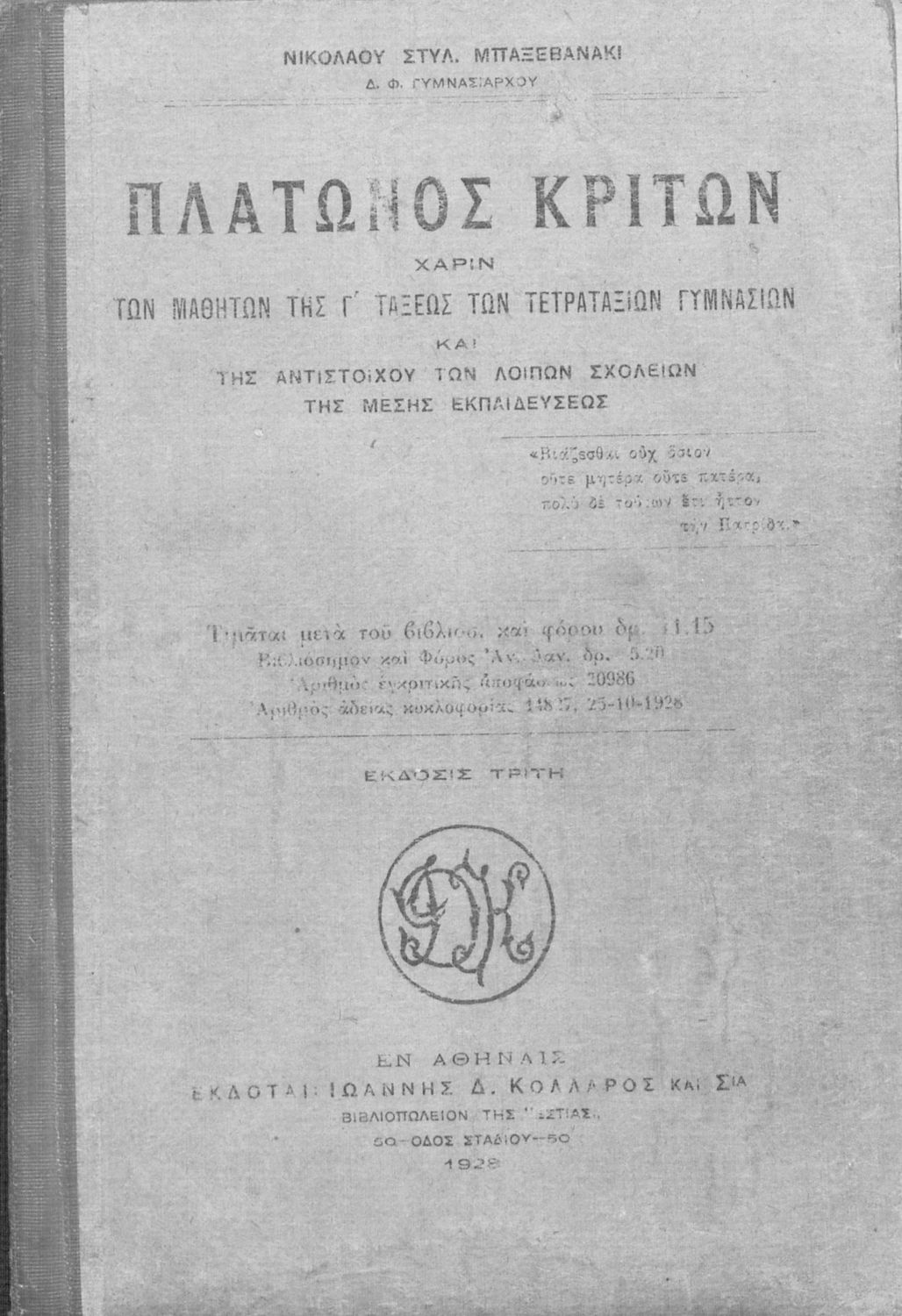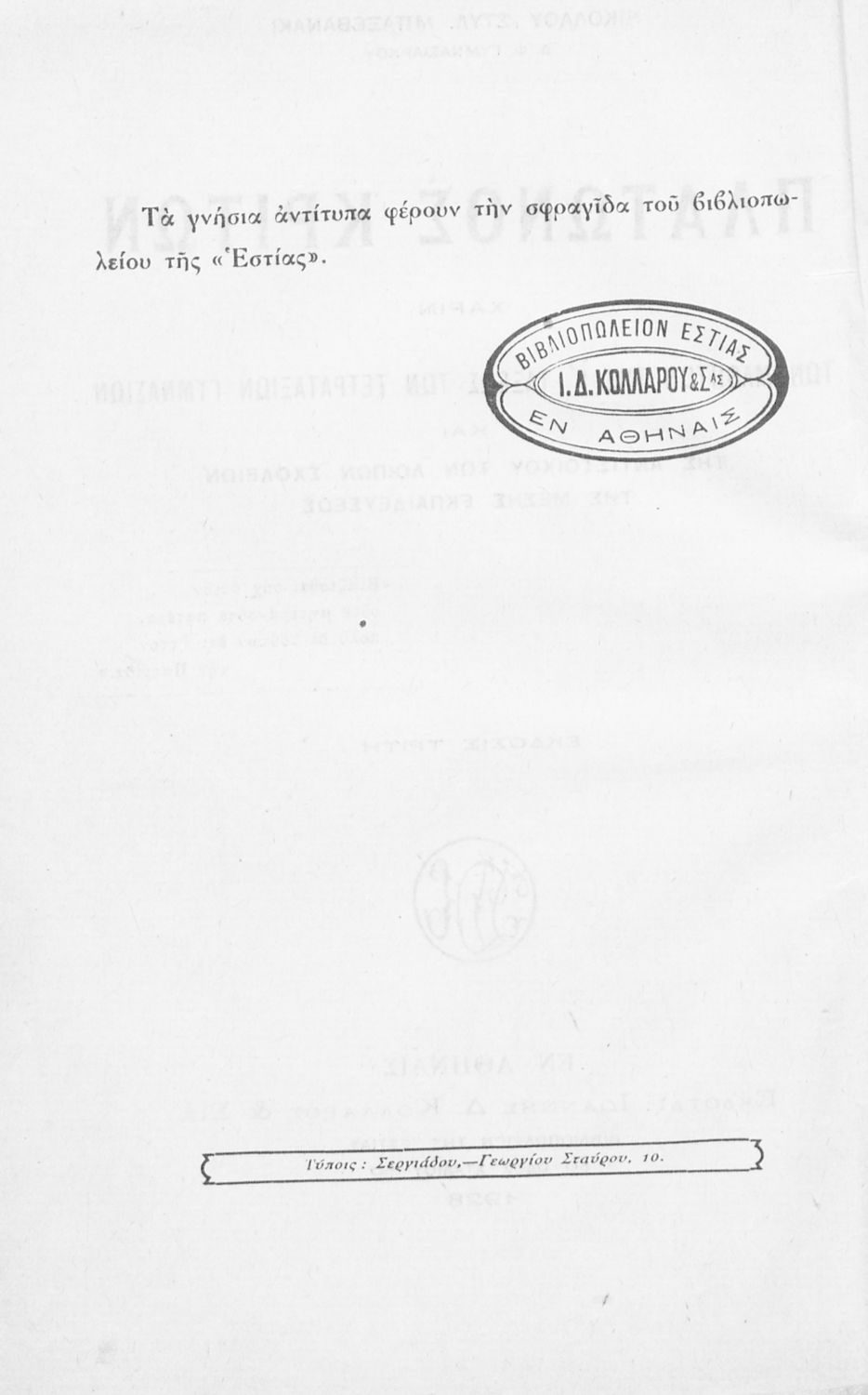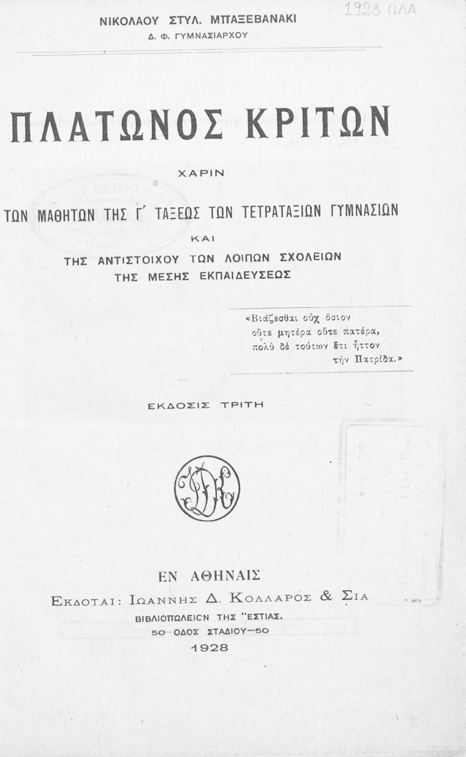 Εντοπισμός πρωτοτύπου: Ελληνικό Λογοτεχνικό και Ιστορικό Αρχείο Κωδικός βιβλιοθήκης: 1928 ΠΛΑ |