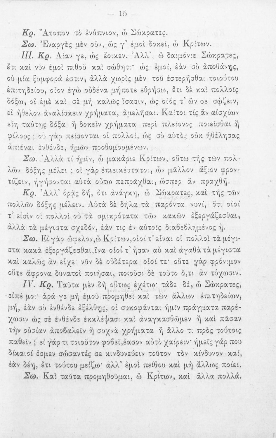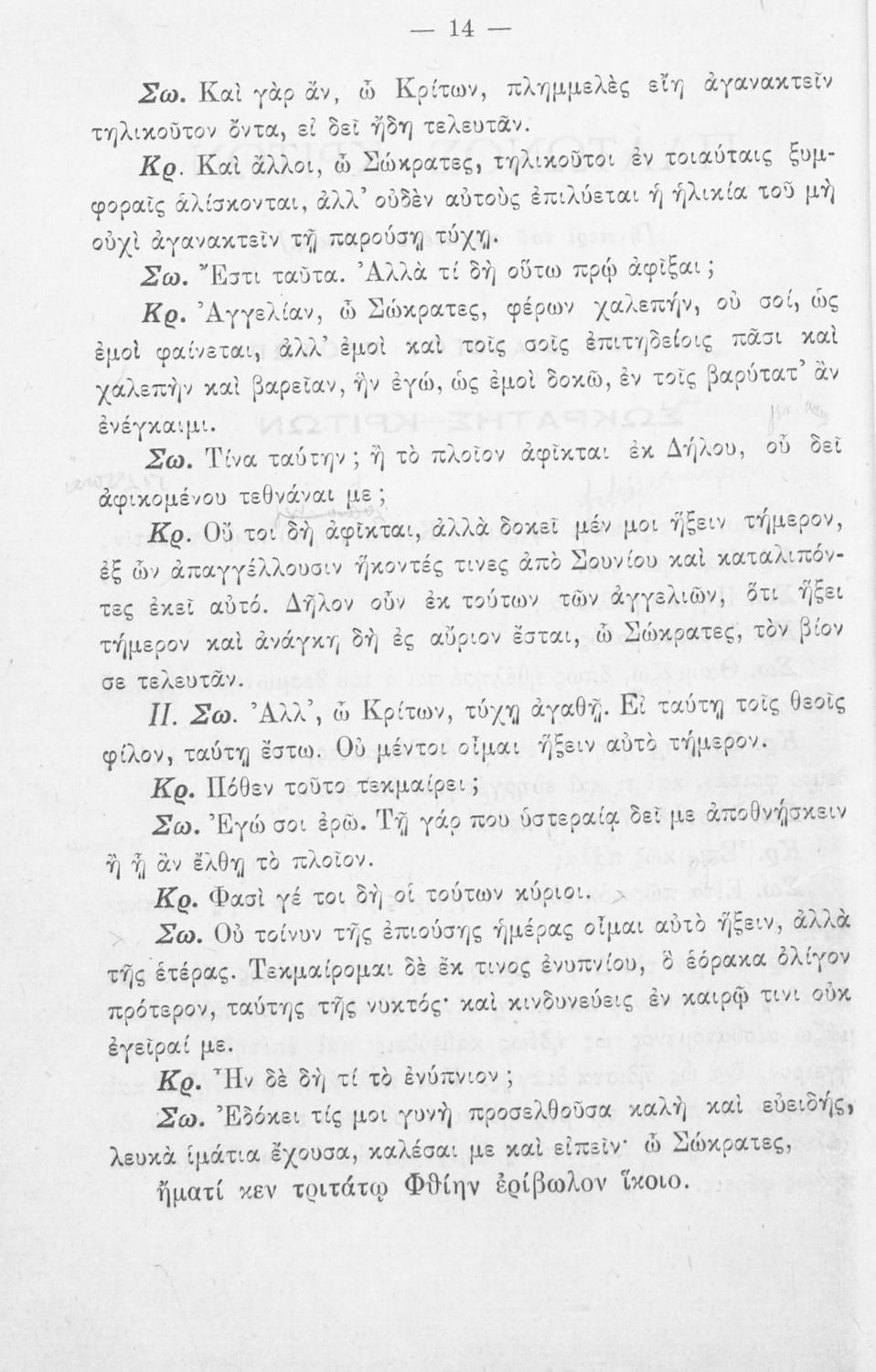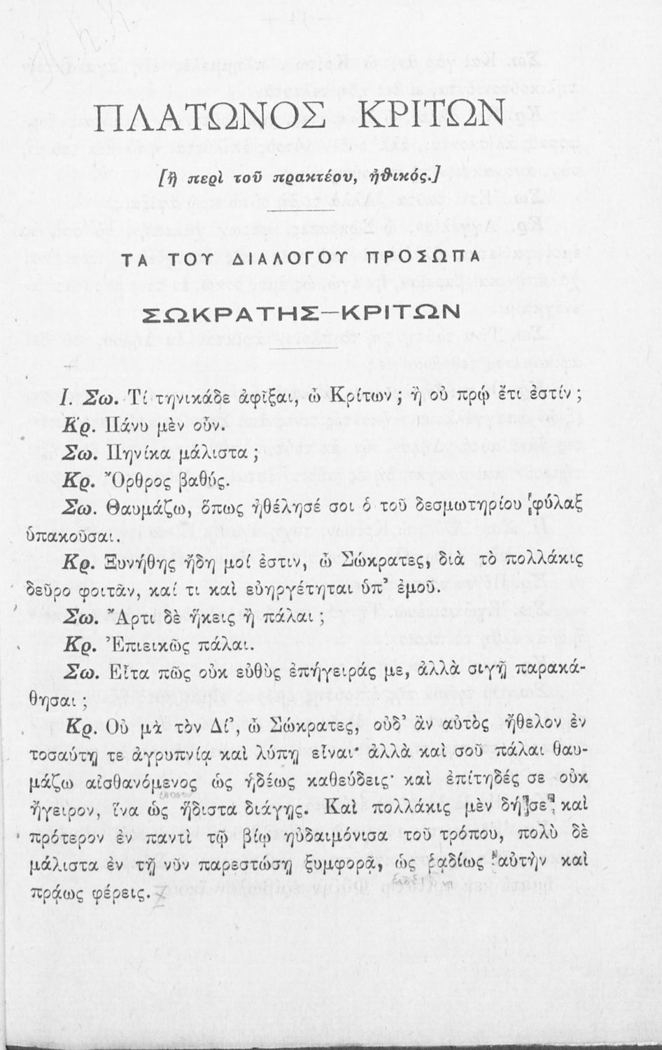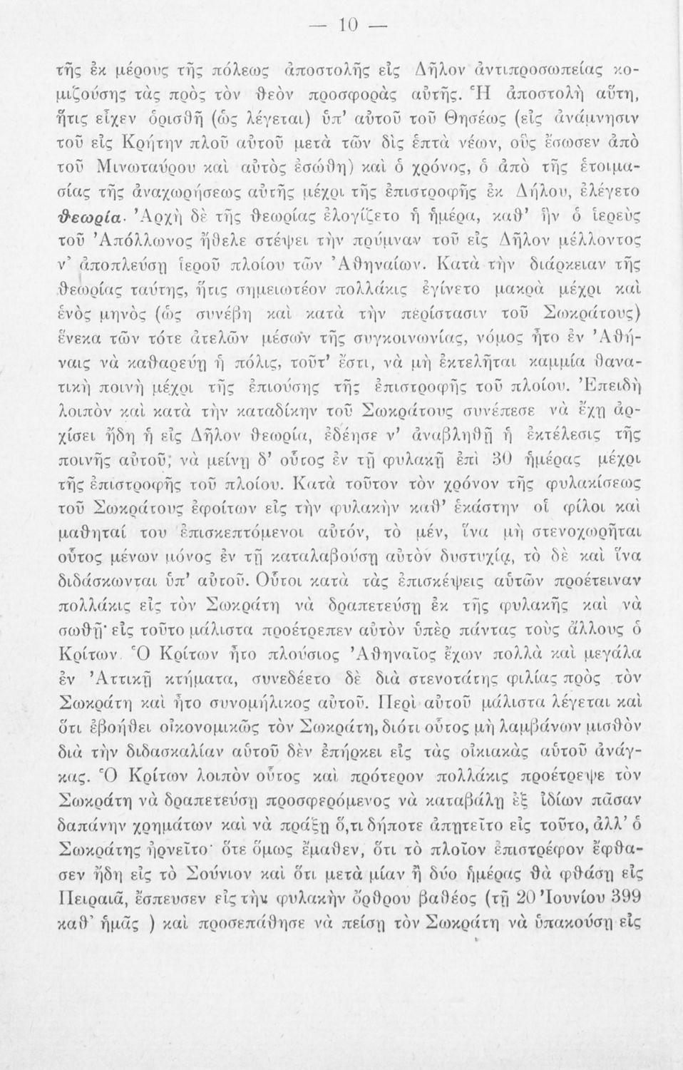 Μαθητικό βοήθημα Αρχαίων Ελληνικών Γ΄ Γυμνασίου που περιέχει σύντομη εισαγωγή στη ζωή και το έργο του Πλάτωνα και του Σωκράτη, κείμενο και ερμηνευτικές και πραγματολογικές σημειώσεις.