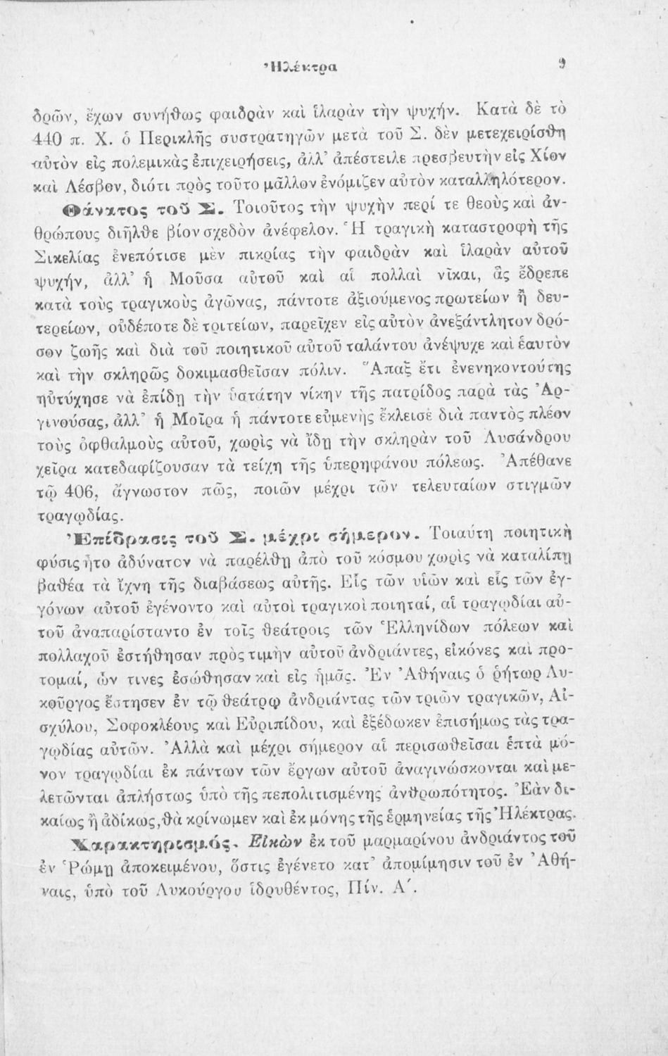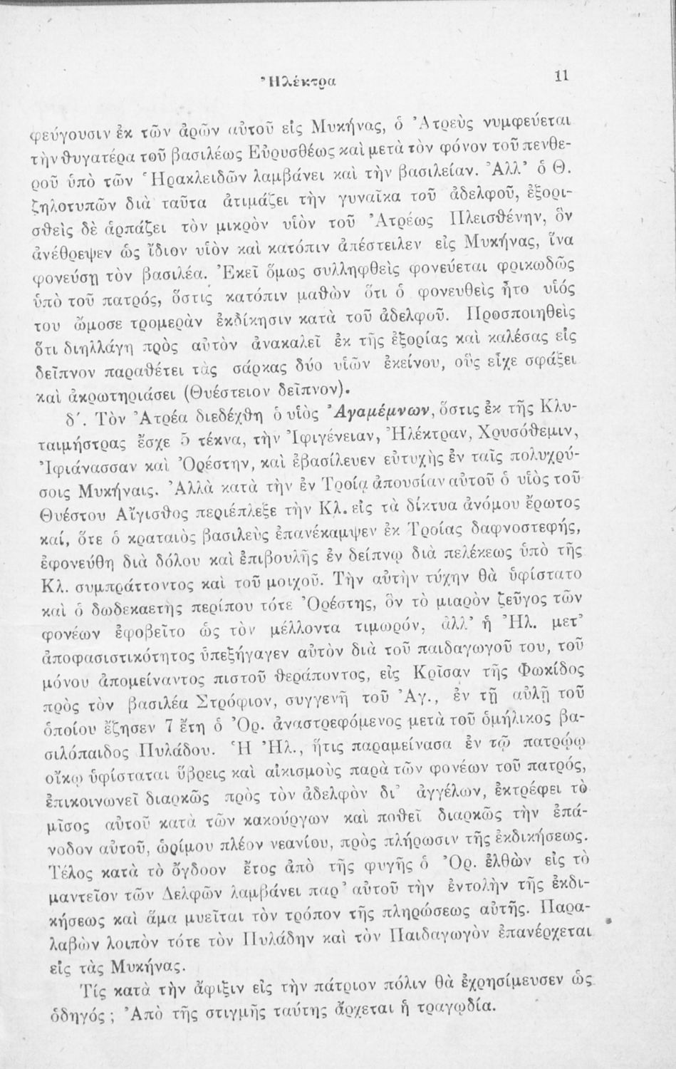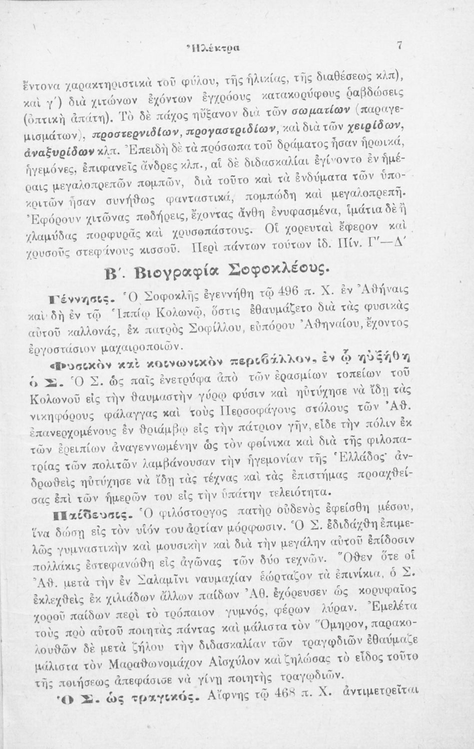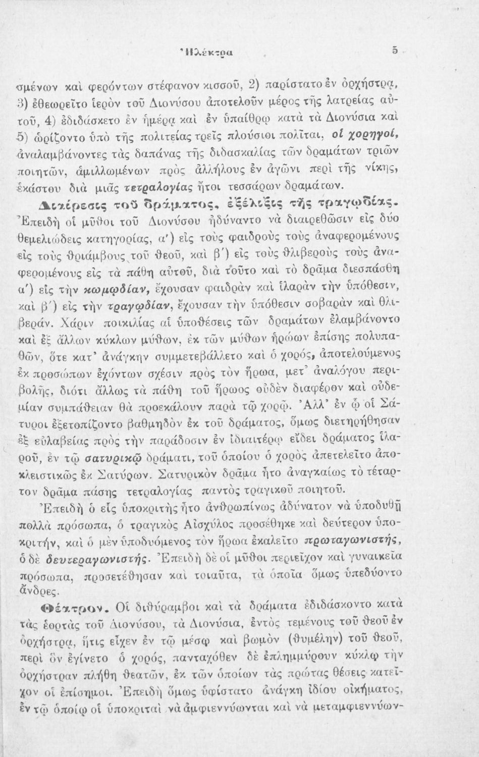 Μαθητικό βοήθημα Αρχαίων Ελληνικών το οποίο περιλαμβάνει το έργο του Σοφοκλή, 'Ηλέκτρα'. Το βιβλίο ξεκινάει με μια εισαγωγή για τη γέννηση και την εξέλιξη της τραγωδίας, συνεχίζει παραθέτοντας το έργο το οποίο και συνοδεύεται από γλωσσικές και ερμηνευτικές παρατηρήσεις.