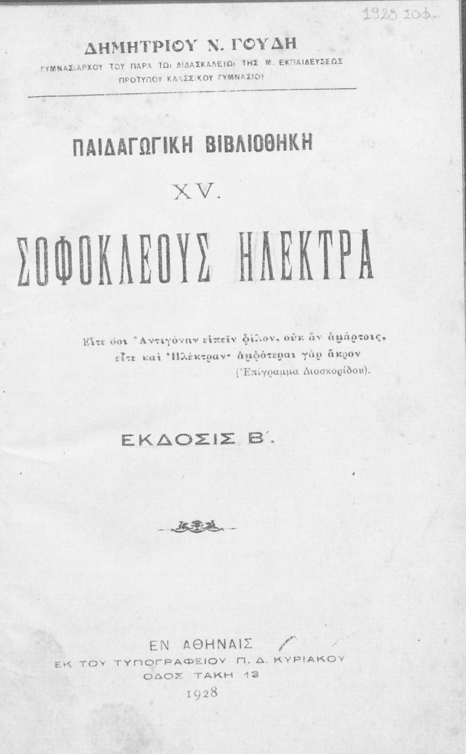 Εντοπισμός πρωτοτύπου: Ελληνικό Λογοτεχνικό και Ιστορικό Αρχείο Κωδικός βιβλιοθήκης: 1928 ΣΟΦ |