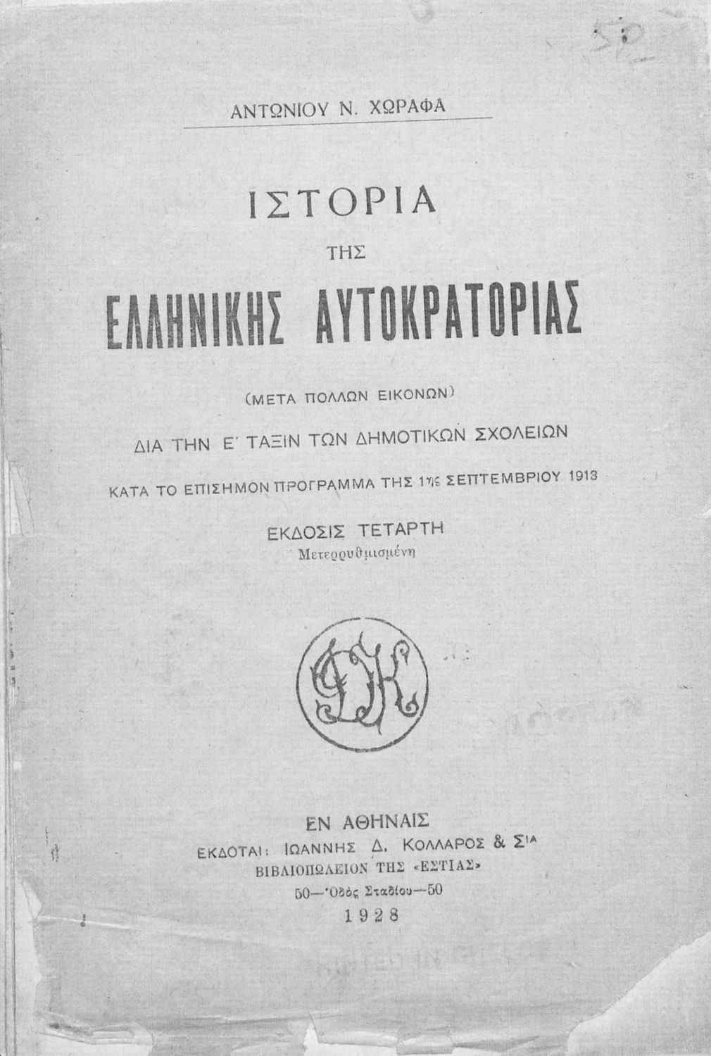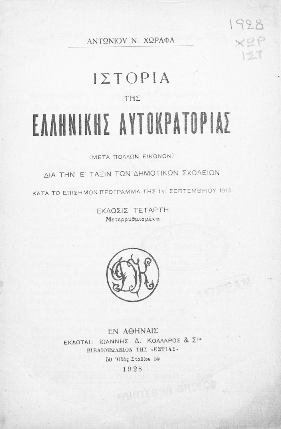 Εκδότης: Ιωάννης Δ. Κολλάρος και ΣΙΑ Έτος έκδοσης: 1928 Τόπος έκδοσης: Αθήνα Έκδοση: 4η |
