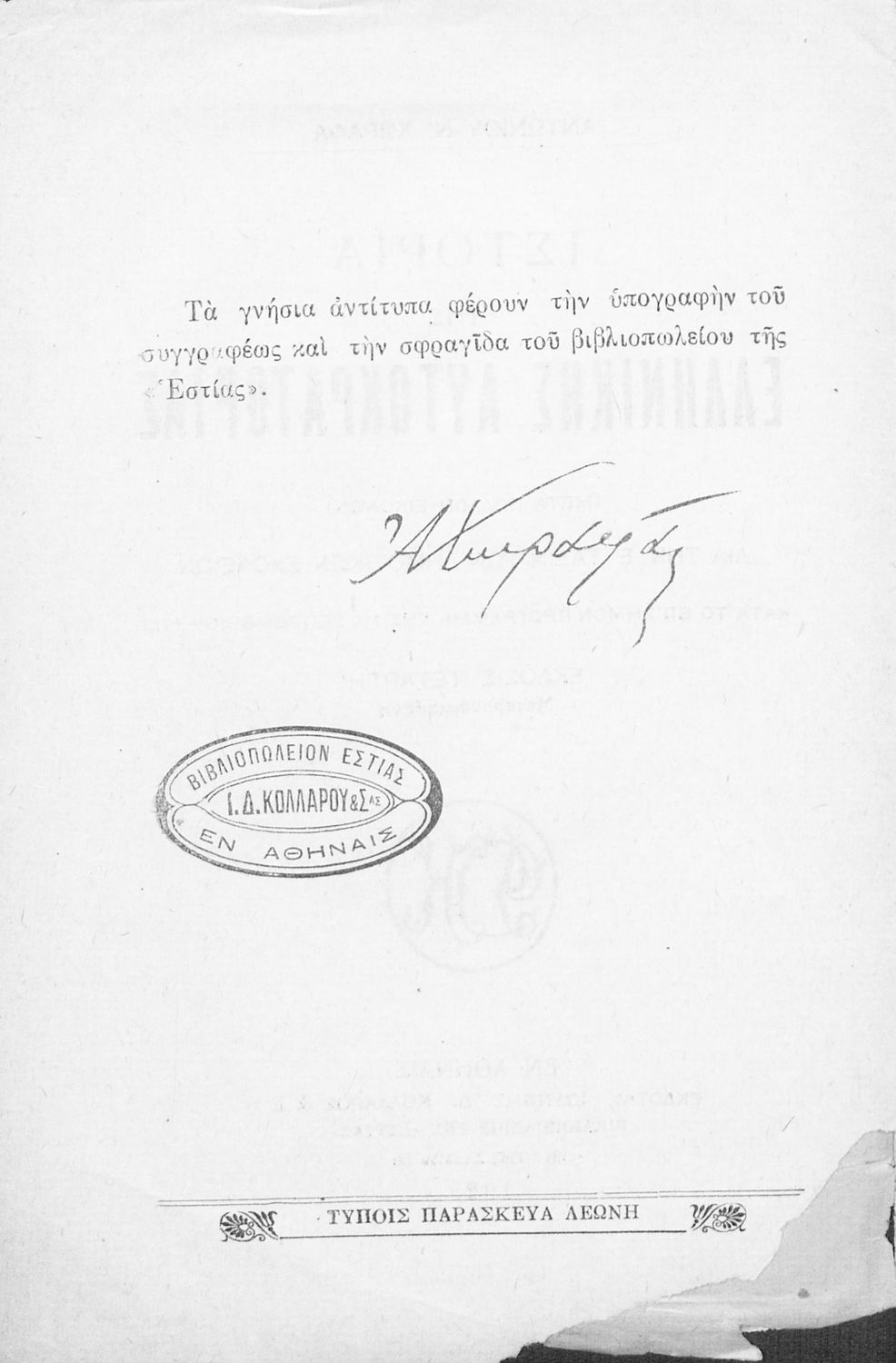 Εντοπισμός πρωτοτύπου: Ελληνικό Λογοτεχνικό και Ιστορικό Αρχείο Κωδικός βιβλιοθήκης: 1928 ΧΩΡ ΙΣΤ |