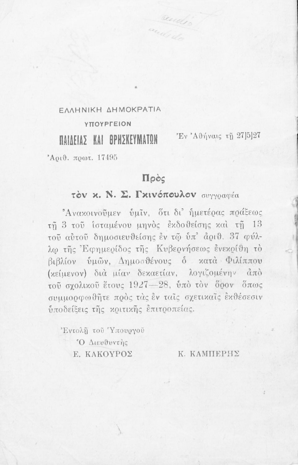 Εκδότης: Εκδοτική Εταιρεία "Αθήνα" Α.Ι. Ράλλης & ΣΙΑ Έτος έκδοσης: 1927 Τόπος έκδοσης: Αθήνα Υπουργική απόφαση / Σύμβαση: 17495/27-5-1927 |