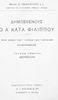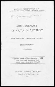 Βαθμίδα εκπαίδευσης: Δευτεροβάθμια Τάξη: Γ' Γυμνασίου Μάθημα: Αρχαία Ελληνικά Γλώσσα: Καθαρεύουσα Παρουσίαση περιεχομένου: Σχολικό εγχειρίδιο Αρχαίων Ελληνικών Γ' Γυμνασίου που περιέχει το Λόγο του Δημοσθένη Α΄ Κατά Φιλίππου και γλωσσικά και ερμηνευτικά σχόλια. |