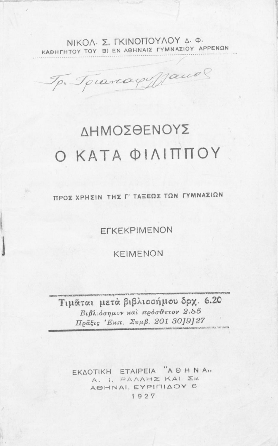 Κωδικός αναγνώρισης: 02-01671 Τίτλος: Δημοσθένους Ο Α΄ κατά Φιλίππου, προς χρήσιν της Γ΄ τάξεως των Γυμνασίων εγκεκριμένος, τεύχος πρώτον Συγγραφέας: Δημοσθένης, Νικόλαος Σ. Μπαξεβανάκις (σχόλια) Μέγεθος και υπόστρωμα: Σχολικό εγχειρίδιο, μαλακό εξώφυλλο, 28 σελίδες. |