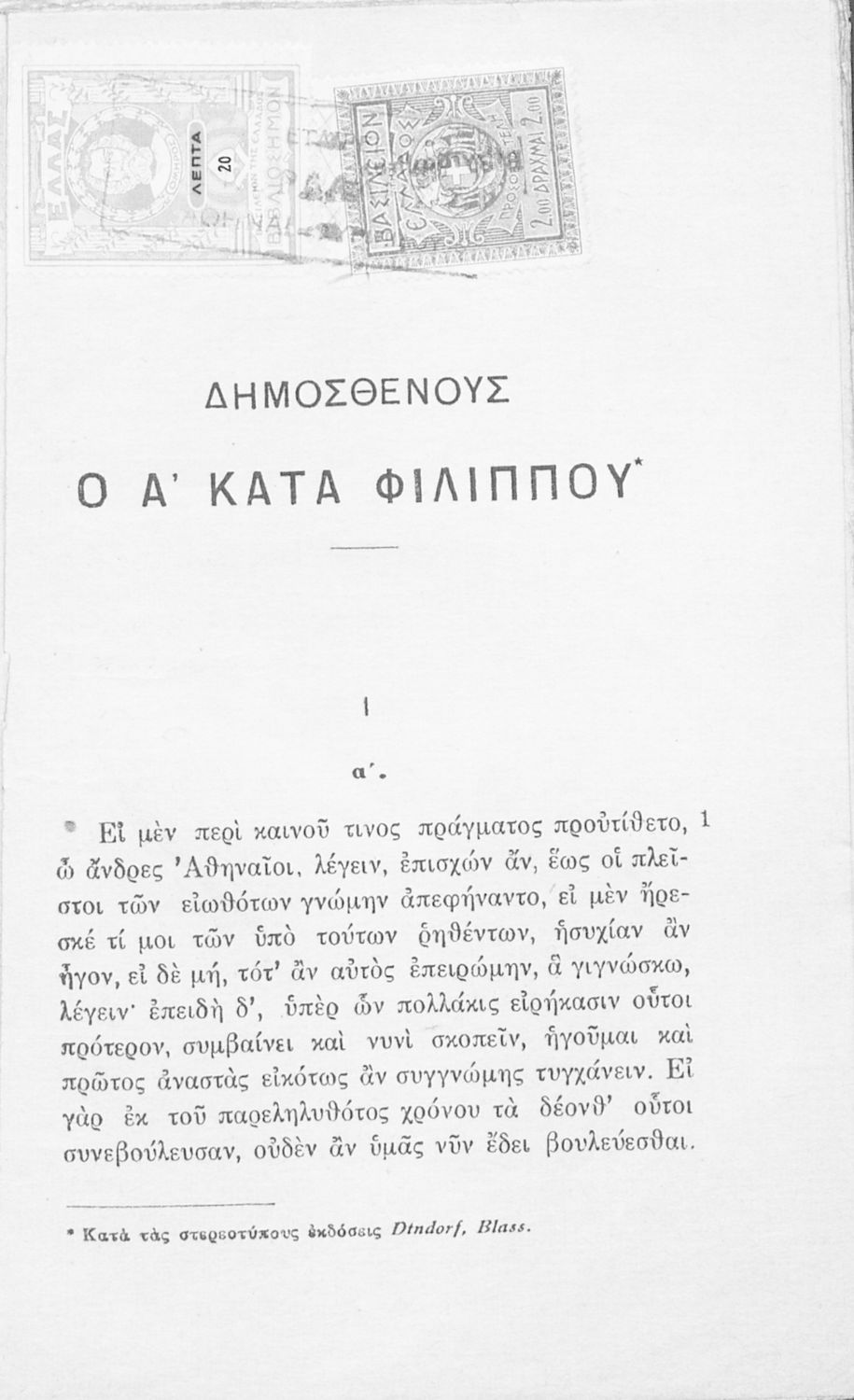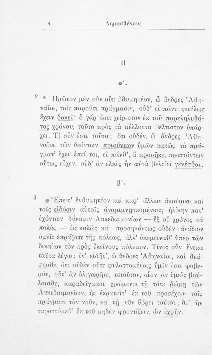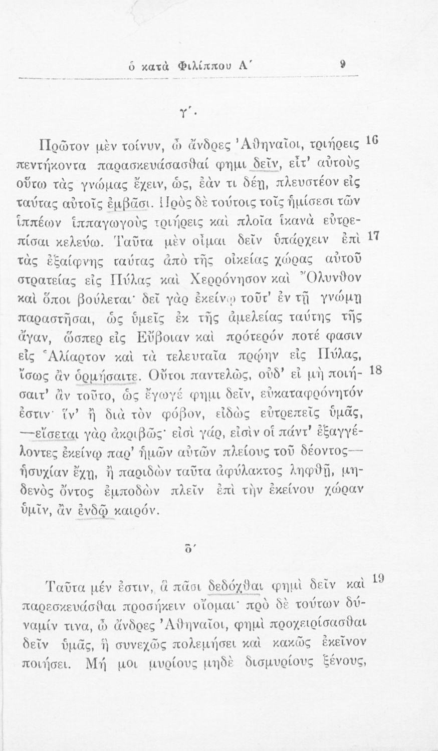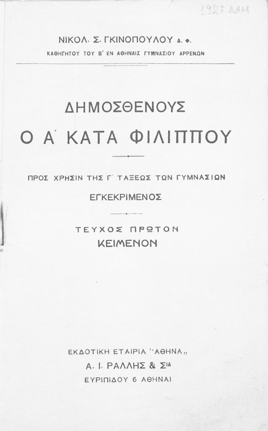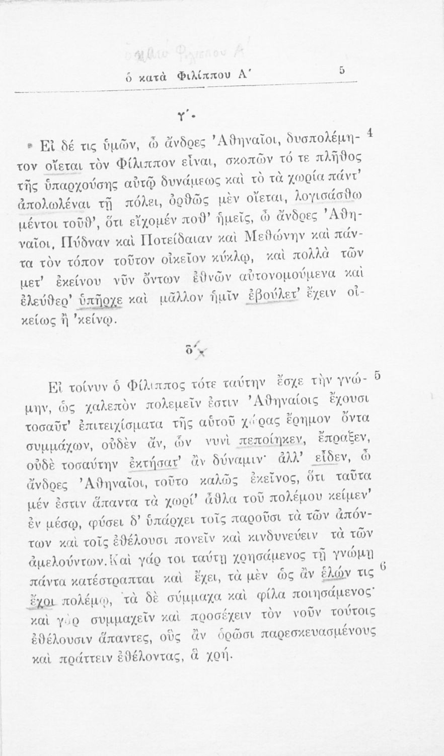 Σχολικό εγχειρίδιο Αρχαίων Ελληνικών Γ' Γυμνασίου που περιέχει το Λόγο του Δημοσθένη Α΄ Κατά Φιλίππου και γλωσσικά και ερμηνευτικά σχόλια.