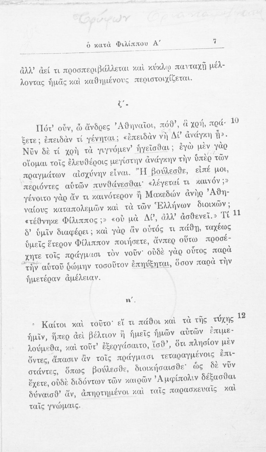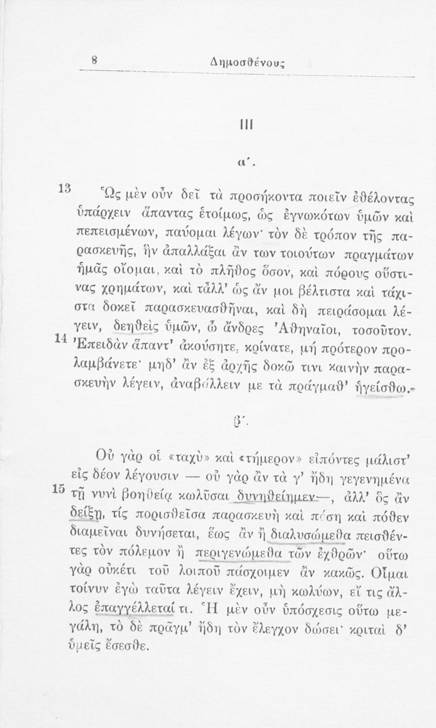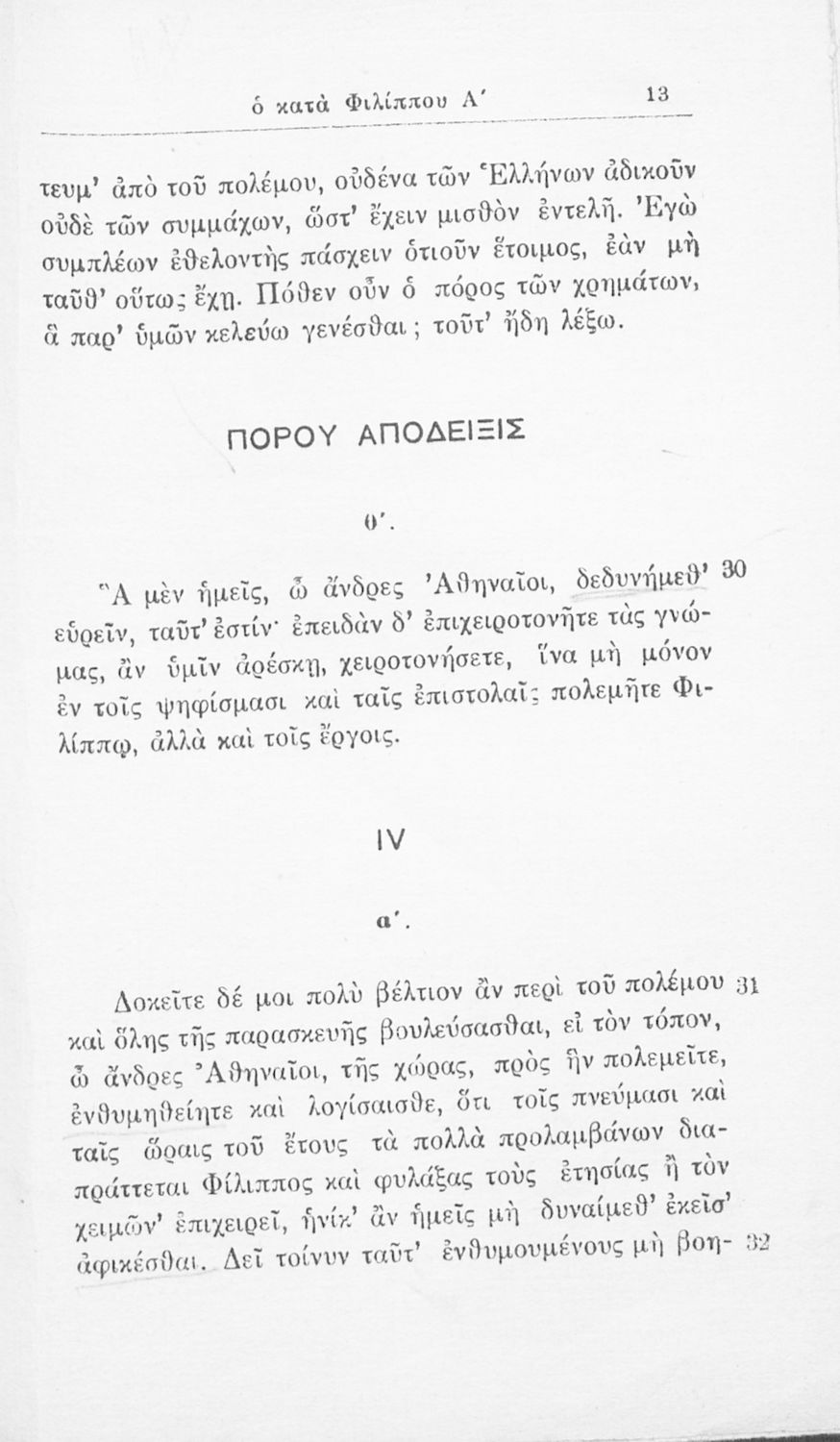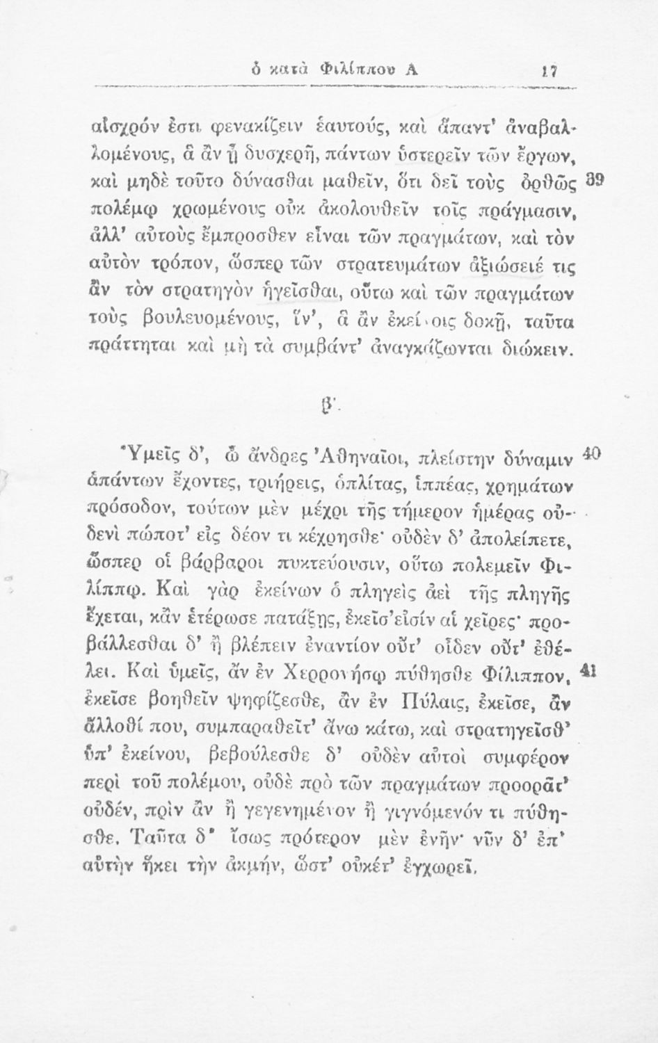 Σχολικό εγχειρίδιο Αρχαίων Ελληνικών Γ' Γυμνασίου που περιέχει το Λόγο του Δημοσθένη Α΄ Κατά Φιλίππου και γλωσσικά και ερμηνευτικά σχόλια.