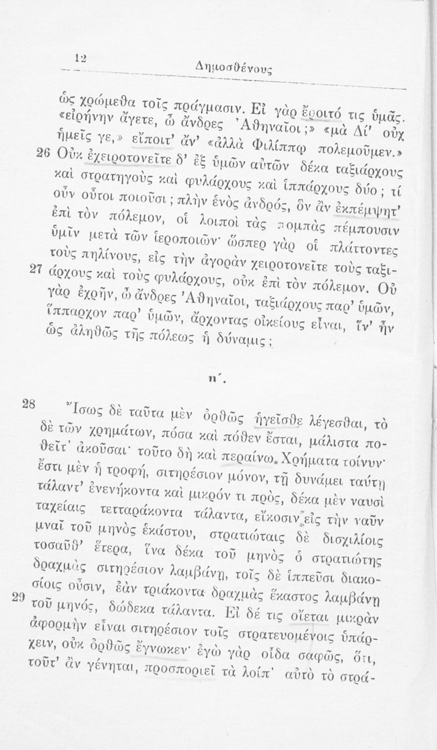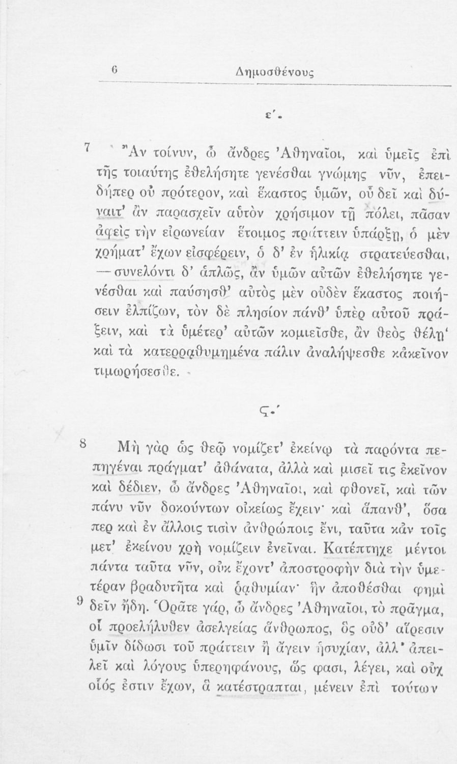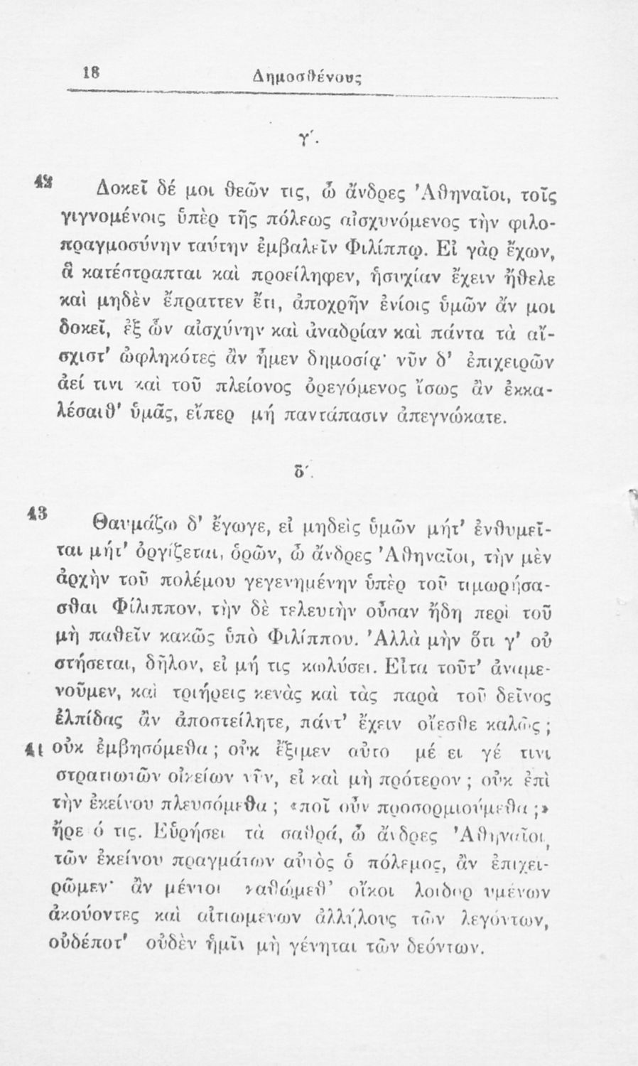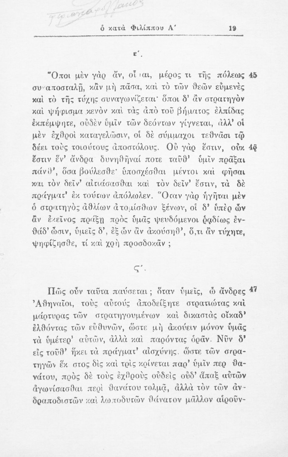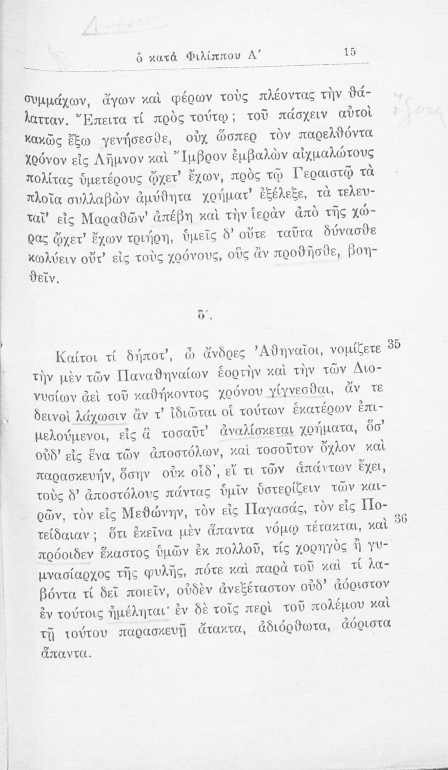 Σχολικό εγχειρίδιο Αρχαίων Ελληνικών Γ' Γυμνασίου που περιέχει το Λόγο του Δημοσθένη Α΄ Κατά Φιλίππου και γλωσσικά και ερμηνευτικά σχόλια.