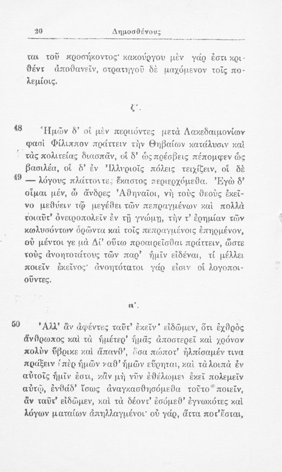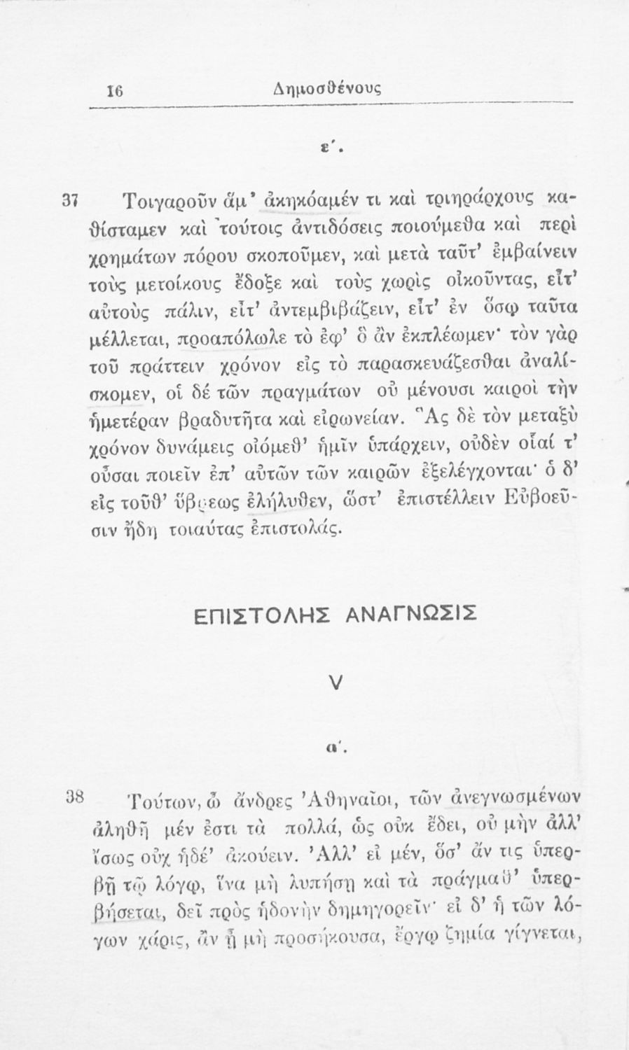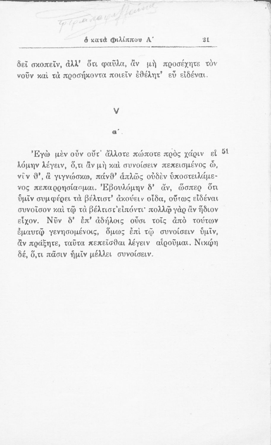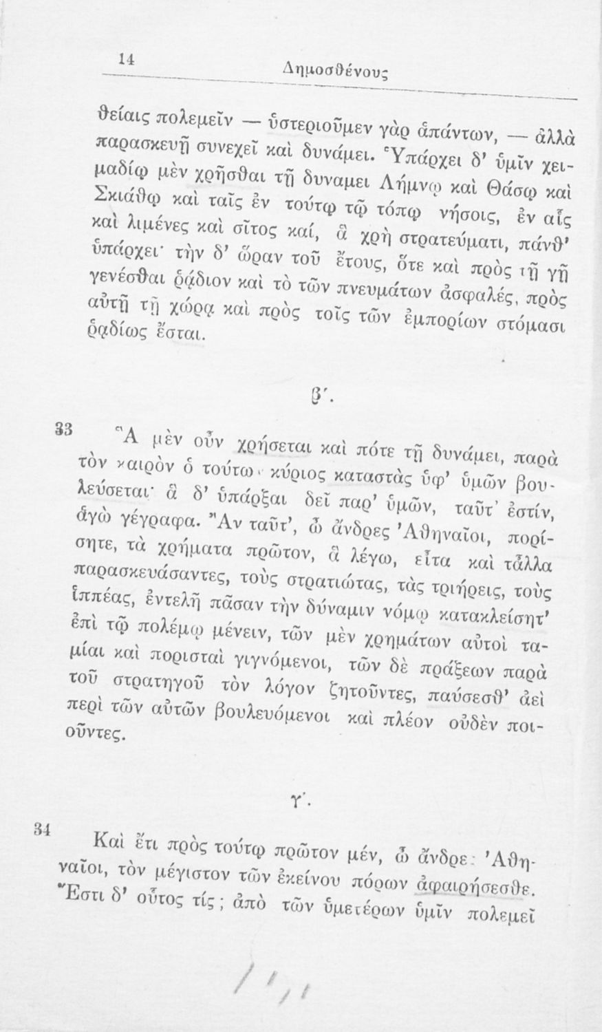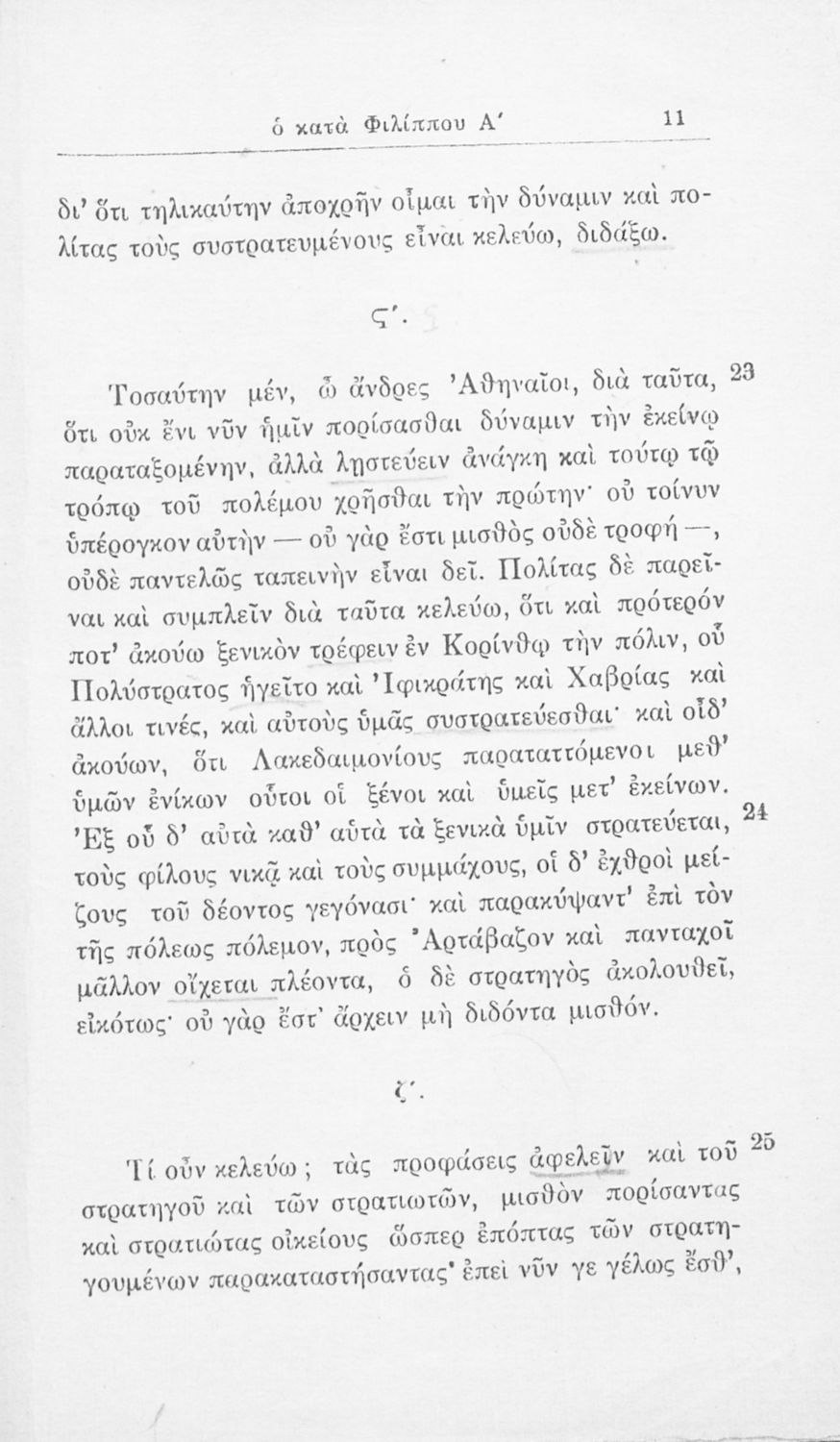 Σχολικό εγχειρίδιο Αρχαίων Ελληνικών Γ' Γυμνασίου που περιέχει το Λόγο του Δημοσθένη Α΄ Κατά Φιλίππου και γλωσσικά και ερμηνευτικά σχόλια.