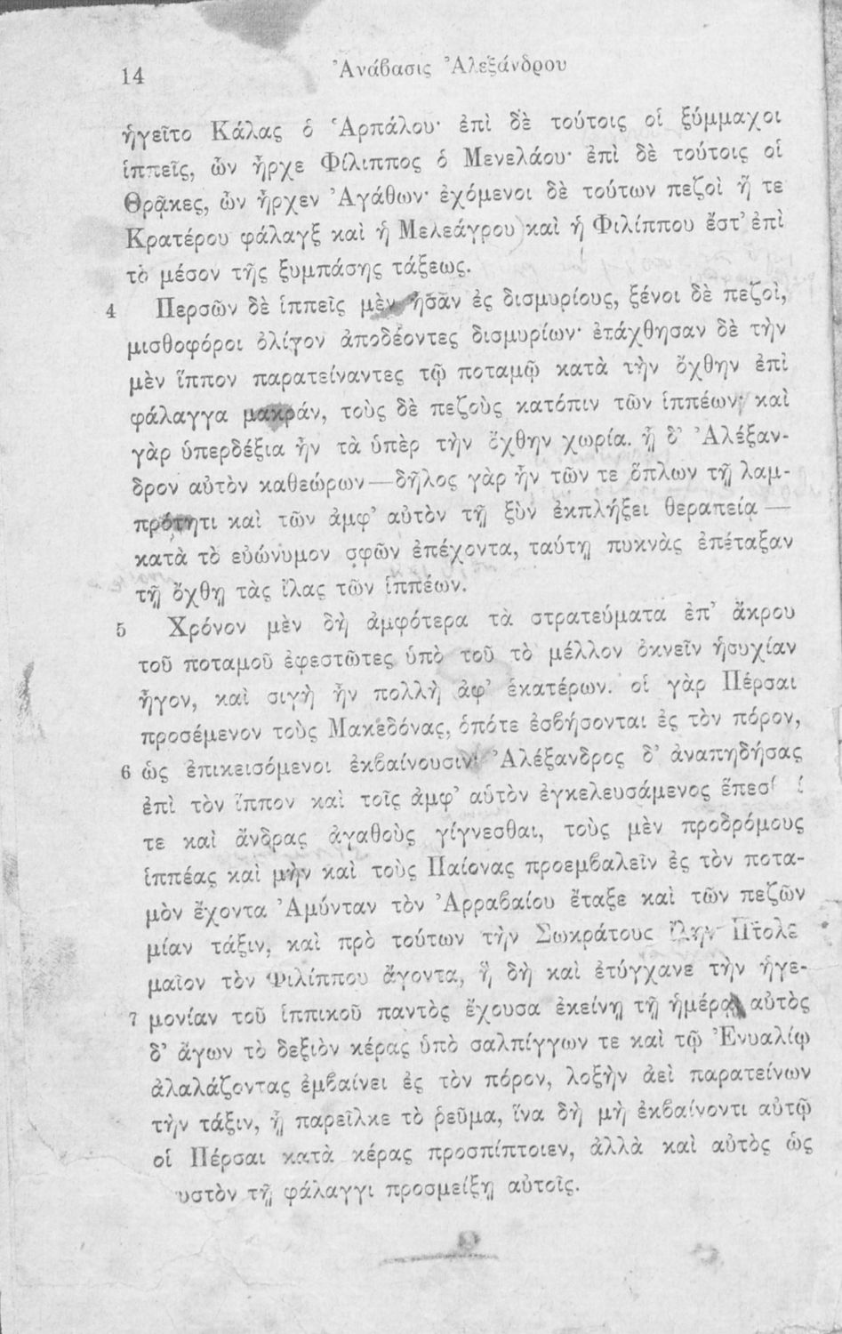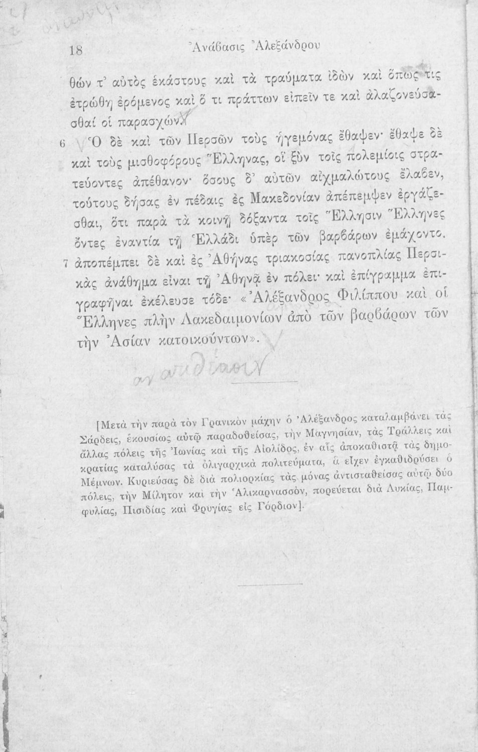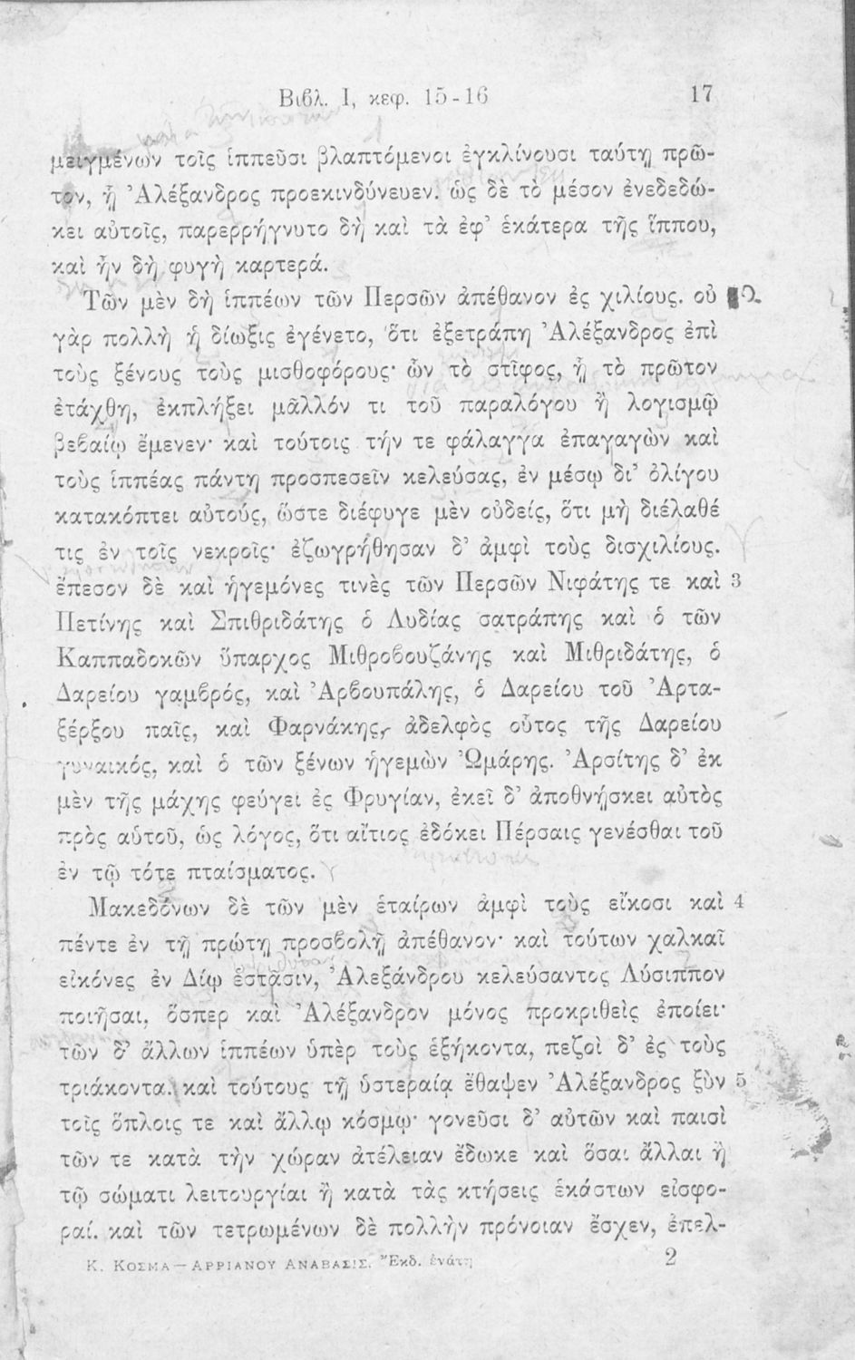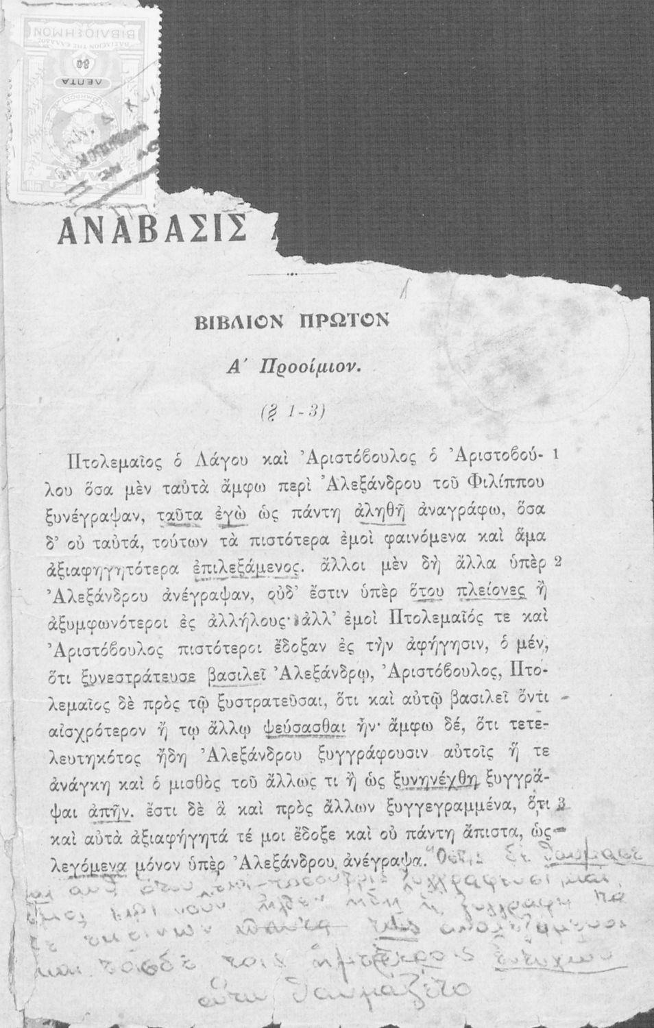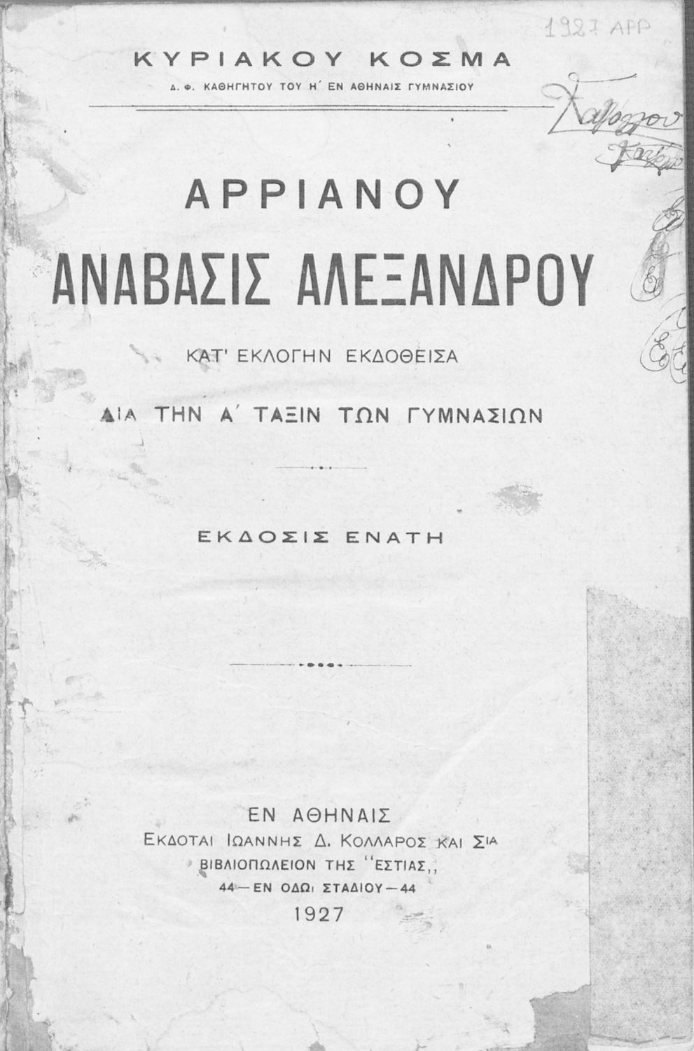 Σχολικό εγχειρίδιο Αρχαίων Ελληνικών Α΄ Γυμνασίου που περιλαμβάνει αποσπάσματα από την Ανάβαση του Αλέξανδρου του Αρριανού, εισαγωγή στη ζωή και το έργο του και ερμηνευτικές παρατηρήσεις.