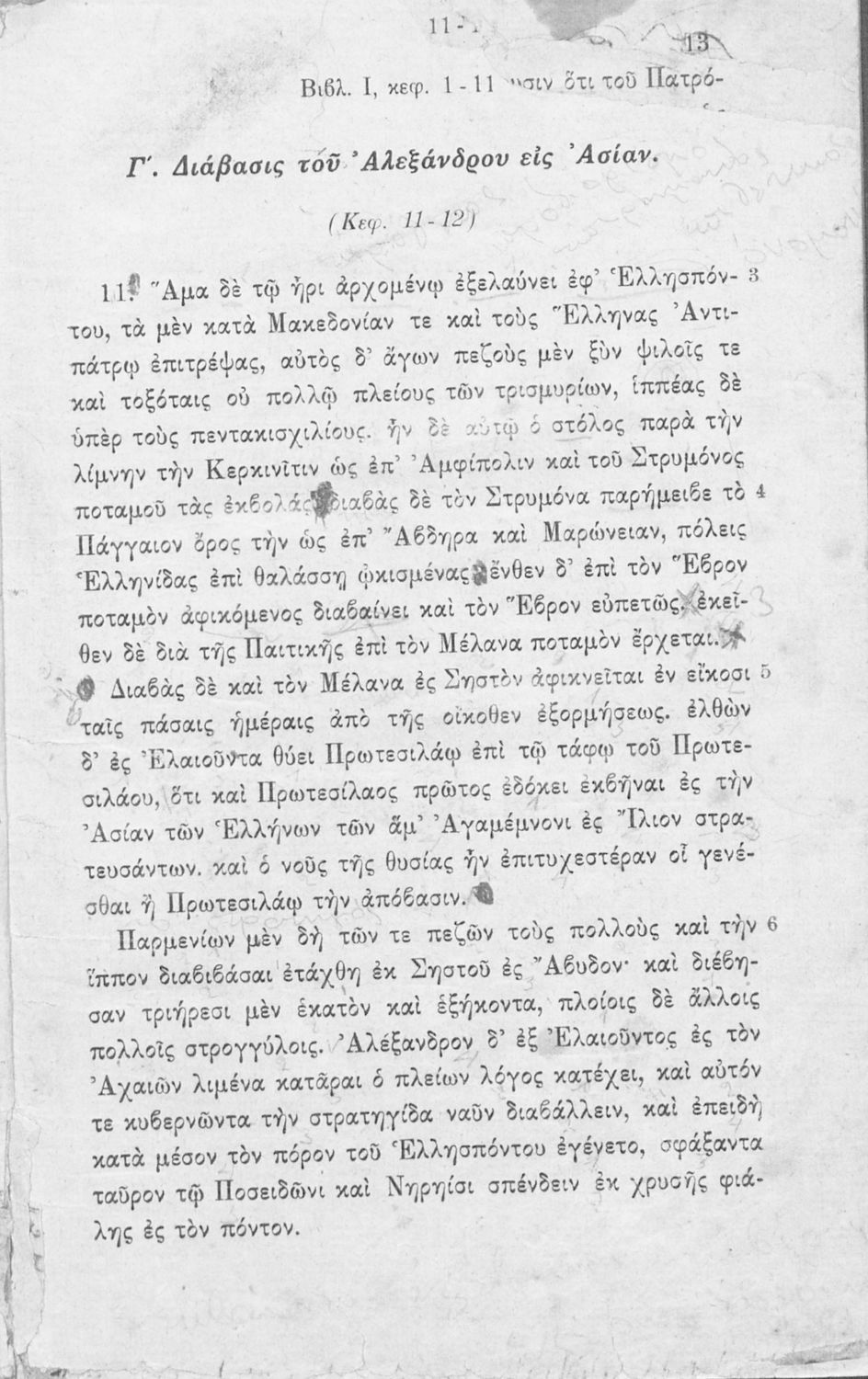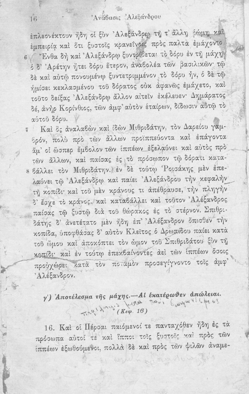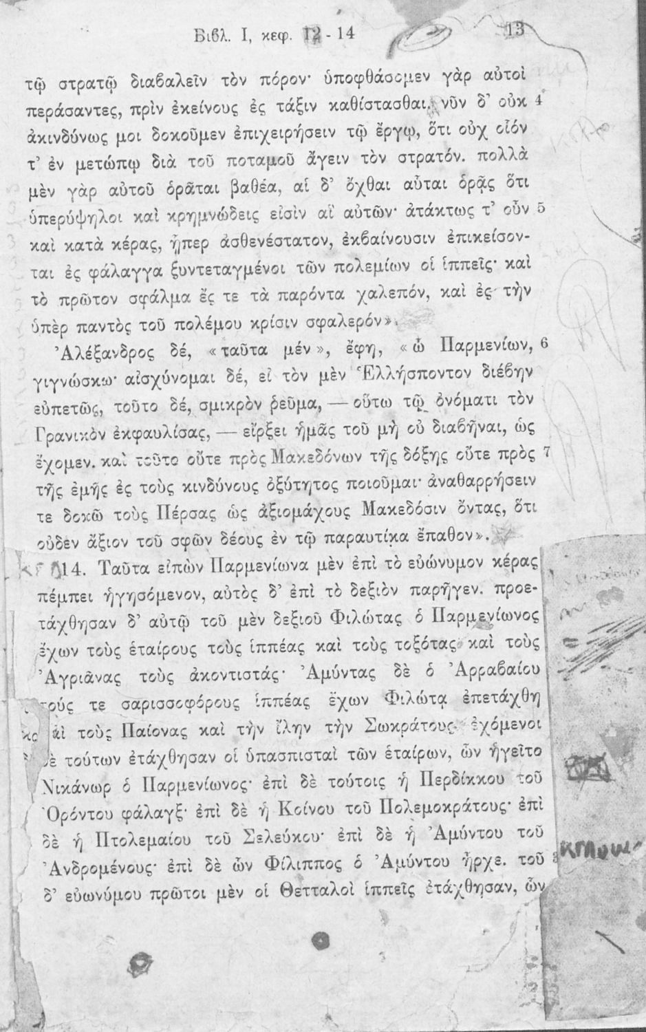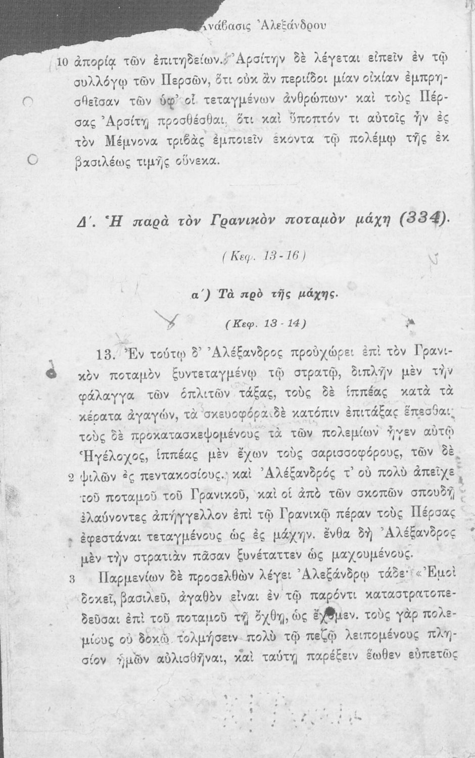 Σχολικό εγχειρίδιο Αρχαίων Ελληνικών Α΄ Γυμνασίου που περιλαμβάνει αποσπάσματα από την Ανάβαση του Αλέξανδρου του Αρριανού, εισαγωγή στη ζωή και το έργο του και ερμηνευτικές παρατηρήσεις.