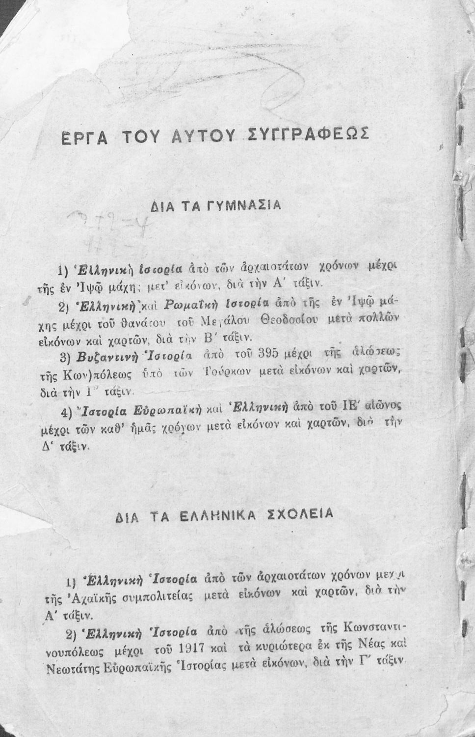 Τίτλος: Ελληνική ιστορία από της αχαϊκής συμπολιτείας μέχρι της αλώσεως της Κωνσταντινουπόλεως υπό των Φράγκων δια την Β΄ τάξιν των Ελληνικών Σχολείων και την αντιστοίχον των λοιπών σχολείων της Μέσης Εκπαιδεύσεως