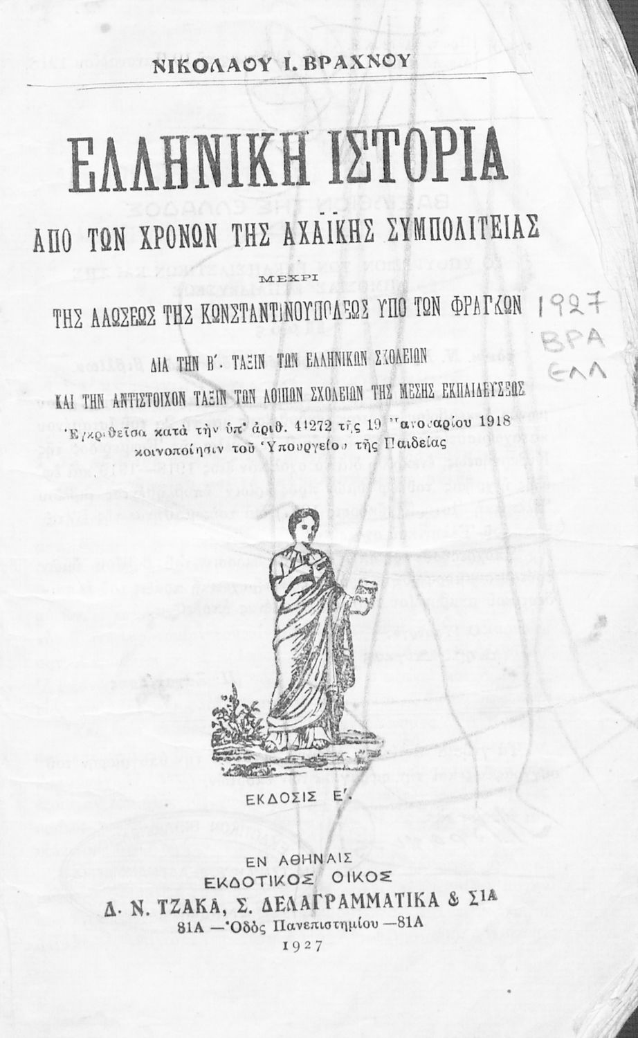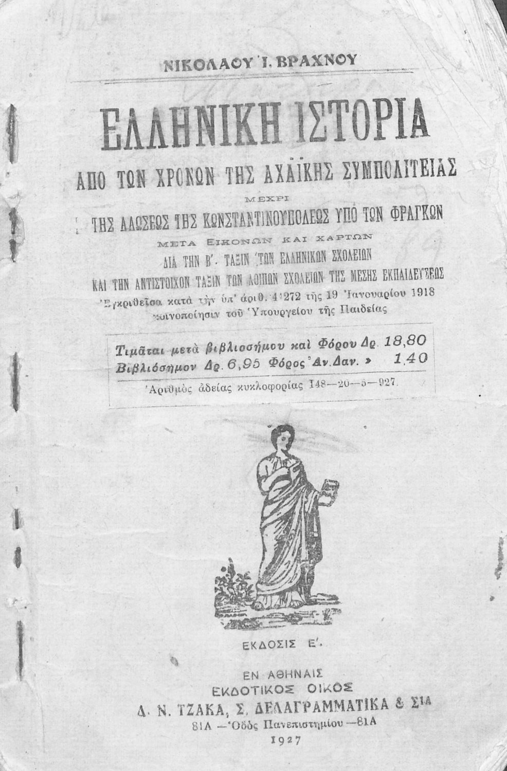 Κωδικός αναγνώρισης: 02-01676 Τίτλος: Ελληνική ιστορία από της αχαϊκής συμπολιτείας μέχρι της αλώσεως της Κωνσταντινουπόλεως υπό των Φράγκων δια την Β΄ τάξιν των Ελληνικών Σχολείων και την αντιστοίχον των λοιπών σχολείων της Μέσης Εκπαιδεύσεως Συγγραφέας: Νικόλαος Ι. Βραχνός Μέγεθος και υπόστρωμα: Σχολικό εγχειρίδιο, μαλακό εξώφυλλο, 148 σελίδες. Εικόνες (ασπρόμαυρες), σκίτσα (ασπρόμαυρα), χάρτες (ασπρόμαυροι). |
