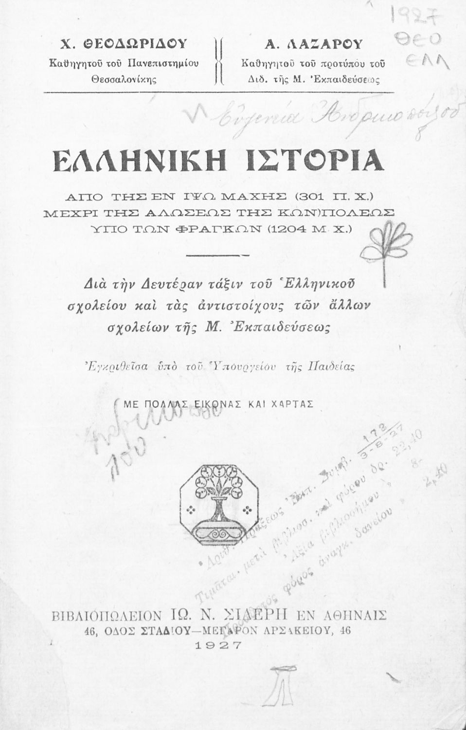 Τίτλος: Ελληνική ιστορία από της εν Ιψώ μάχης (301 π.Χ.) μέχρι της αλώσεως της Κων/πόλεως υπό των Φράγκων (1204 μ.Χ.) δια την Δευτέραν τάξιν του Ελληνικού Σχολείου και τας αντιστοίχους των άλλων σχολείων της Μέσης Εκπαιδεύσεως