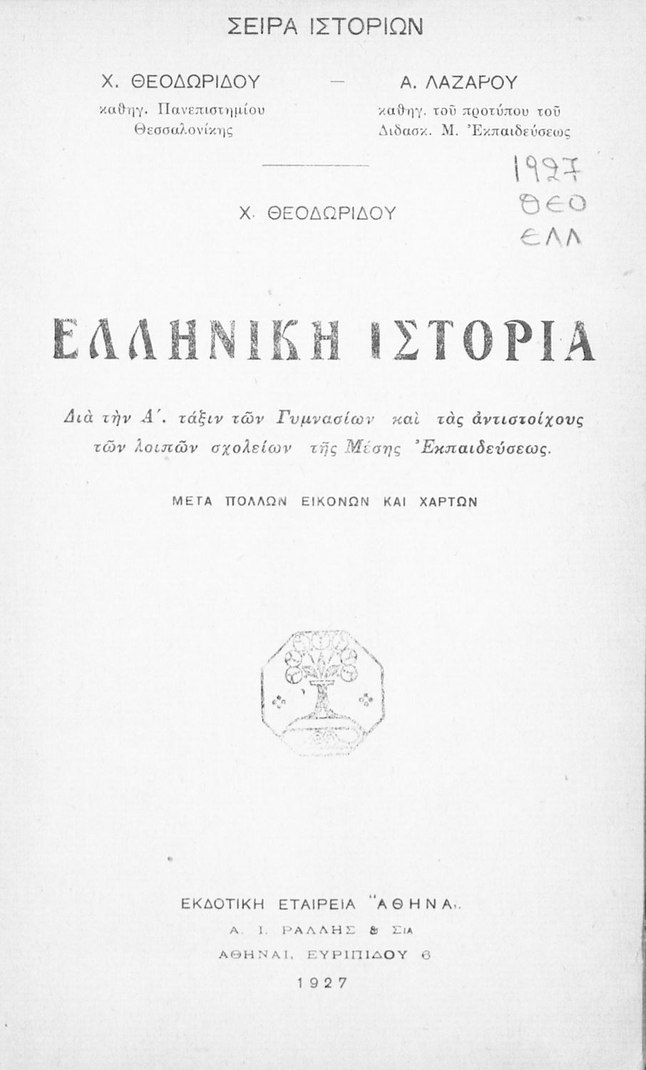 Τίτλος: Ελληνική ιστορία δια την Α΄ τάξιν των Γυμνασίων και τας αντιστοίχους των λοιπών σχολείων της Μέσης Εκπαιδεύσεως