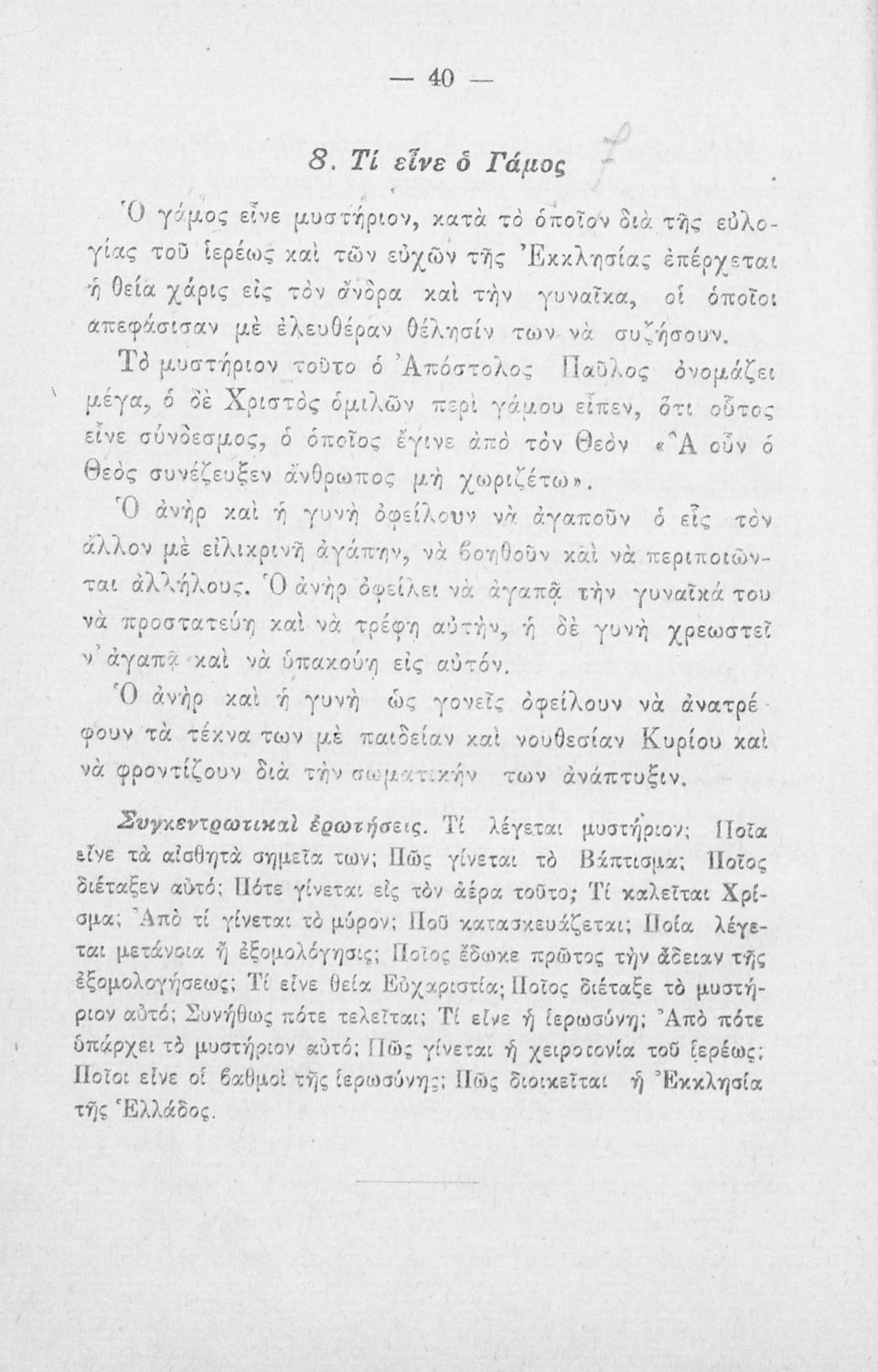 520 ## _aΣχολικό εγχειρίδιο Θρησκευτικών που πραγματεύεται ζητήματα της ορθόδοξης κατήχησης όπως τα μυστήρια και οι Δέκα Εντολές. Περιέχει και ερωτήσεις.