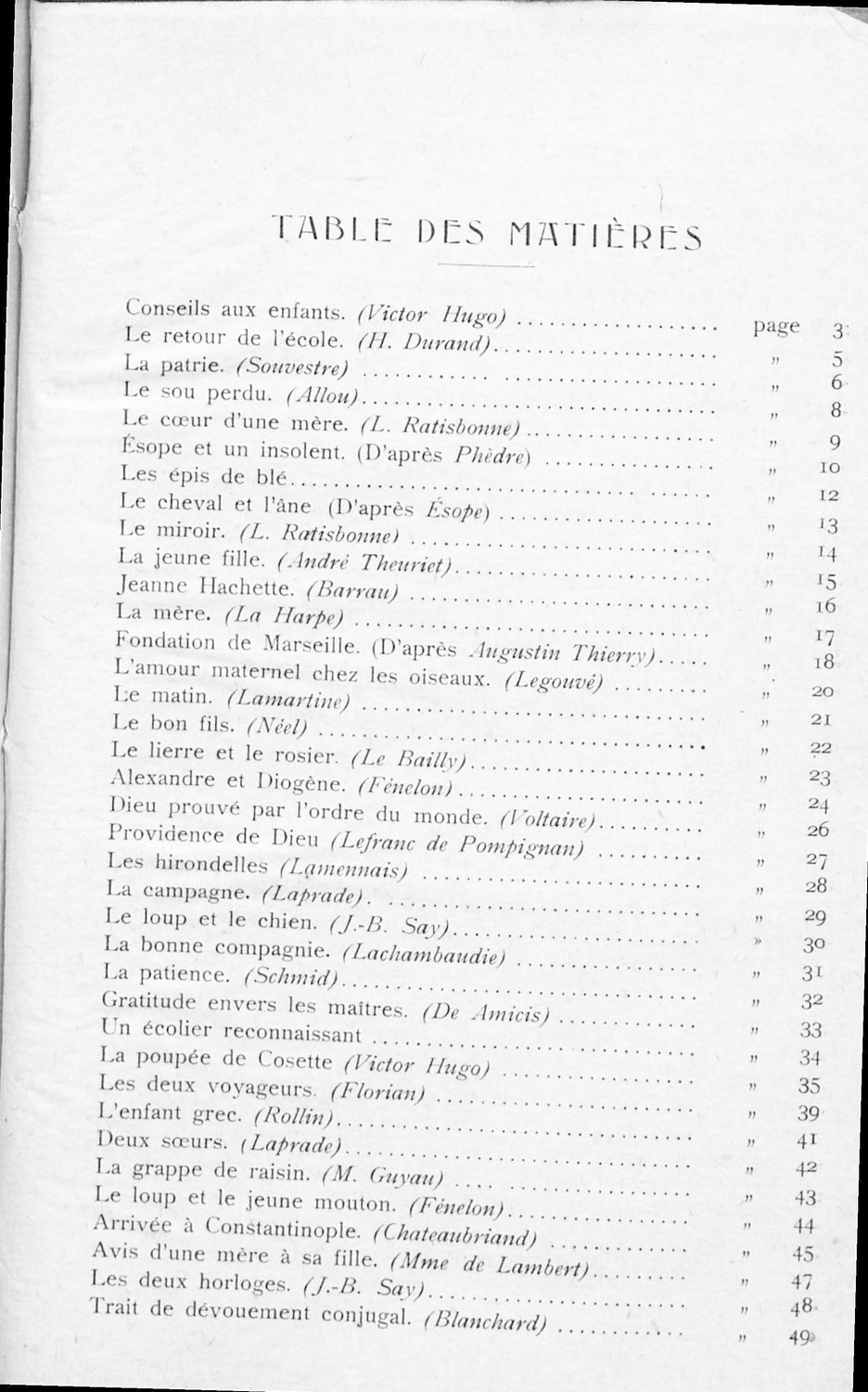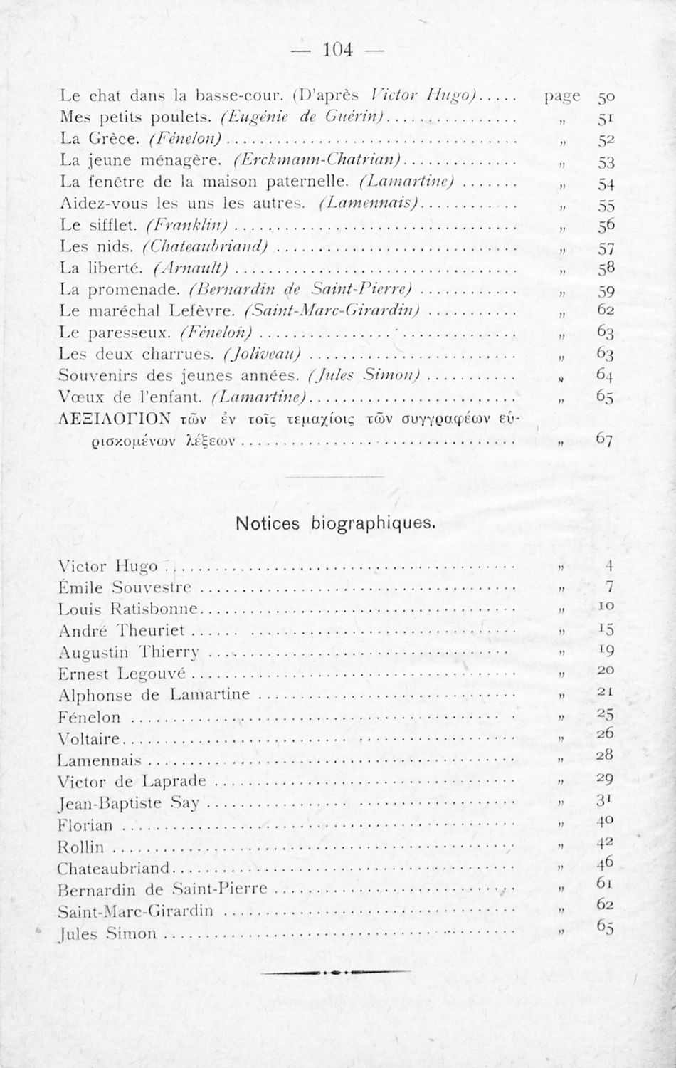 Σχολικό εγχειρίδιο Γαλλικής γλώσσας των τάξεων της Γ΄ Γυμνάσιου, Β΄ Διδασκαλείου Θηλέων και Α' Διδασκαλείου Αρρένων που περιέχει σειρά ποιημάτων και πεζών Γάλλων συγγραφέων, σύντομα βιογραφικά σημειώματα, ...