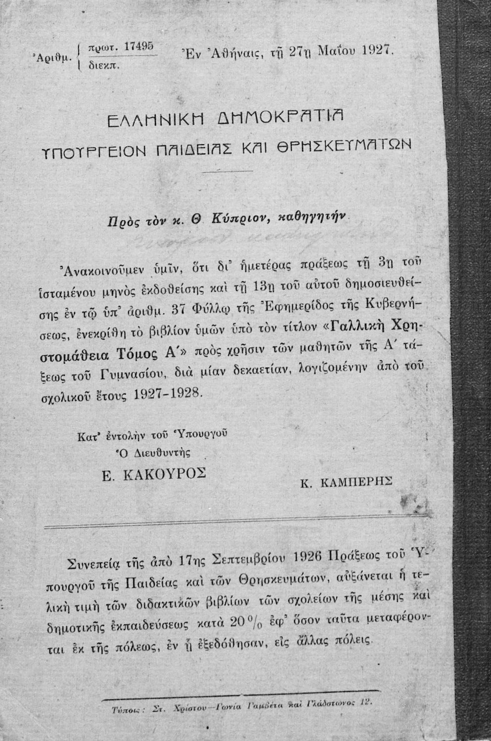 Τίτλος: Γαλλική χρηστομάθεια, Τόμος Α΄, διά την Α΄ τάξιν των Γυμνασίων, την αντίστοιχον τάξιν των λοιπών σχολείων της Μέσης Εκπαιδεύσεως και την Γ΄ τάξιν των Αστικών σχολείων θηλέων