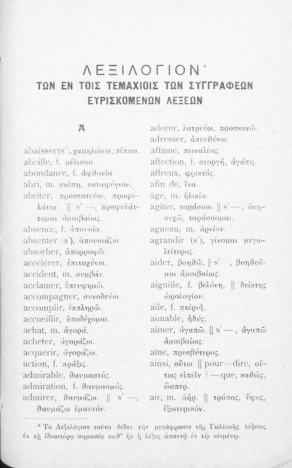 Γραμματική της Γαλλικής γλώσσας για τα Τετρατάξια Γυμνάσια, τη Γ΄ τάξη των Αστικών Σχολείων Θηλέων και τα Διδασκαλεία της Δημοτικής Εκπαίδευσης που περιλαμβάνει θεωρία, ασκήσεις και λεξιλόγιο.