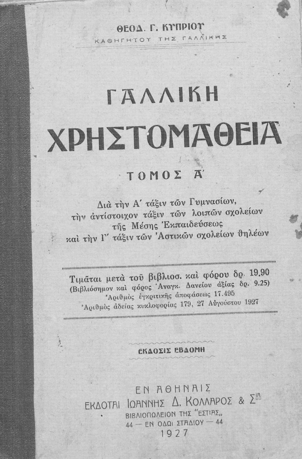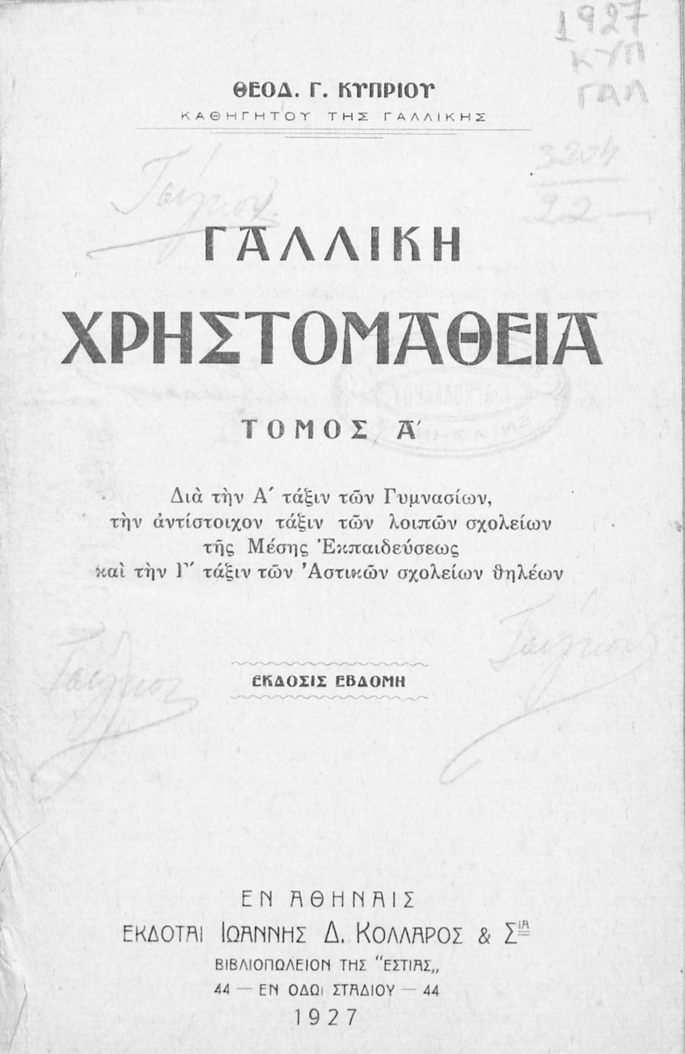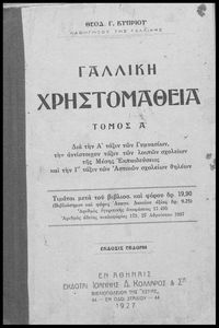 Τίτλος: Γαλλική χρηστομάθεια, Τόμος Α΄, διά την Α΄ τάξιν των Γυμνασίων, την αντίστοιχον τάξιν των λοιπών σχολείων της Μέσης Εκπαιδεύσεως και την Γ΄ τάξιν των Αστικών σχολείων θηλέων