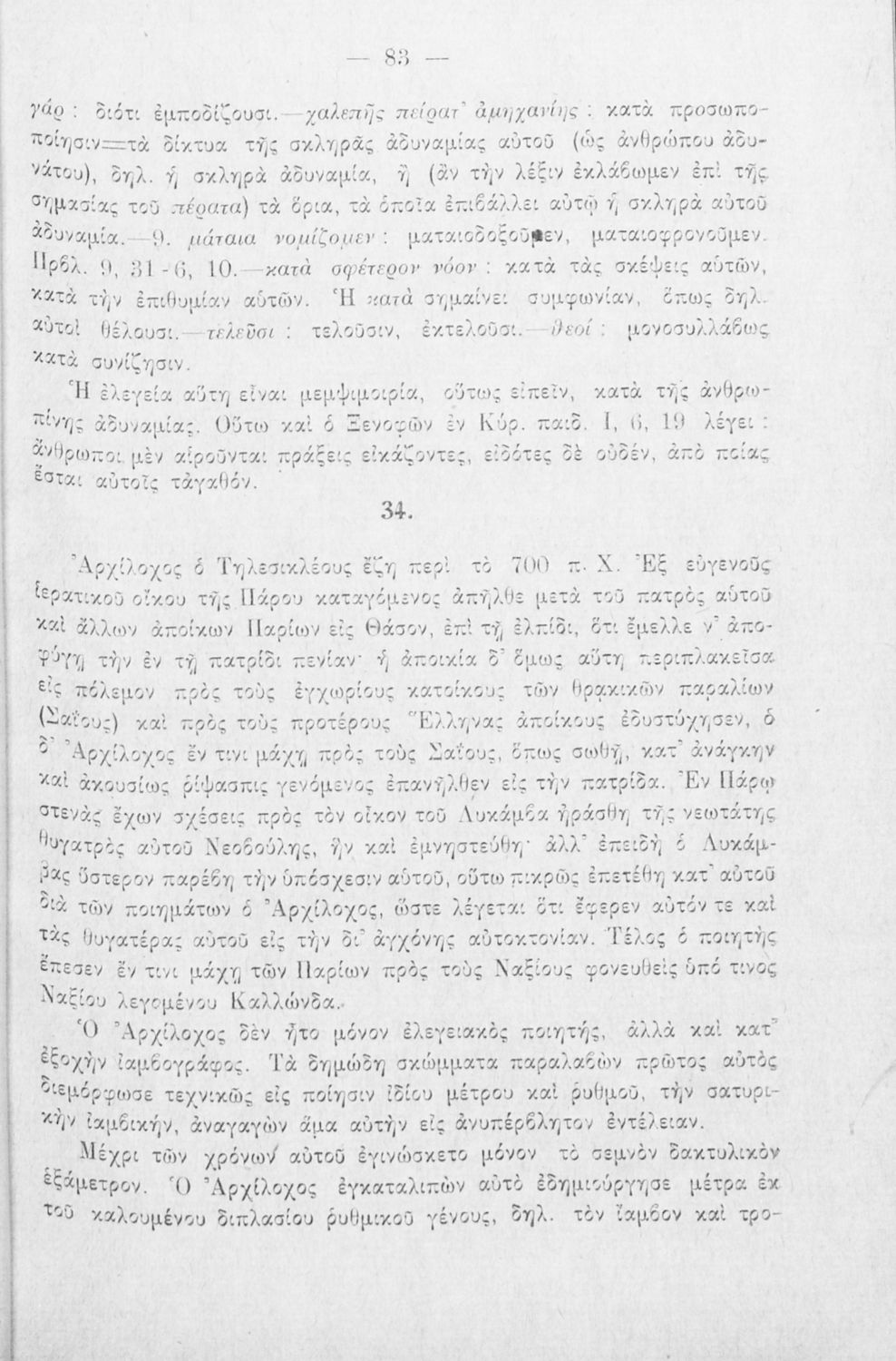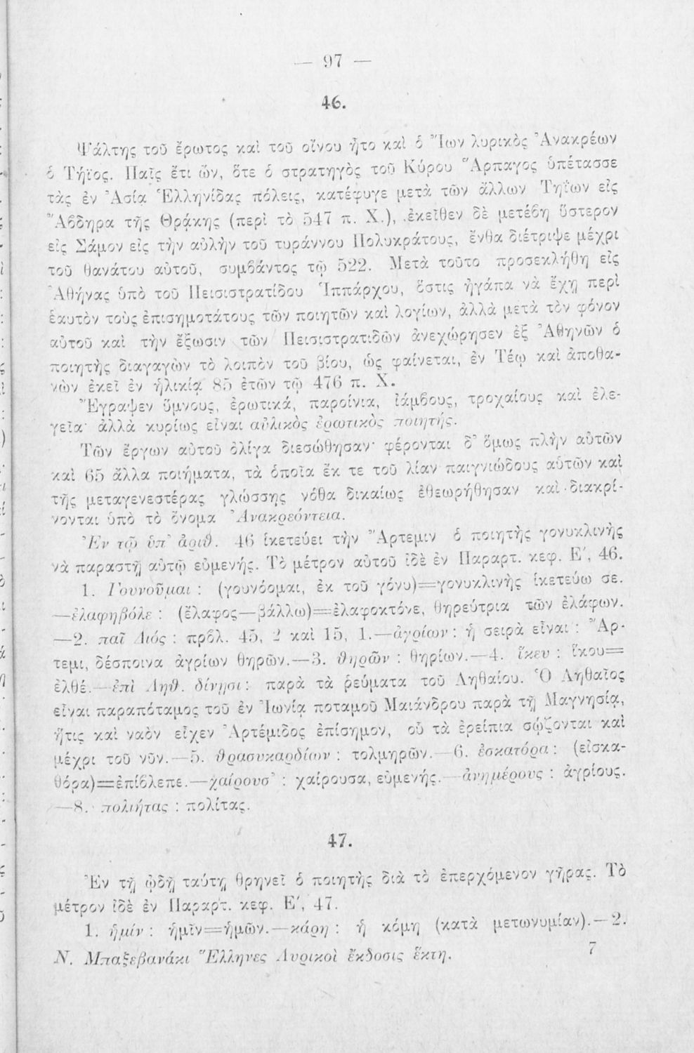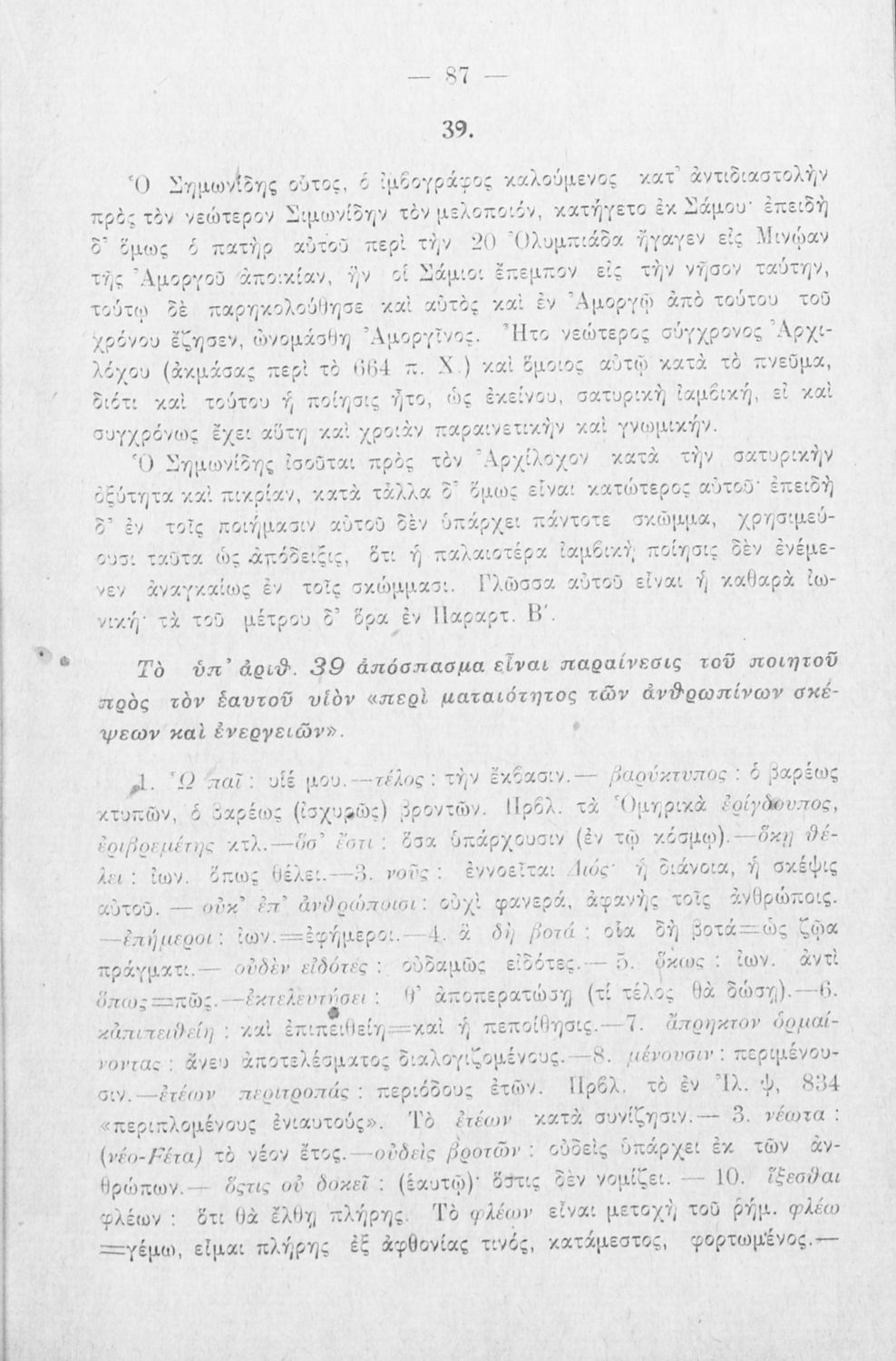Βαθμίδα εκπαίδευσης: Δευτεροβάθμια Τάξη: Γ' Γυμνασίου Μάθημα: Αρχαία Ελληνικά Γλώσσα: Καθαρεύουσα Παρουσίαση περιεχομένου: Σχολικό εγχειρίδιο Αρχαίων Ελληνικών Γ΄ Γυμνασίου που περιλαμβάνει αποσπάσματα έργων αρχαίων Ελλήνων λυρικών, πολιτικές και γνωμικές ελεγείες, ιάμβους και επιγράμματα. Περιέχει και υπόμνημα με ερμηνευτικά, πραγματολογικά, γλωσσικά και γραμματικά σχόλια. |