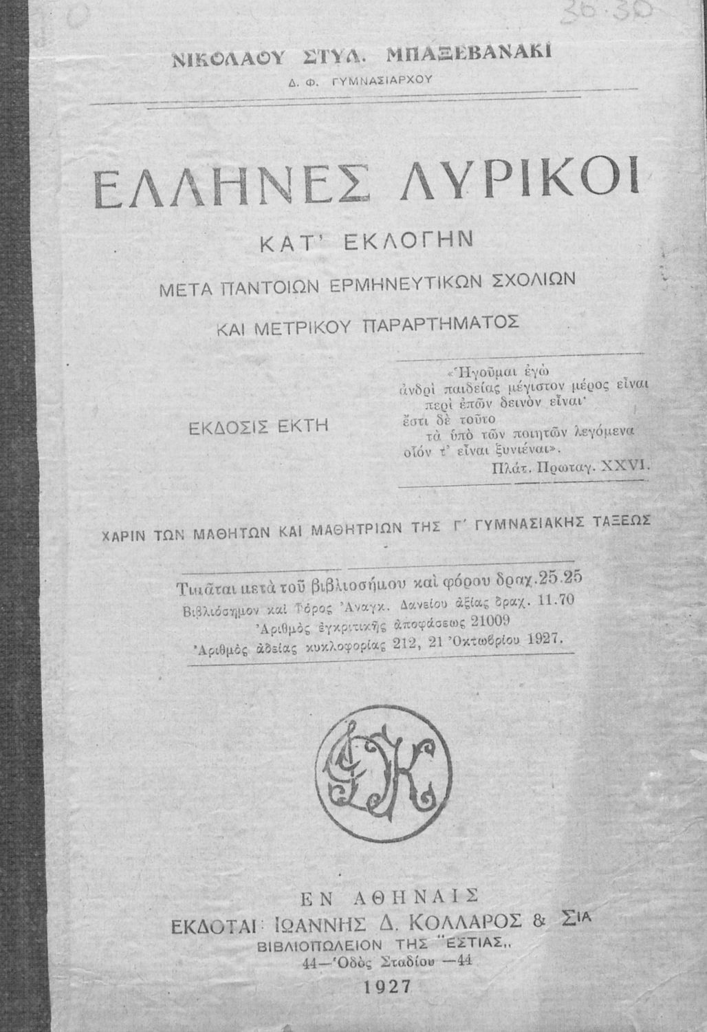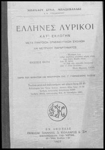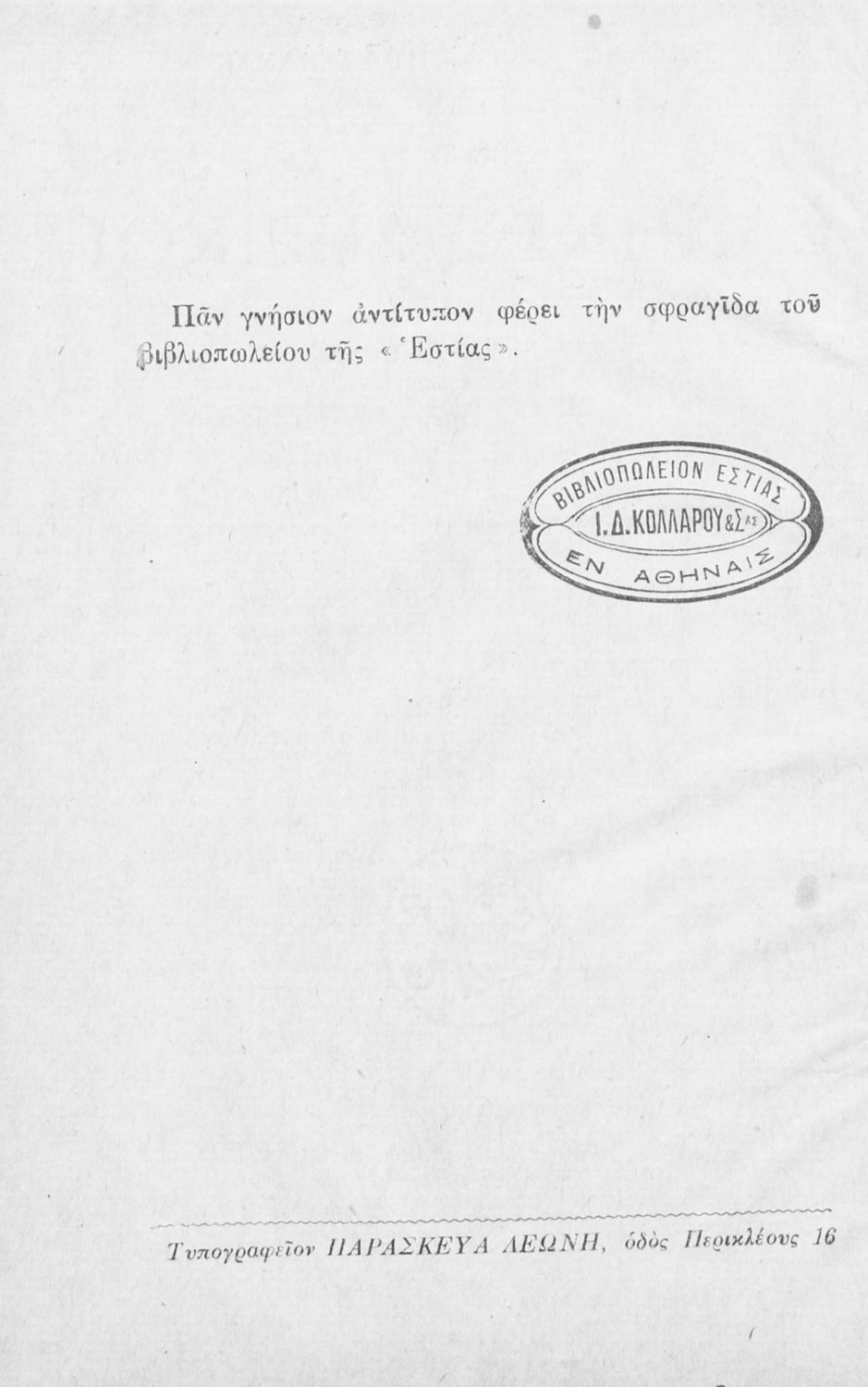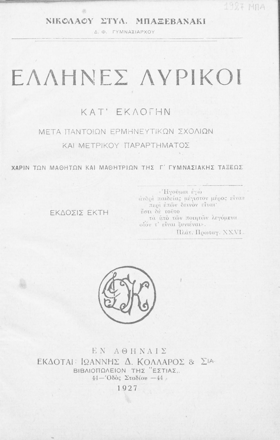 Εντοπισμός πρωτοτύπου: Ελληνικό Λογοτεχνικό και Ιστορικό Αρχείο Κωδικός βιβλιοθήκης: 1927 ΜΠΑ |