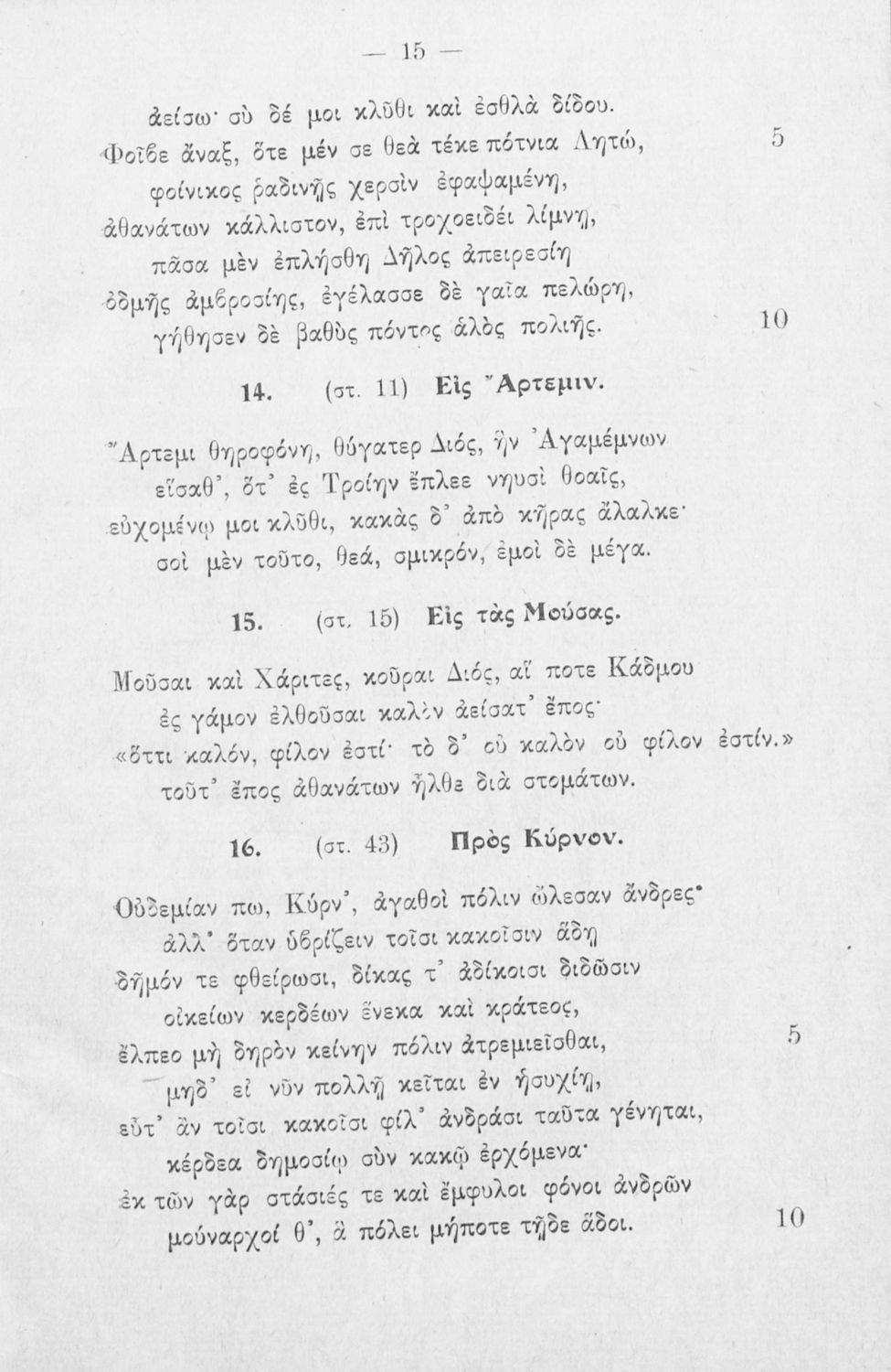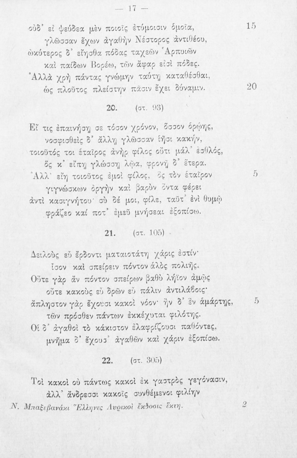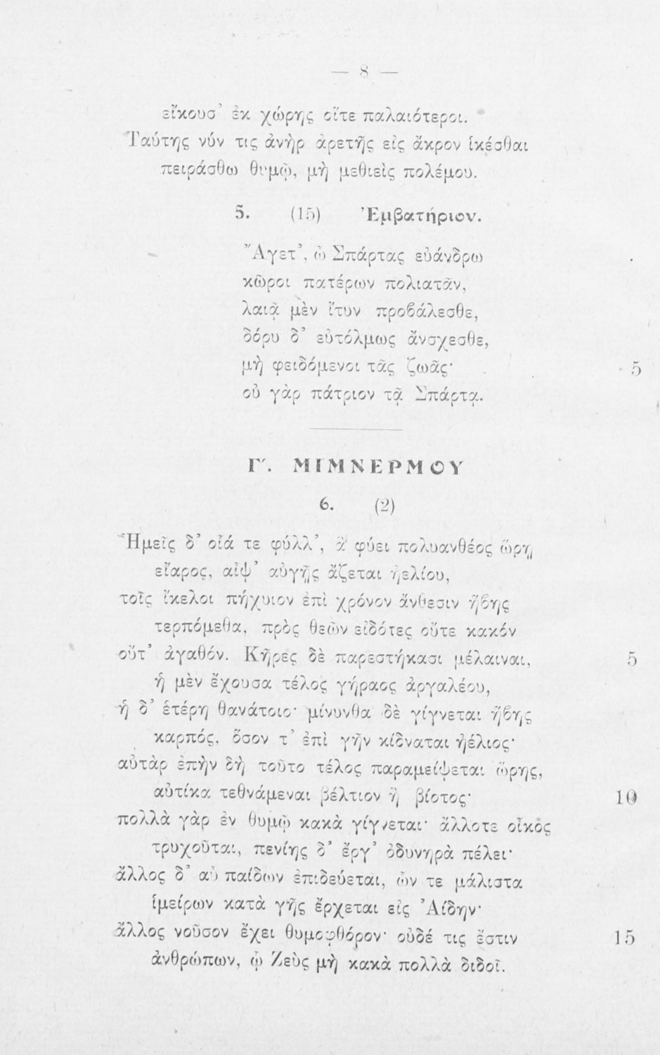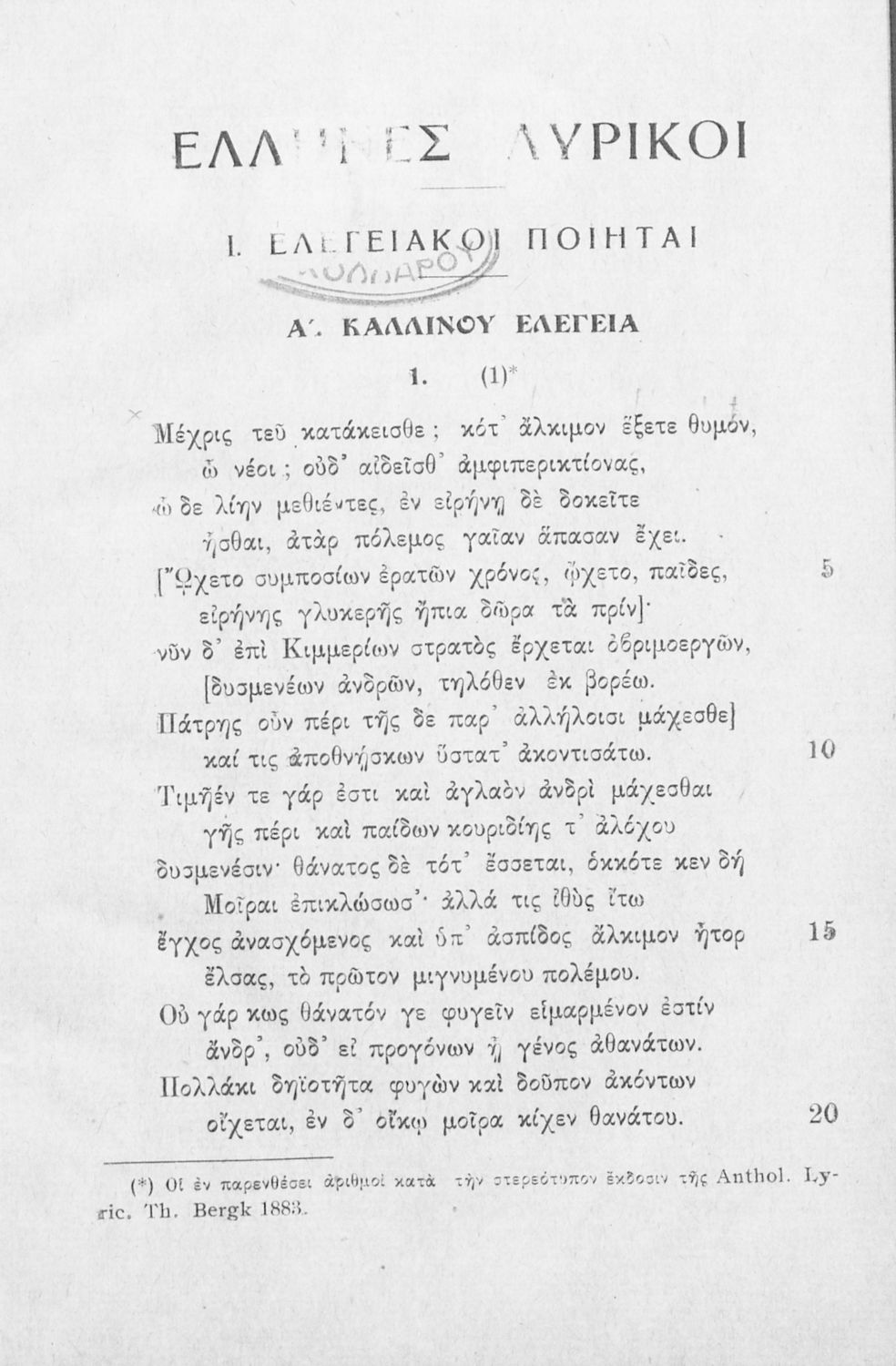 Σχολικό εγχειρίδιο Αρχαίων Ελληνικών Γ΄ Γυμνασίου που περιλαμβάνει αποσπάσματα έργων αρχαίων Ελλήνων λυρικών, πολιτικές και γνωμικές ελεγείες, ιάμβους και επιγράμματα. Περιέχει και υπόμνημα με ερμηνευτικά, πραγματολογικά, γλωσσικά και γραμματικά σχόλια.