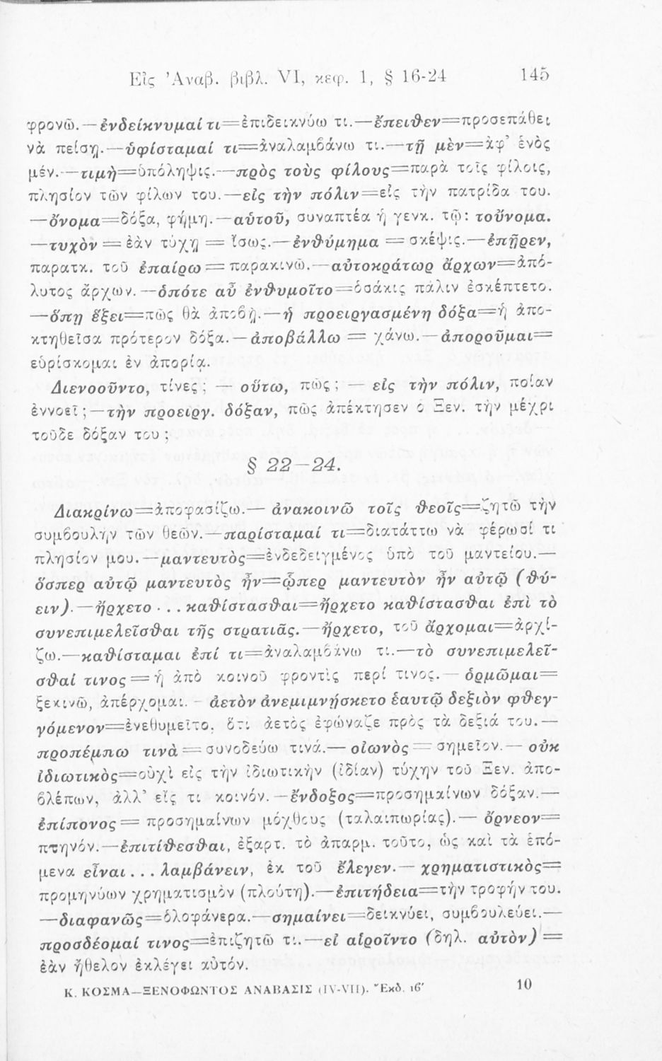 Σχολικό εγχειρίδιο Αρχαίων Ελληνικών για τις Γ΄ Ελληνικών Σχολείων και Α΄ Αστικών Σχολείων Θηλέων που περιλαμβάνει το έργο του Ξενοφώντα Κύρου Ανάβασις, εισαγωγικά σχόλια για τη ζωή και το έργο του, ερμηνευτικές και γραμματικές παρατηρήσεις.