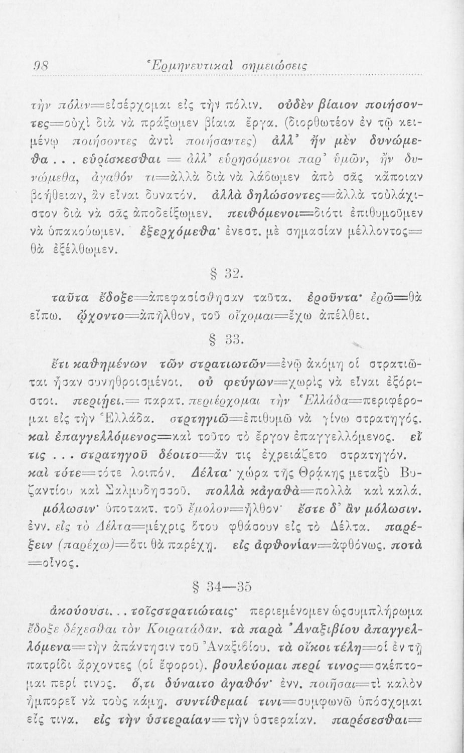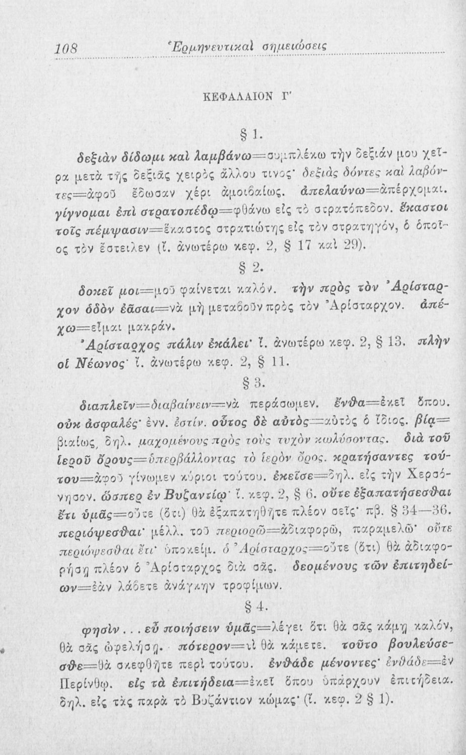 Σχολικό εγχειρίδιο Αρχαίων Ελληνικών Γ' Ελληνικού Σχολείου που περιλαμβάνει γραμματική της αρχαίας ελληνικής, αποσπάσματα από το έργο του Ξενοφώντα Ελληνικά και τα έργα του Λουκιανού Ενύπνιον και Ανάχαρσις, ...
