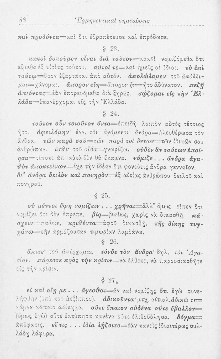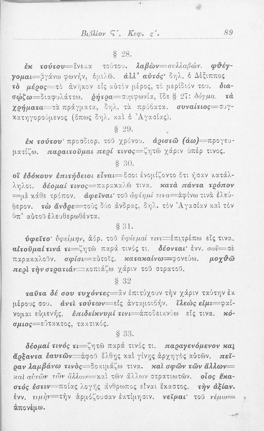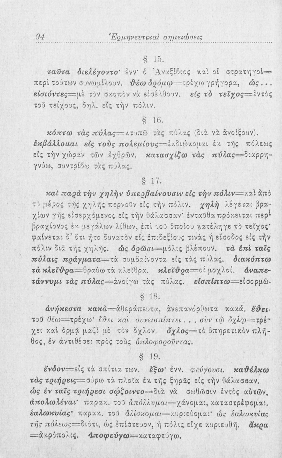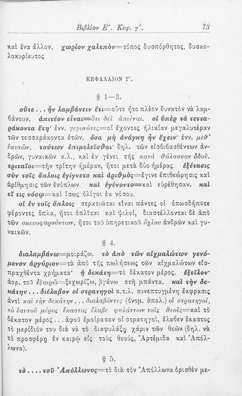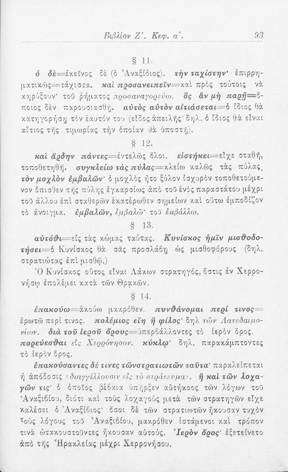 Σχολικό εγχειρίδιο Αρχαίων Ελληνικών Γ' Ελληνικού Σχολείου που περιλαμβάνει γραμματική της αρχαίας ελληνικής, αποσπάσματα από το έργο του Ξενοφώντα Ελληνικά και τα έργα του Λουκιανού Ενύπνιον και Ανάχαρσις, ...