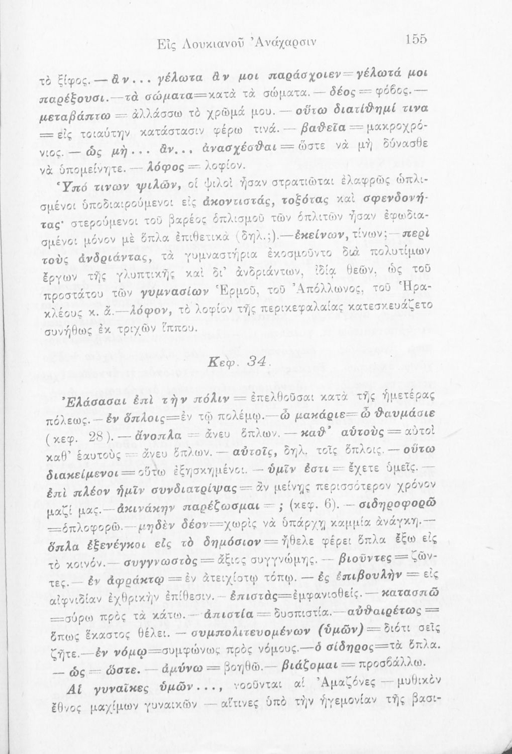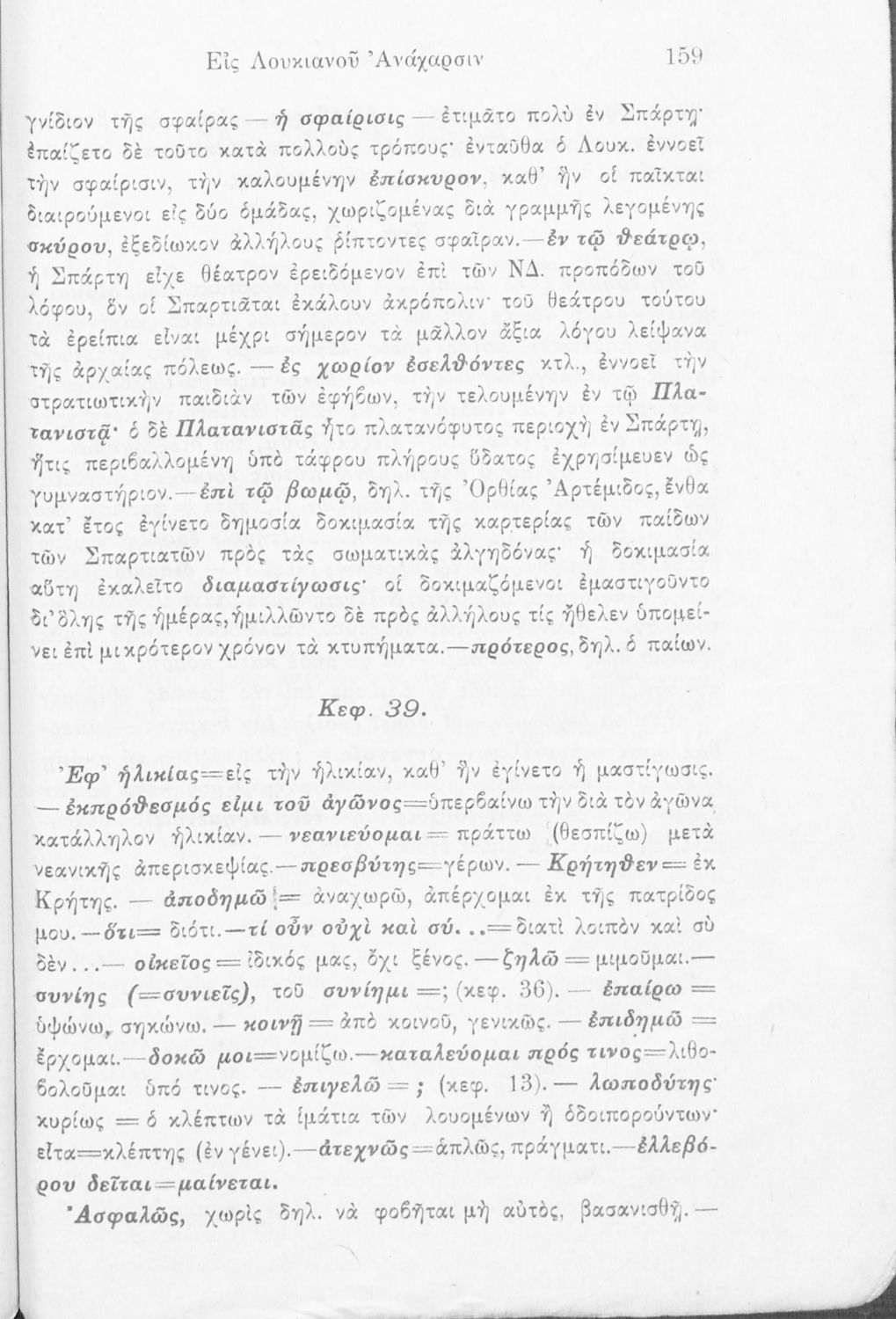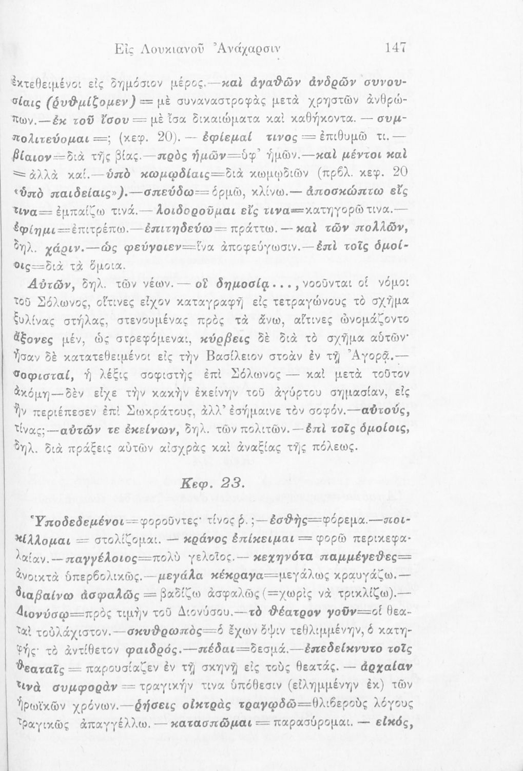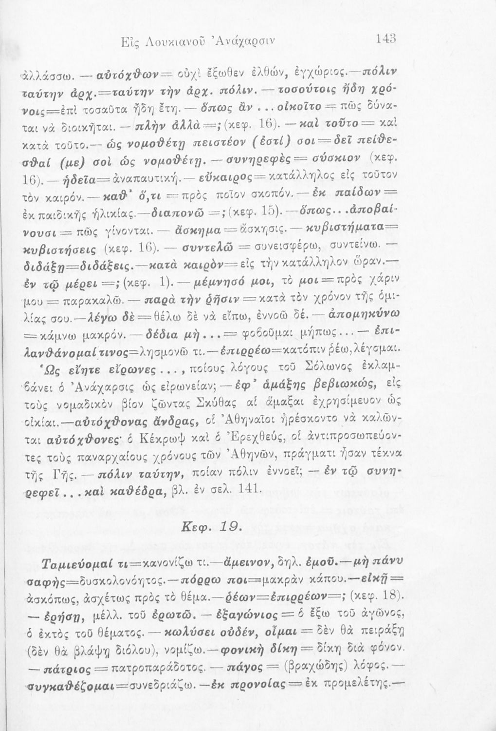 Σχολικό εγχειρίδιο Αρχαίων Ελληνικών Γ΄ Ελληνικού Σχολείου που περιλαμβάνει αποσπάσματα από το έργο του Ξενοφώντα Ελληνικά και τα έργα του Λουκιανού Ενύπνιον και Ανάχαρσις, βιογραφικά σημειώματα των συγγραφέων, ερμηνευτικές και πραγματολογικές σημειώσεις και πίνακα των κυριοτέρων ονομάτων.